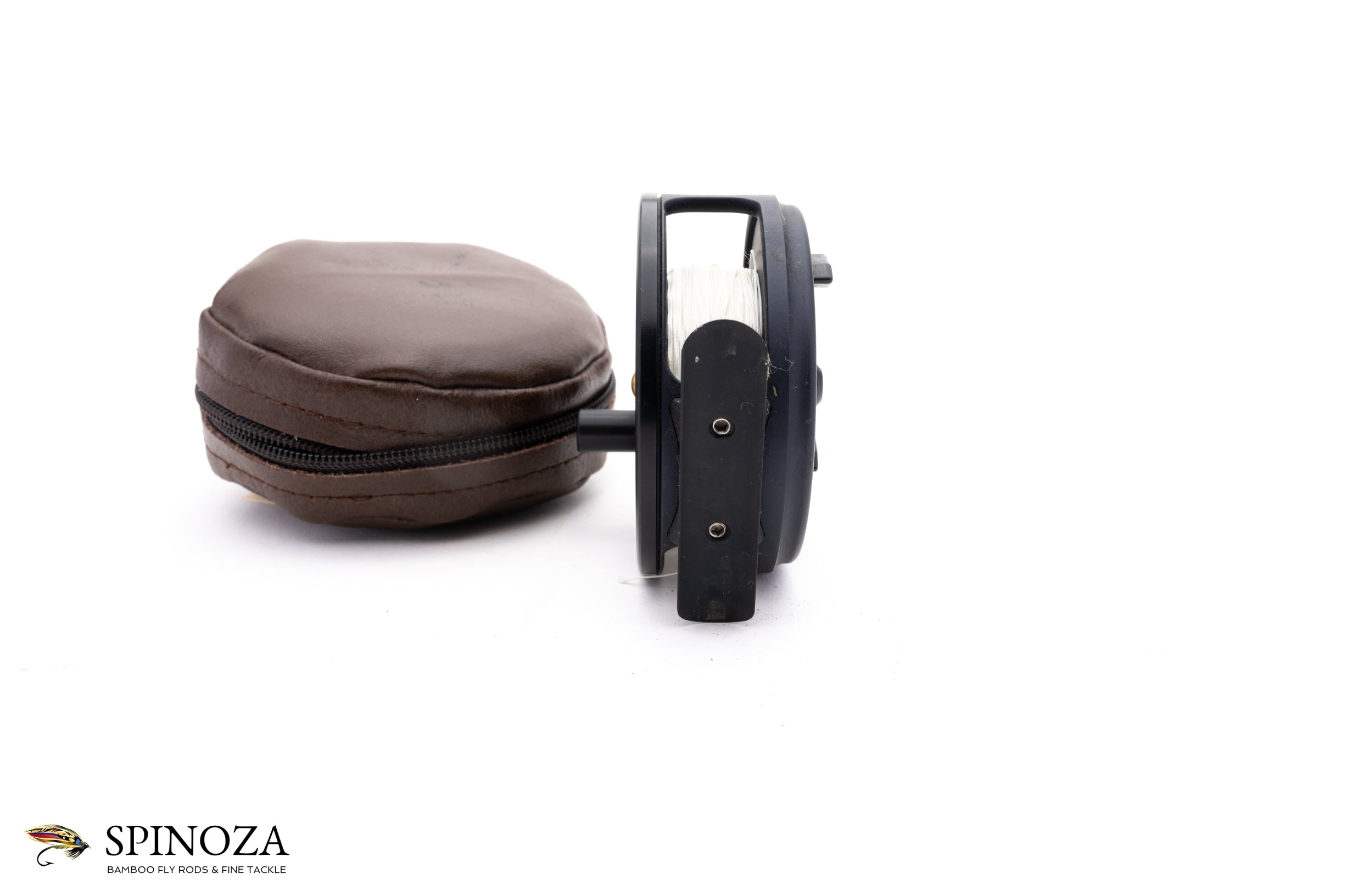 A Fenwick World Class 1 fly reel, 3" diameter and set up for LHW. Good used condition with normal cosmetic wear but nothing significant that I could see. Matte black finish with a single screw lineguard. The drag is adjusted via two dials to alter the drag pressure in either direction, a design that I haven't seen elsewhere. The reel packs into the original leather Fenwick zipper pouch.