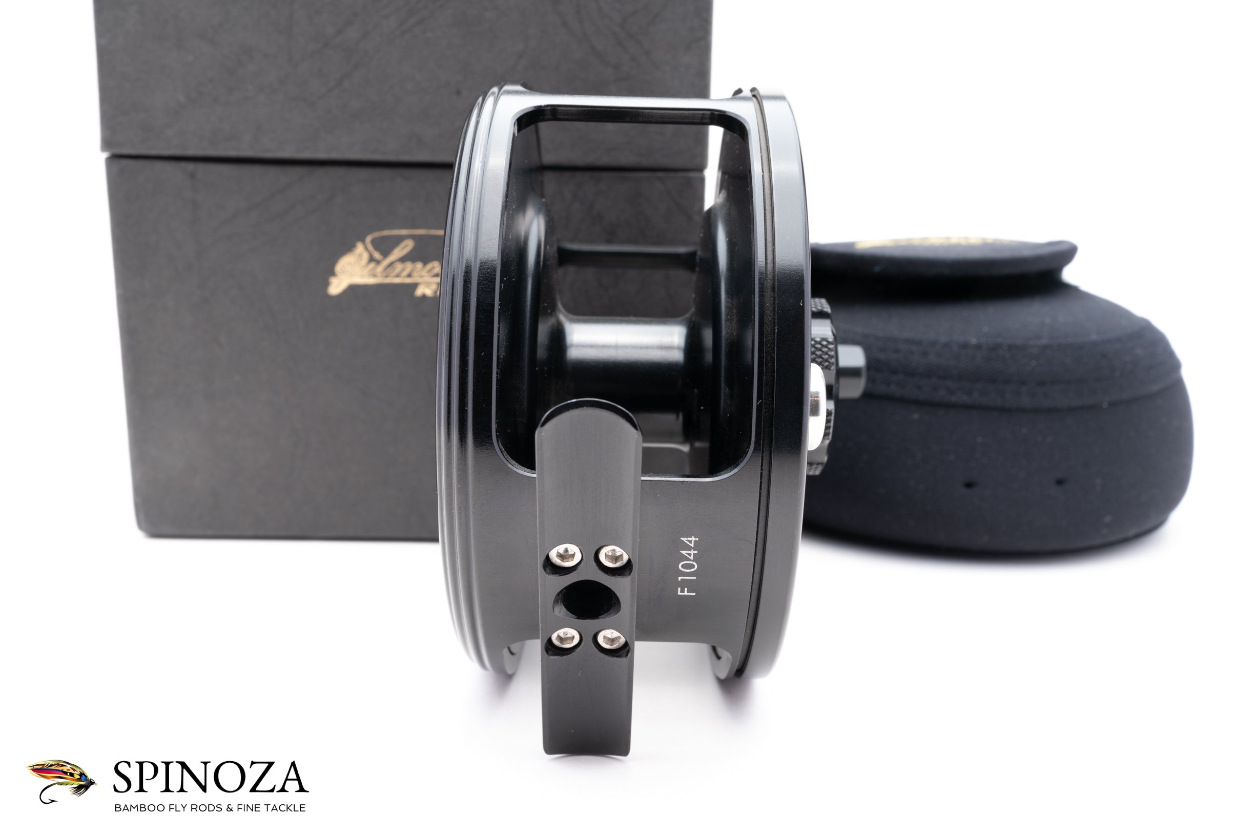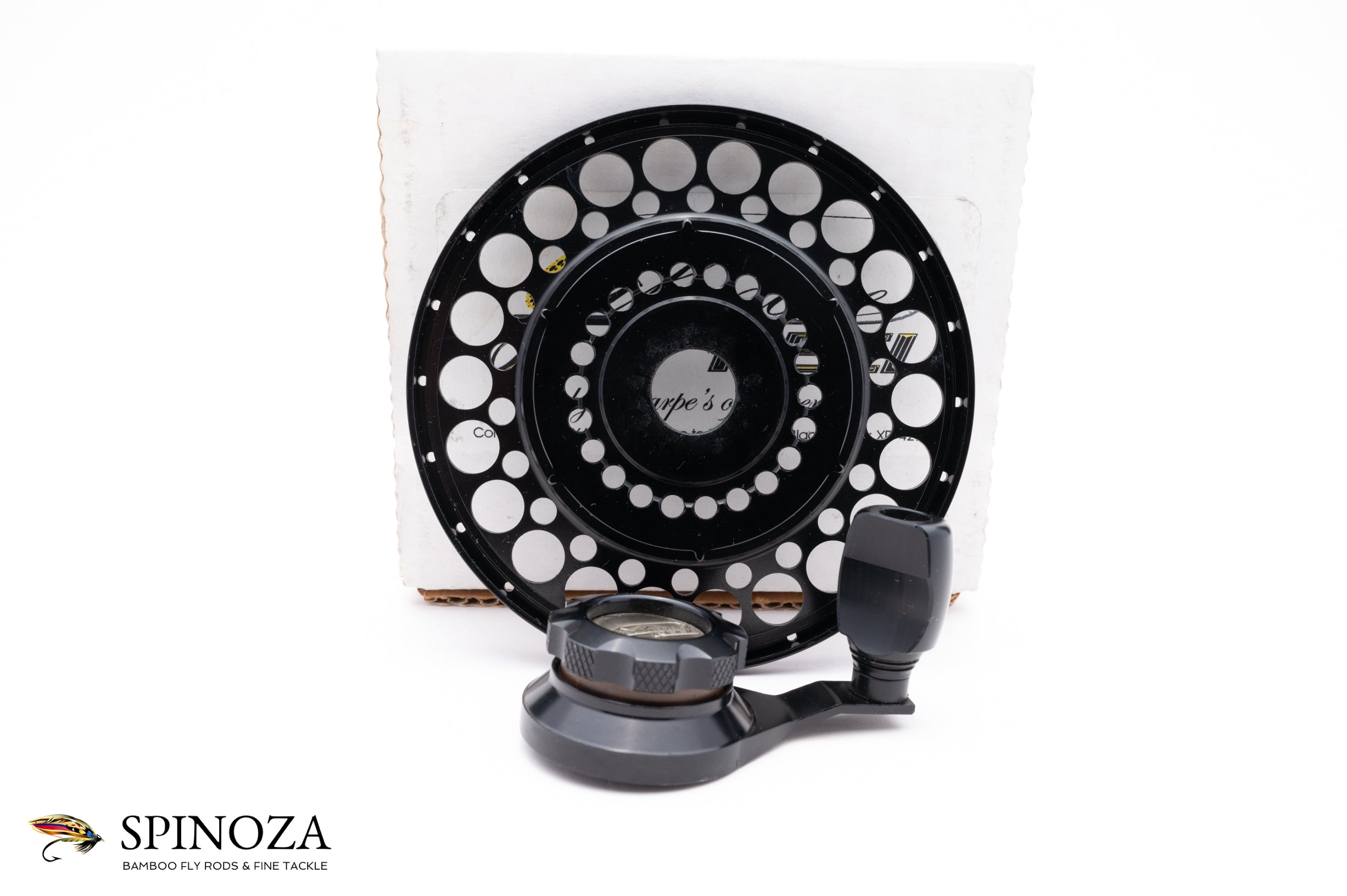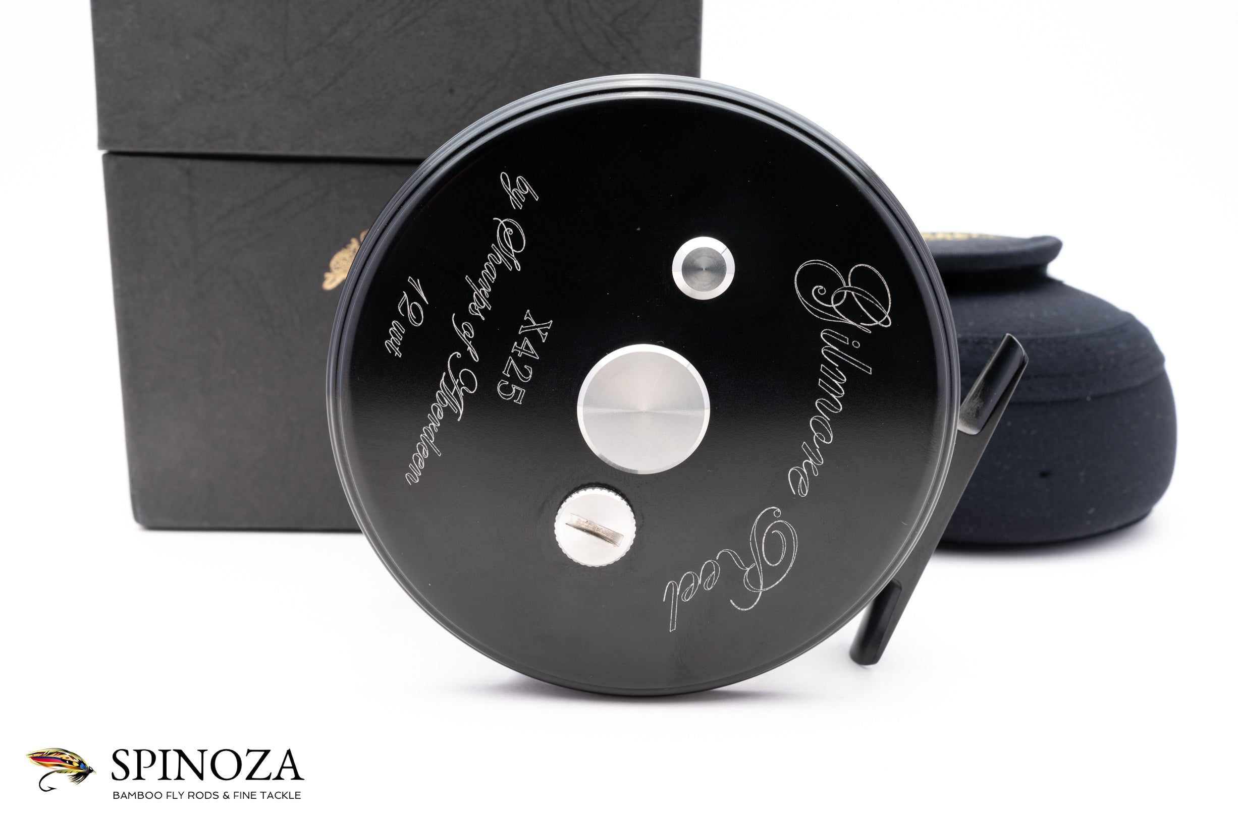 A Gilmore Intercoastal series X425 fly reel, approximately 4" in diameter and set up for RHW. The reel appears mint and unused. The Gilmore intercoastal series was designed to be highly configurable with options including anti-reverse, direct drive, and various large arbors and retrieve directions all changeable with a minimum of fuss and tooling. This version is set up for direct drive but comes with a conversion kit to change it to anti-reverse. The reel is black anodized throughout and features a dual disc drag system. It weighs 10.7 ounces on my scale and is built to hold a #12 line with capacity for 285 yards of 20# backing. The reel packs into the original black neoprene pouch and box (the boxtop corners are slightly ripped in one place) while the conversion kit comes in a separate original box.