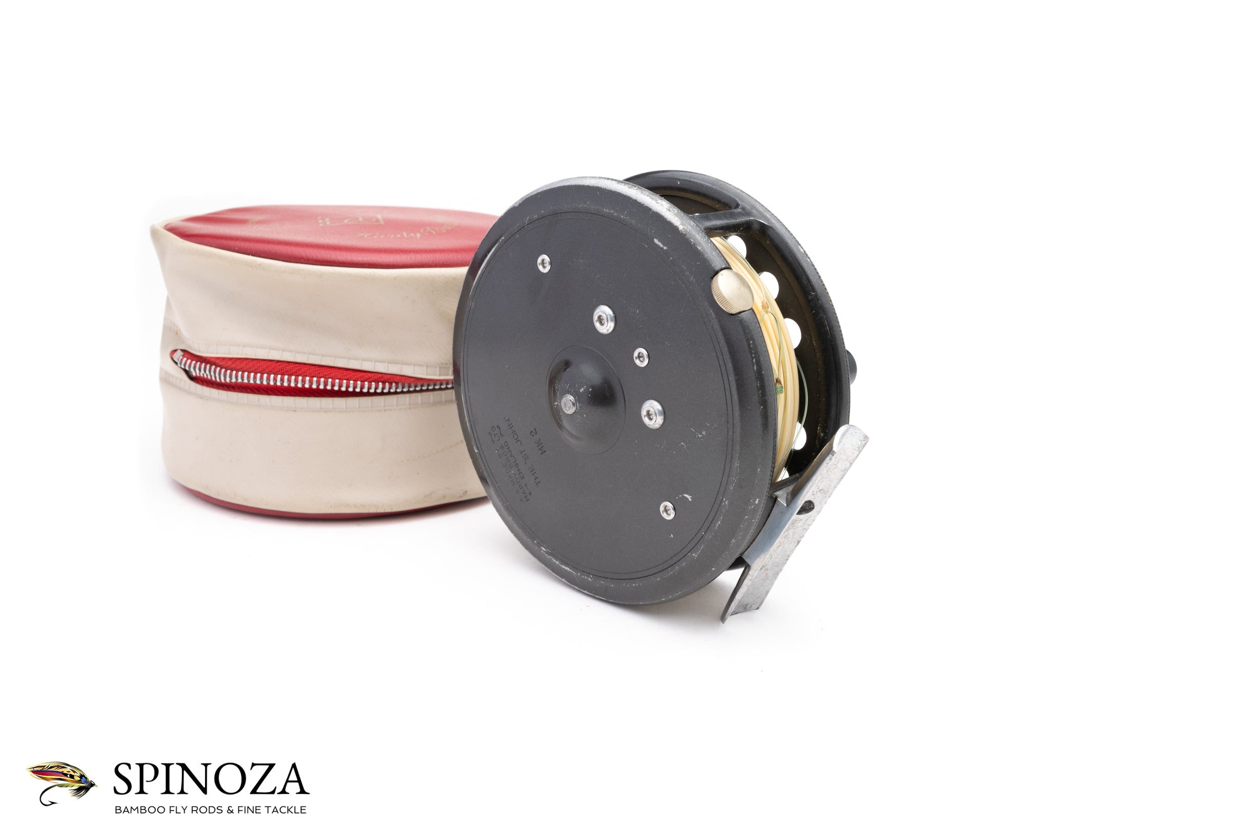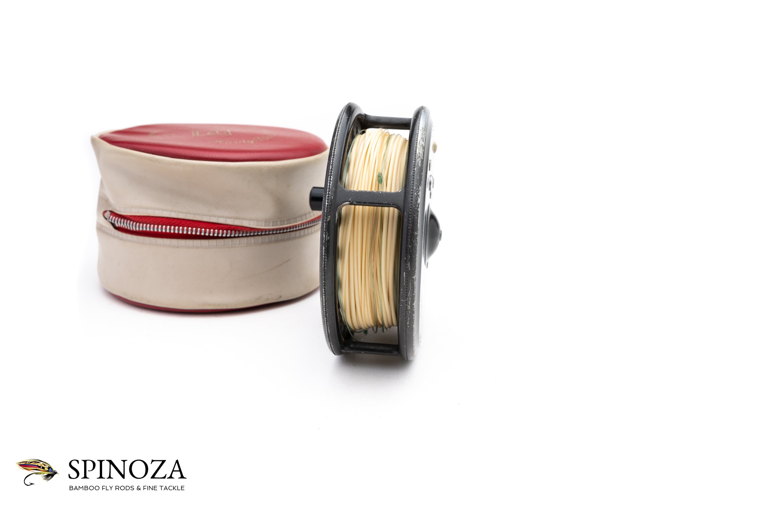 A Hardy St. John fly reel, 3 7/8" diameter and set up for RHW (though convertible). Two-screw latch model. Good used condition with some cosmetic wear to the enamel in the typical spots. Alloy foot. Nice smooth click. The reel comes with its original zippered Hardy case.