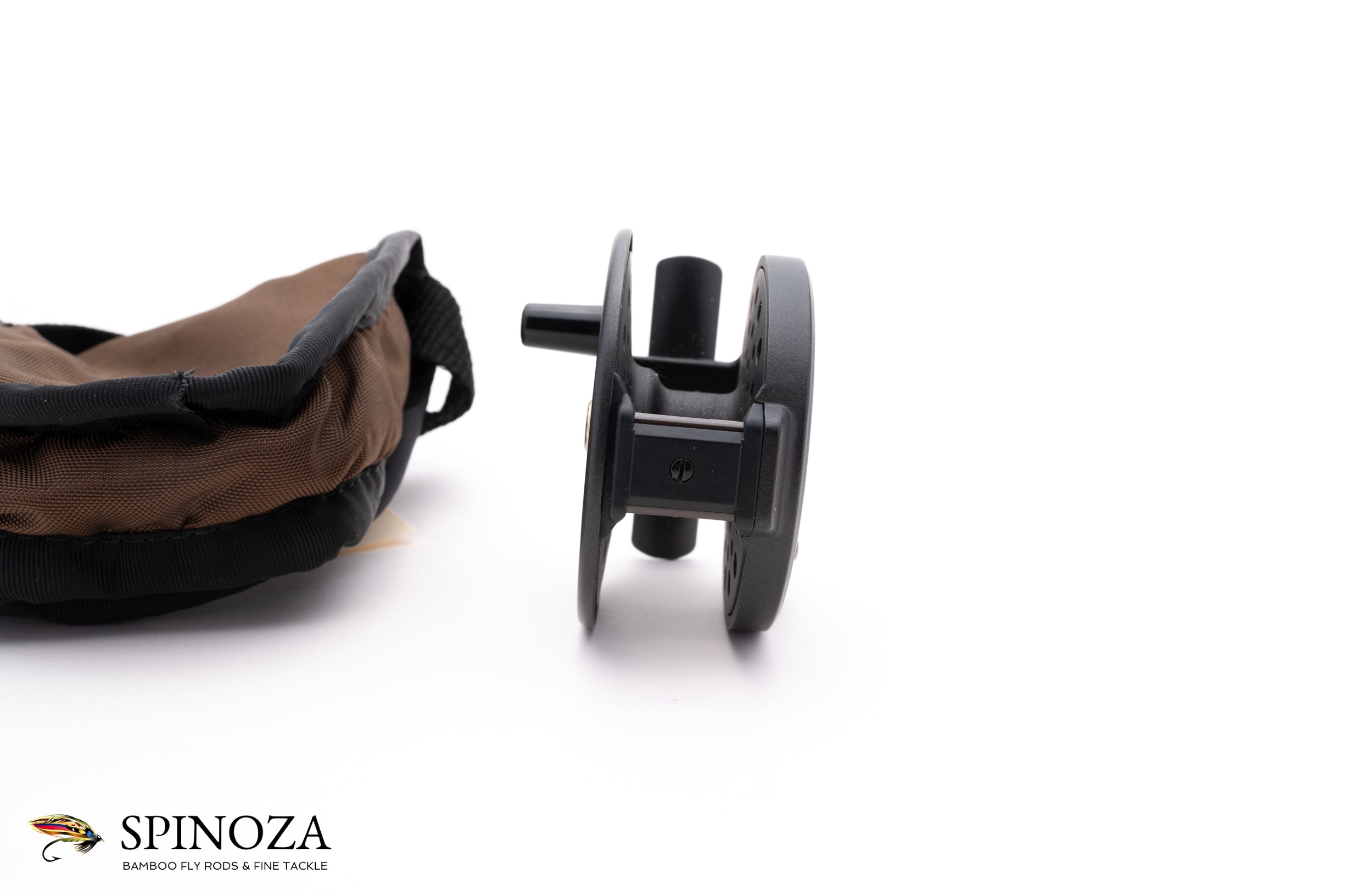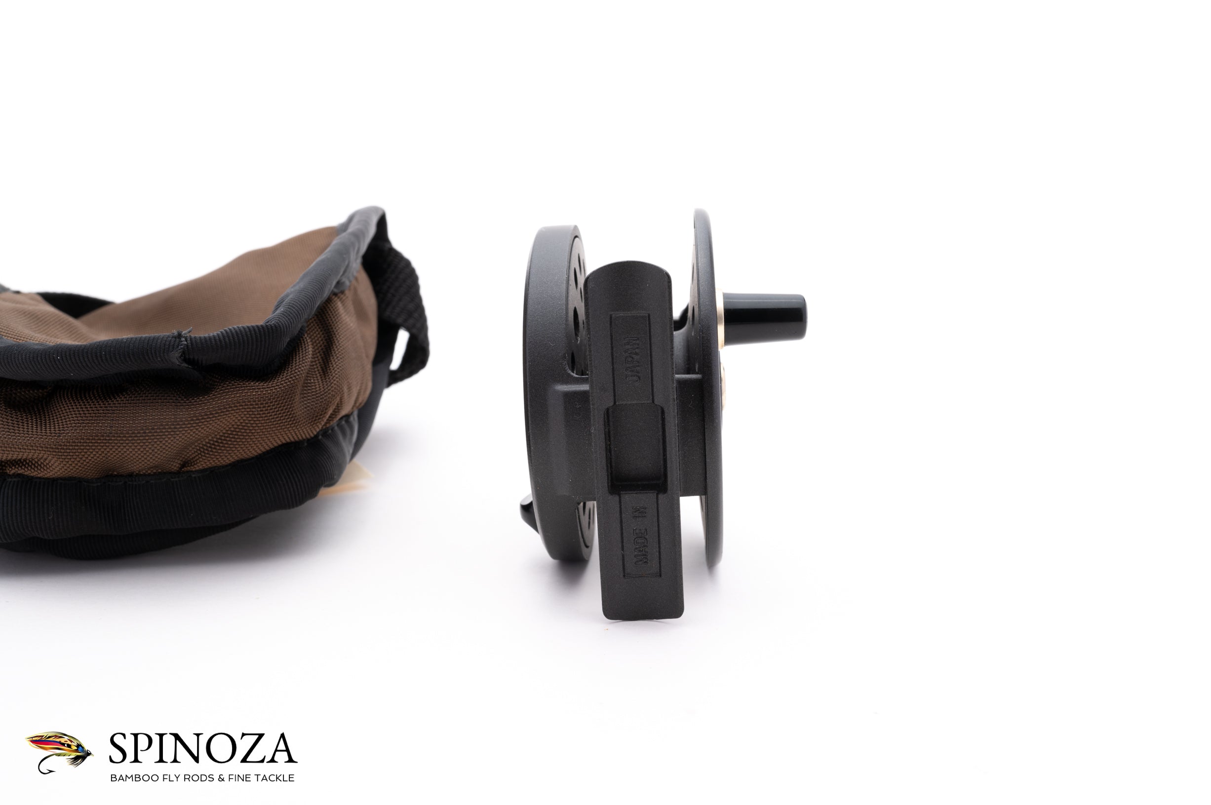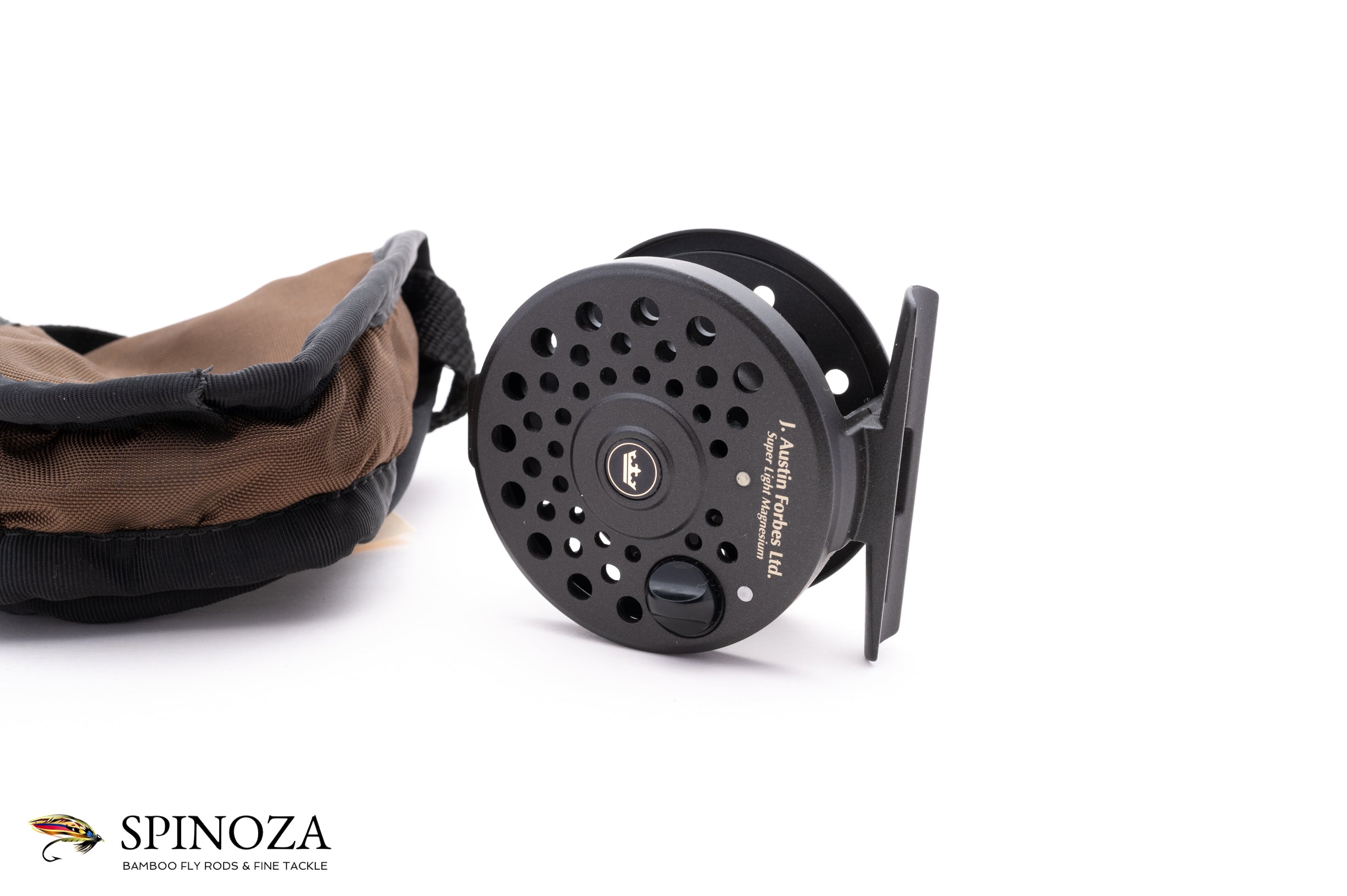 A J Austin Forbes Super Light Magnesium trout reel, 2 1/2" diameter and set up for RHW. The reel weighs a scant 2.2 ounces on my scale, presumably due to the magnesium used to make it. Light indeed! The reel appears mint, with a dark charcoal frame and spool. Adjustable click drag. Made in Japan. It packs into a brown cordura pouch.