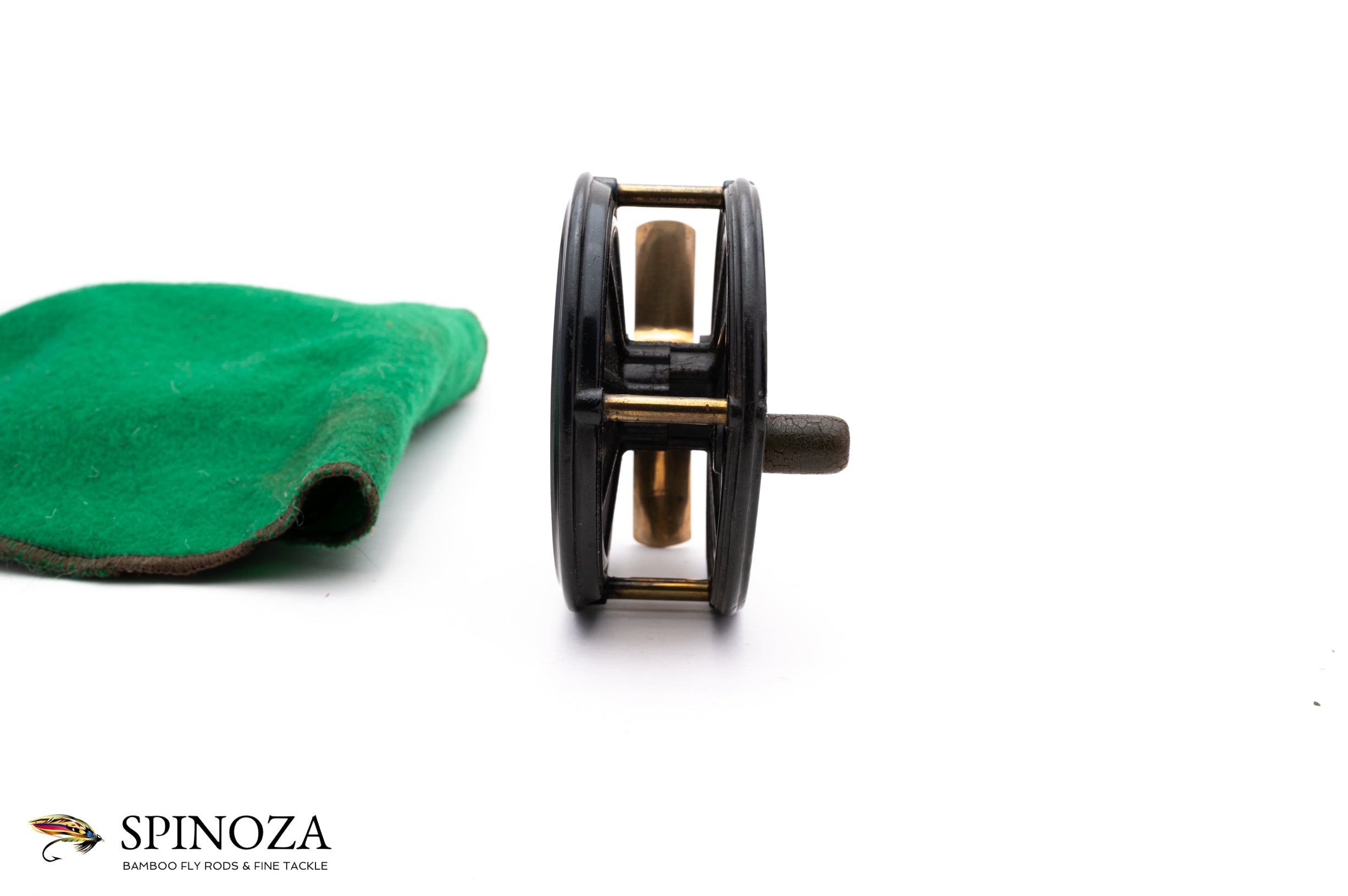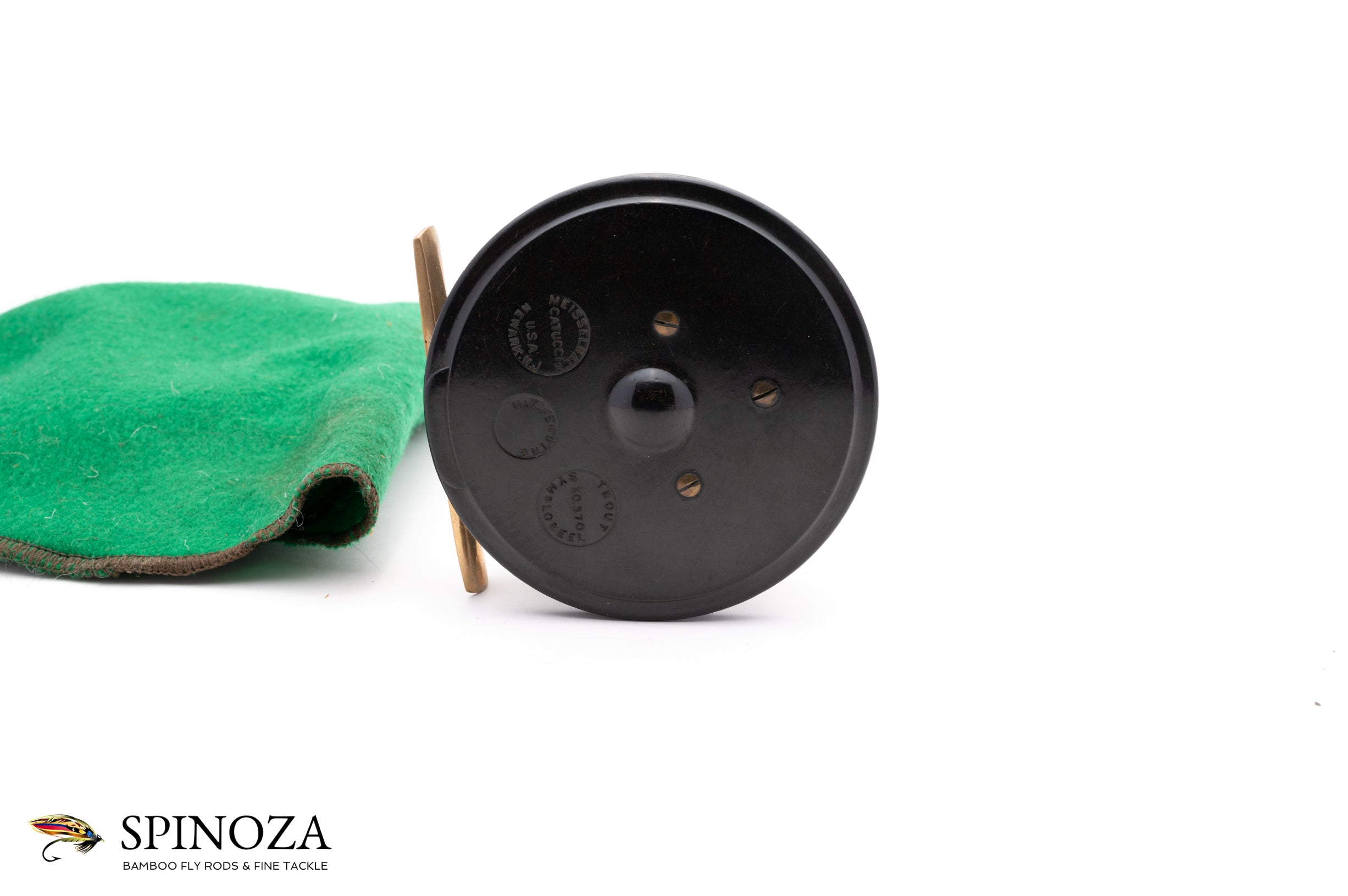 A Meisselbach Catucci No 370 fishing reel, with a fairly neutral bias. Made from bakelite with what look like nickel silver pillars and a brass foot. Erinoid handle. Good overall condition, with normal wear and a small chunk taken out of the edge of the handle. The reel's internals could use some fresh grease.