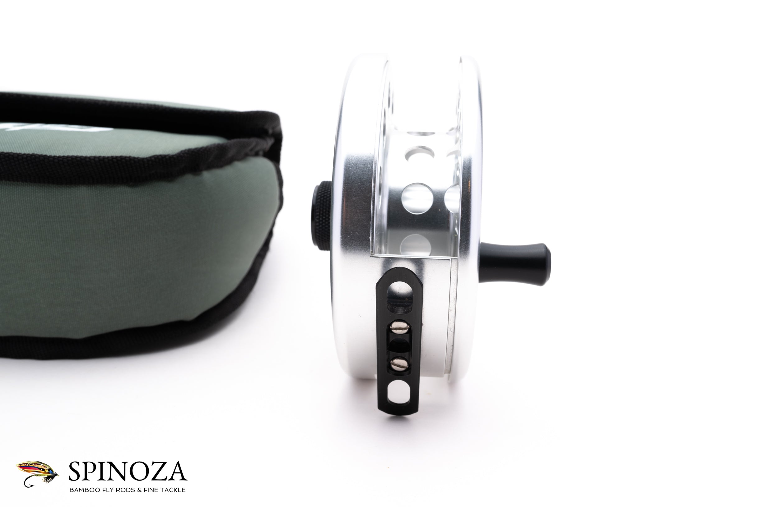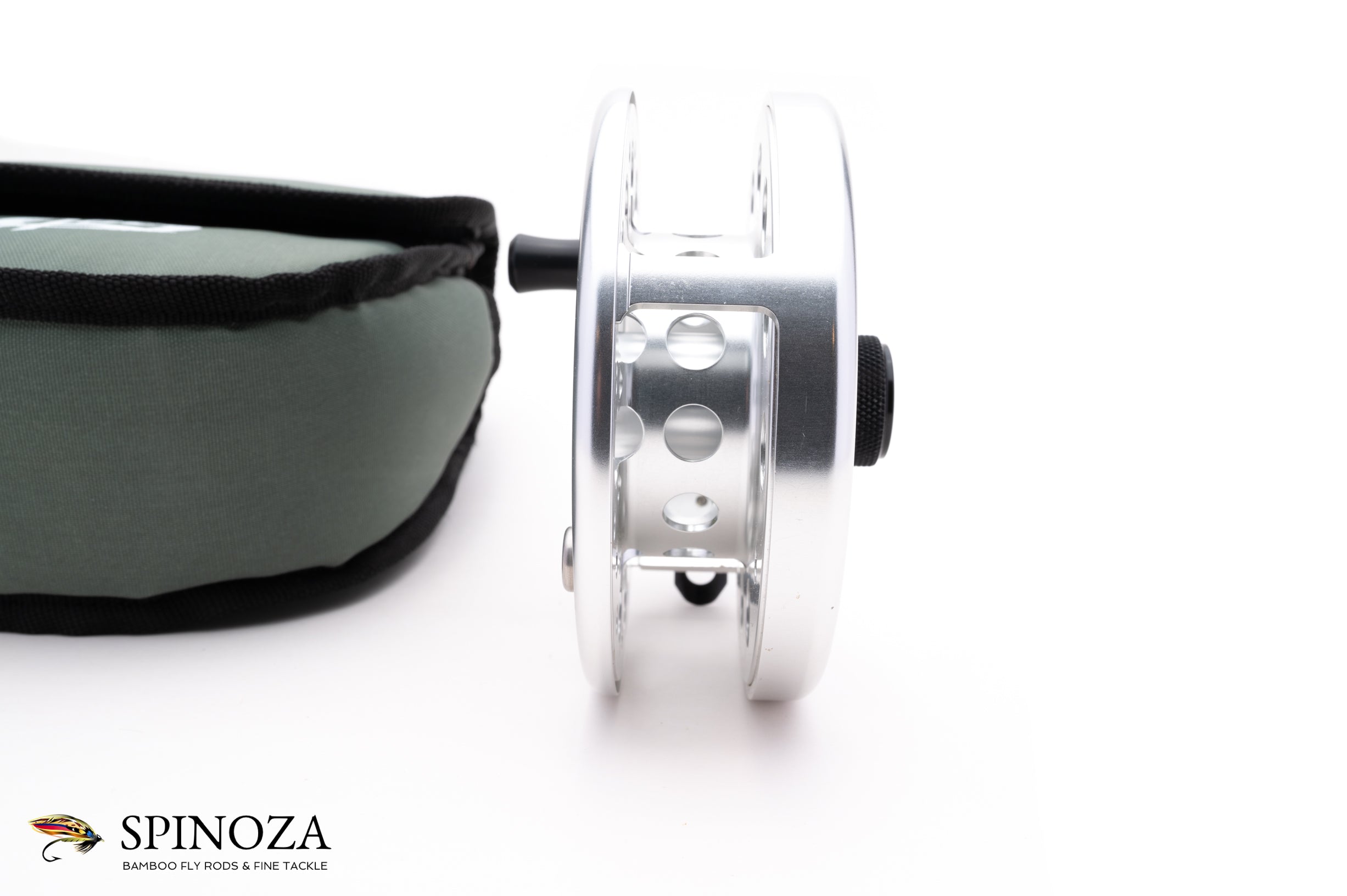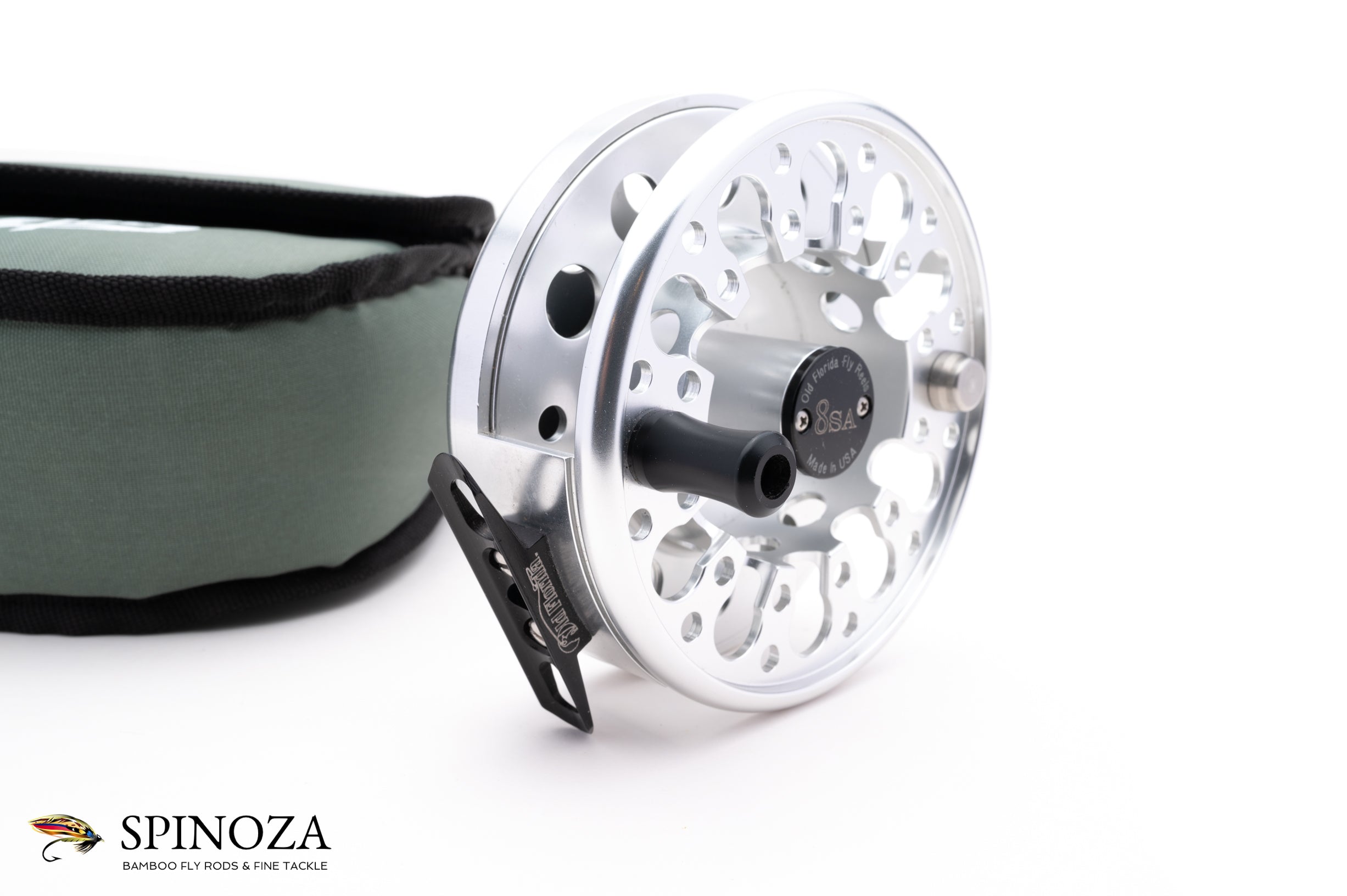 An Old Florida #8SA fly reel, 4 1/2" diameter and set up for RHW. Near mint condition, with just a few tiny traces of cosmetic wear. Silver anodized throughout, with a super arbor design and porting on the frame and spool. The real weighs 10.6 ounces on my scale. Old Florida made reels until the early 2000s, when they were bought out by the company that would become Nautilus. The reel has an adjustable cork drag, with a click on the incoming retrieve and is silent on the outgoing. Made in the USA. The reel comes in a non-original Abel cordura pouch.
