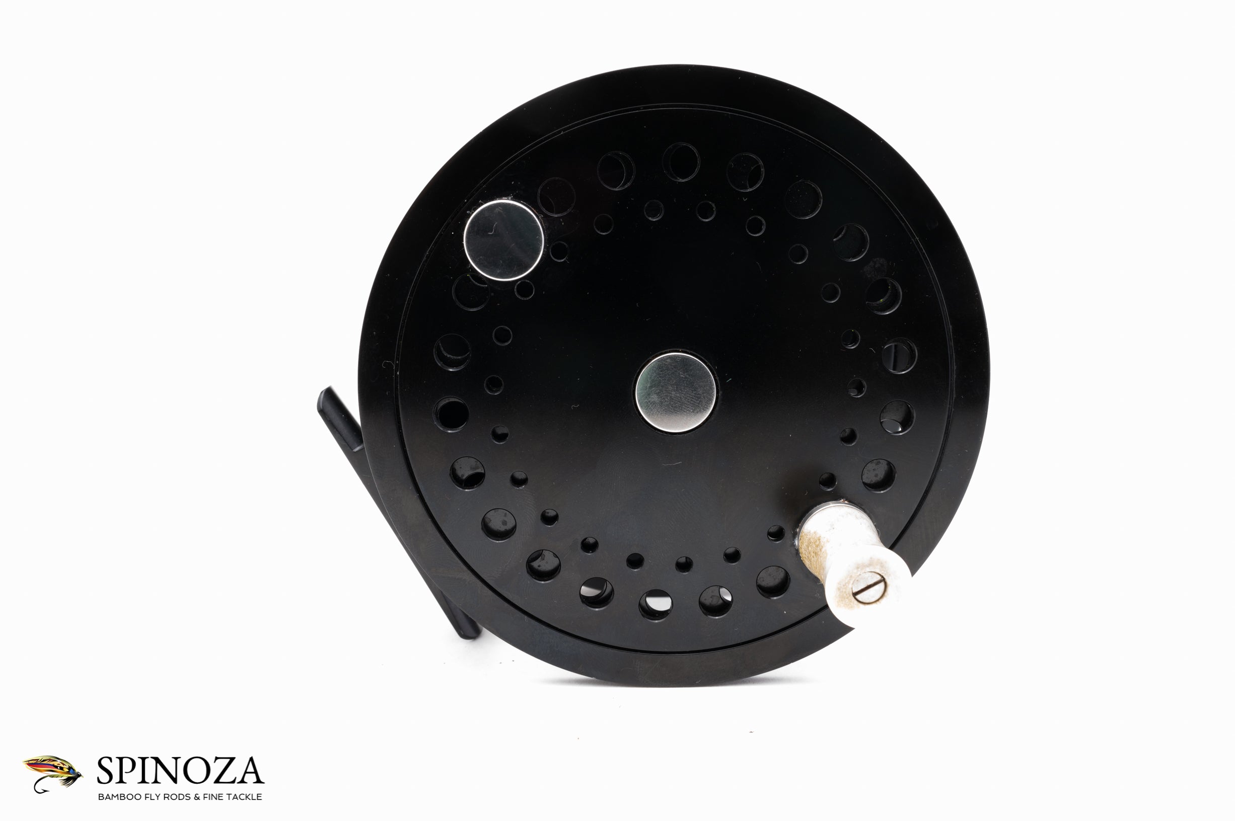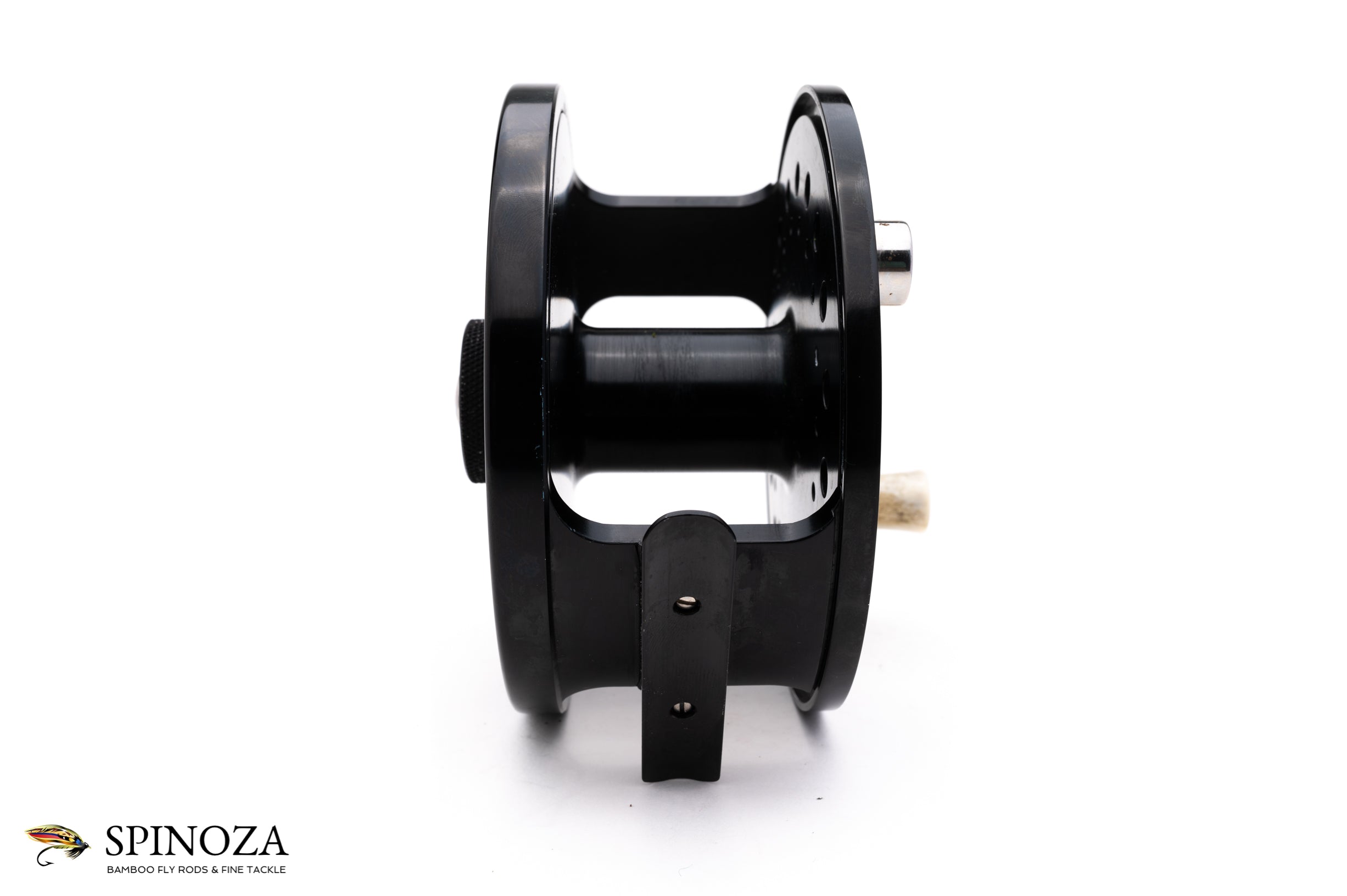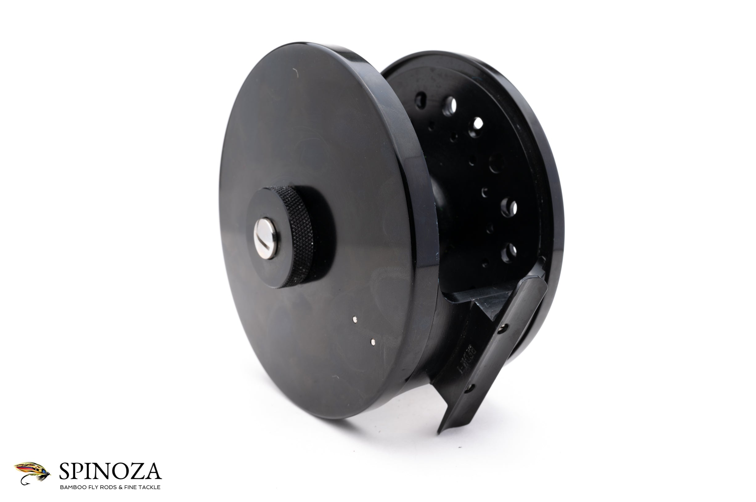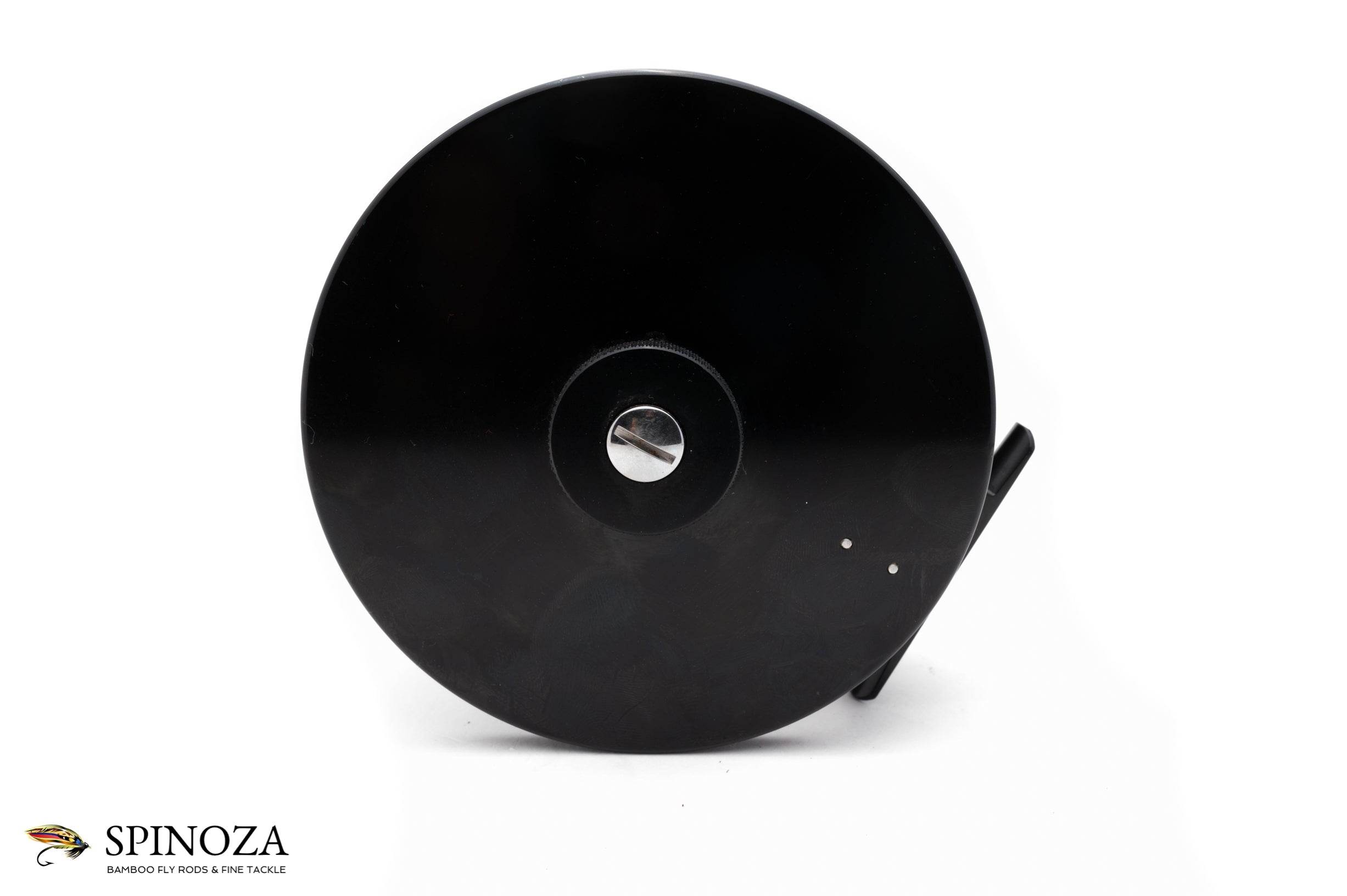 A very scarce Cliff Herron anti-reverse Fly Reel, set up for LHW. At 4 3/4" in diameter this is the largest model Herron reel I've ever come across, and indeed I could find no information about this size at all among my usual sources! Excellent used condition with a few tiny scuffs on the rims and some general handling marks. This is a beast of a reel which also boasts a 1 3/4" spool width. Anti-reverse design. All black anodized with the exception of the handle, counterbalance, spindle cover, and the screw holding in the drag adjuster. The handle appears to be some kind of fossilized material. "Herron" stamped into the foot, and on the reverse side "BFDM-1". No bag. An exceptionally rare size from a reelmaker whose reels are already hard to come by.