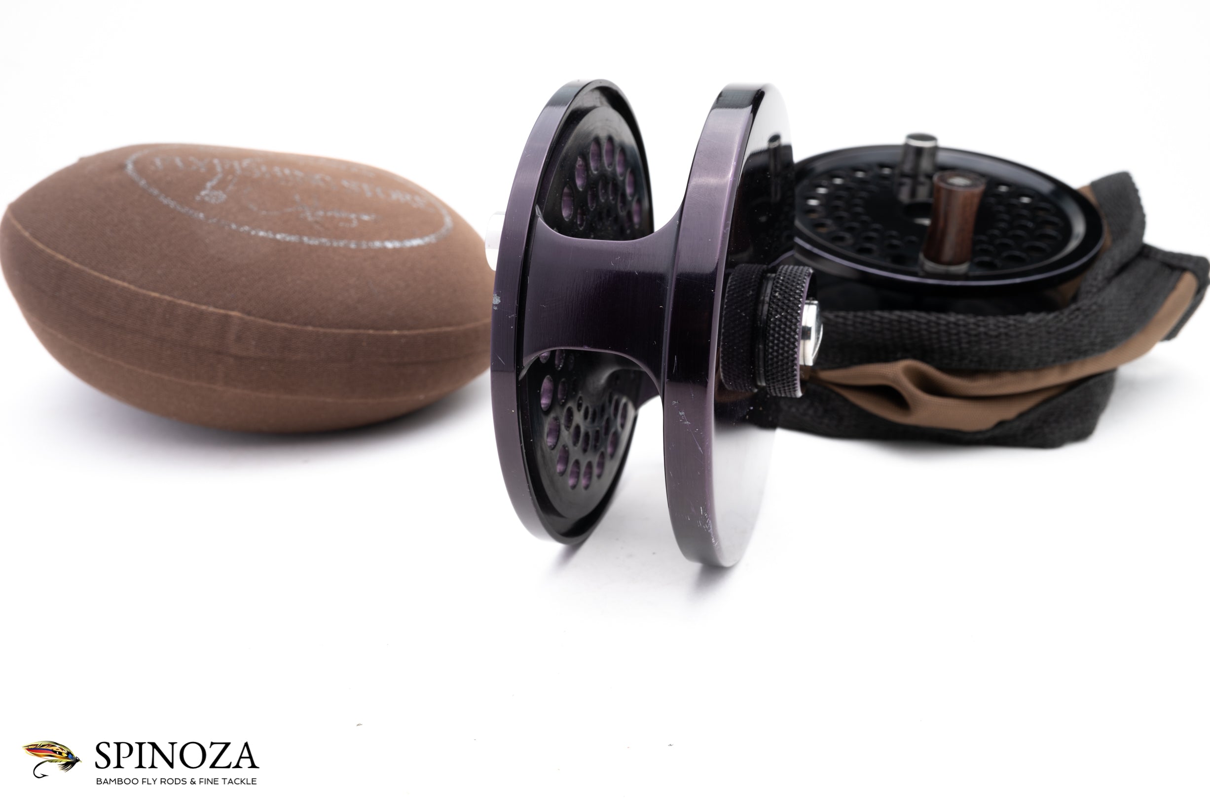 A rare Cliff Herron fly reel with a spare spool, 3 3/4" diameter and set up for RHW. Direct drive. Black anodized throughout. Good used condition with a few spots of rim rash here and there on the loaded spool and one tiny spot on the edge of the spare spool. 1" spool width. Nice smooth click with a powerful drag that's adjusted by the dial on the rear plate. My understanding is that Herron manually machined these with no CNC involvement. The reel comes in a non-original neoprene pouch and the spare spool comes in a nylon pouch.
