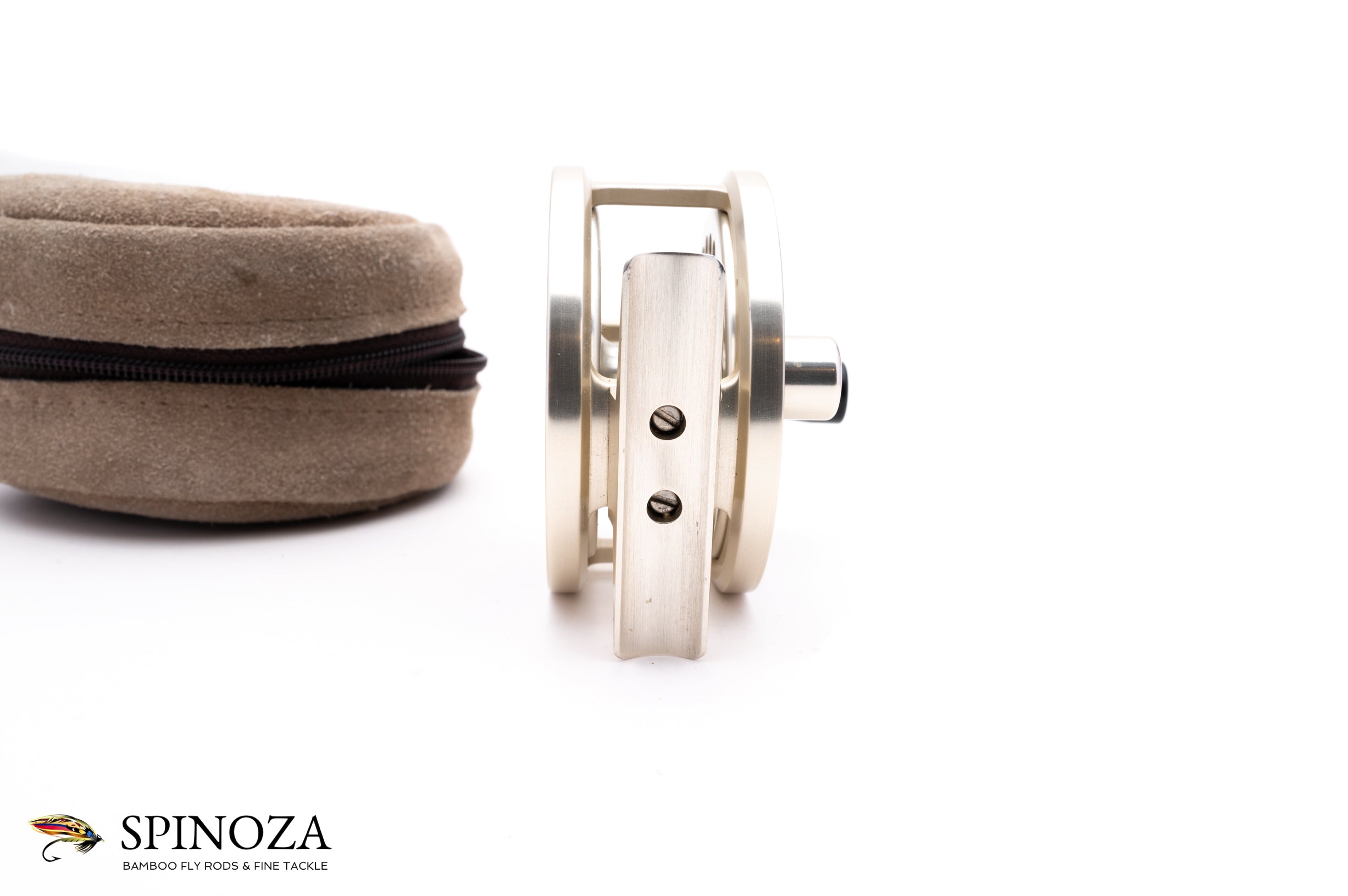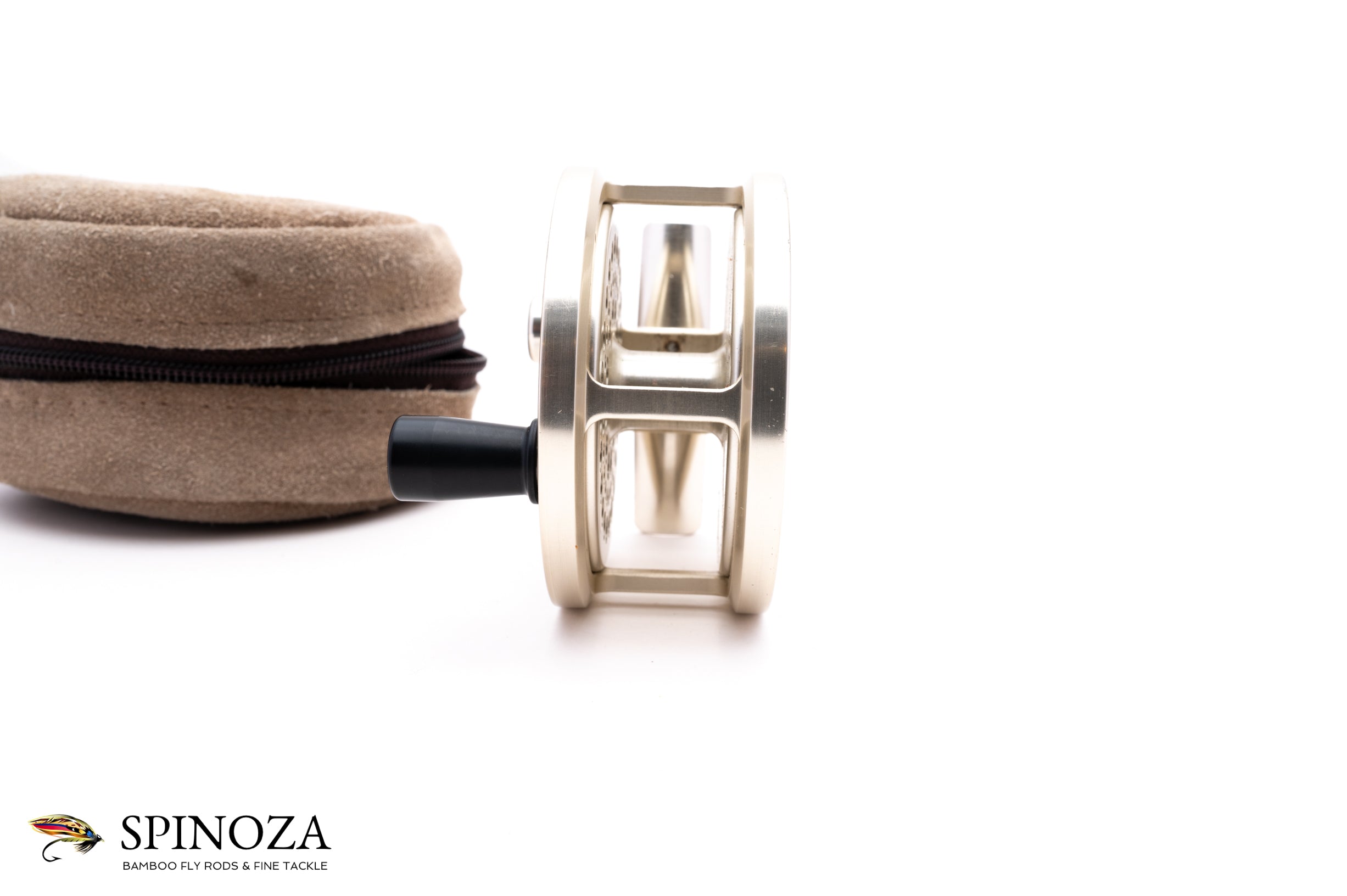 A very nice David Robichaud Traditional trout reel in the 2 13/4" size. Favors LHW. Designed for a #4 line. Weighs 4.3 ounces. Lightly used condition with some light rim rash in one area on the frame edges but very clean overall. Black sideplates, ventilated on the cranking side, with a silver anodized frame. "DL Robichaud, Hudson NH, USA" in script on the backplate. A nice little S-handle reel here in a useful size. Comes in a suede zipper pouch.