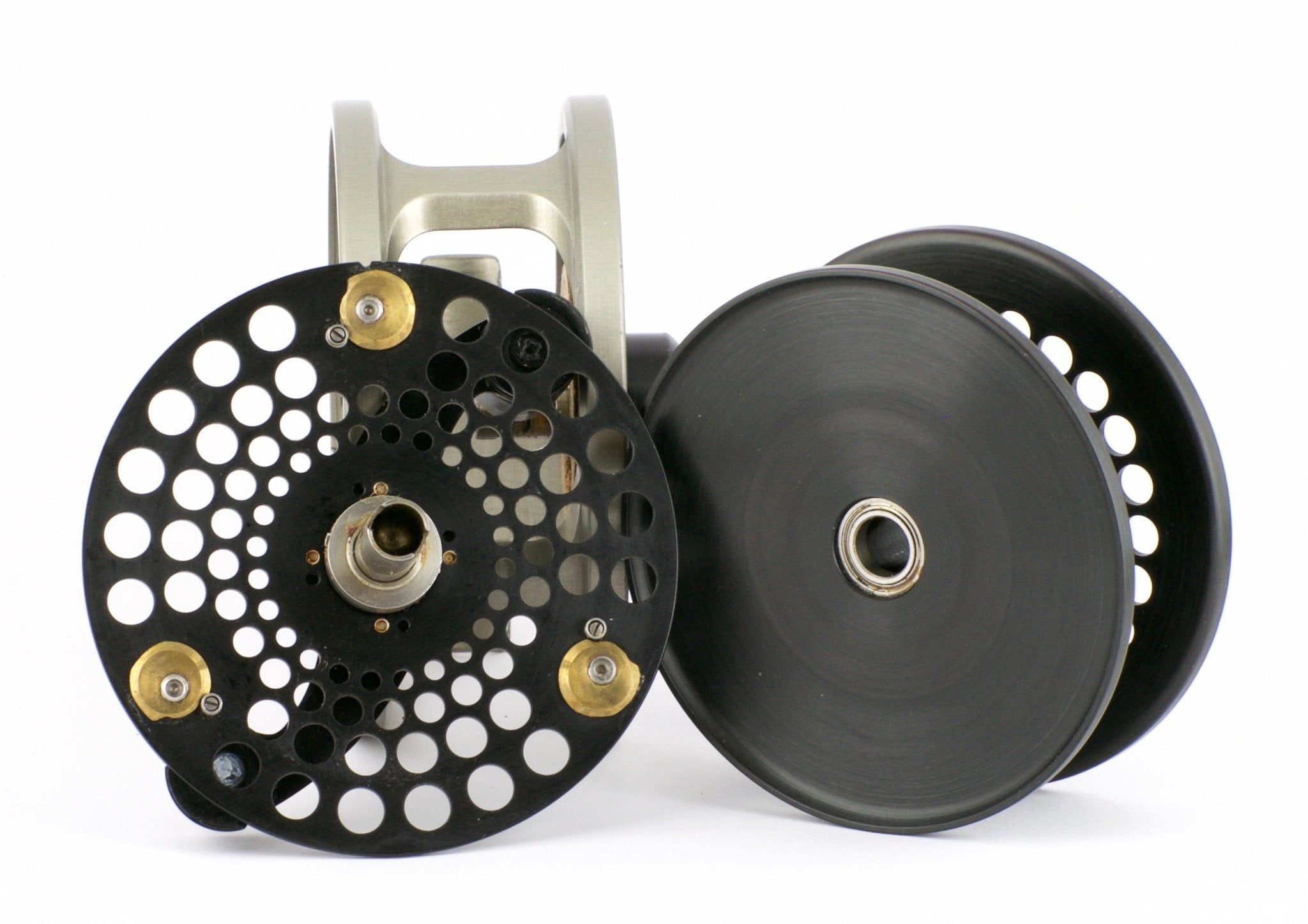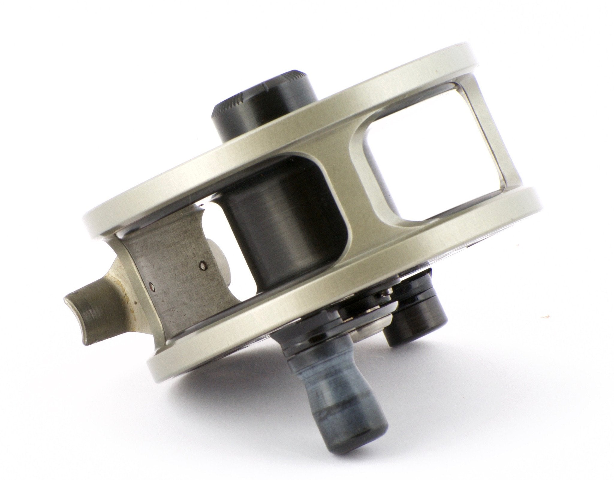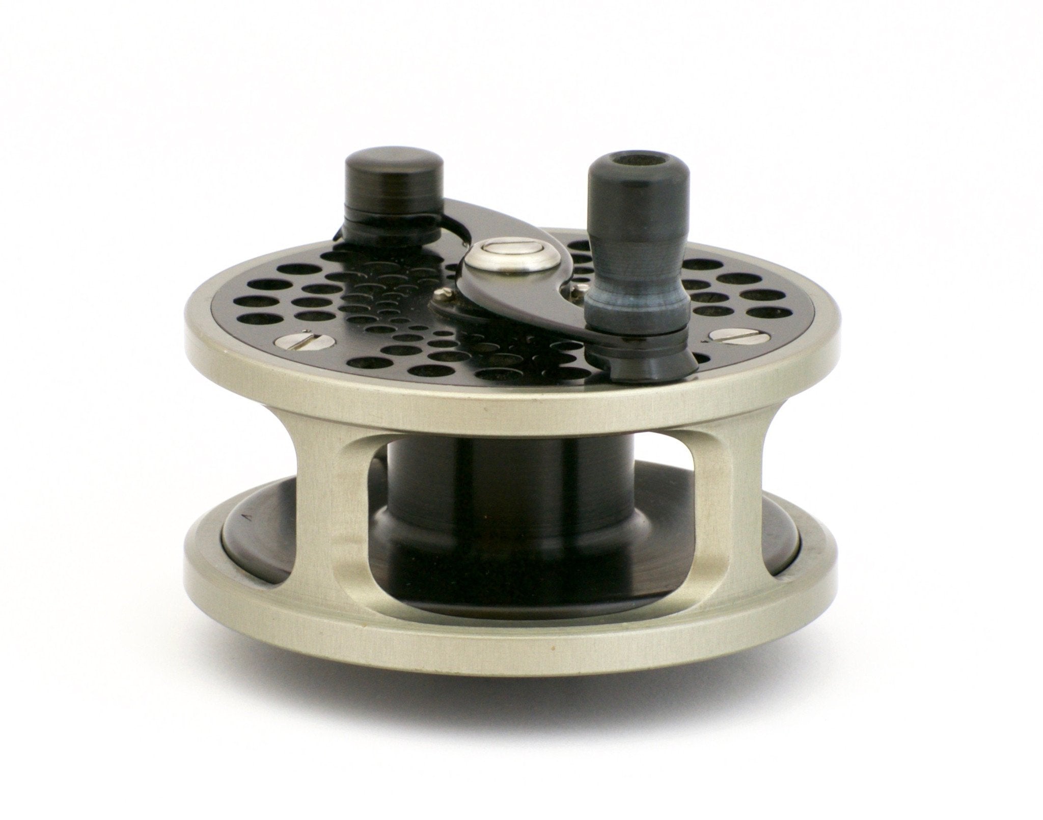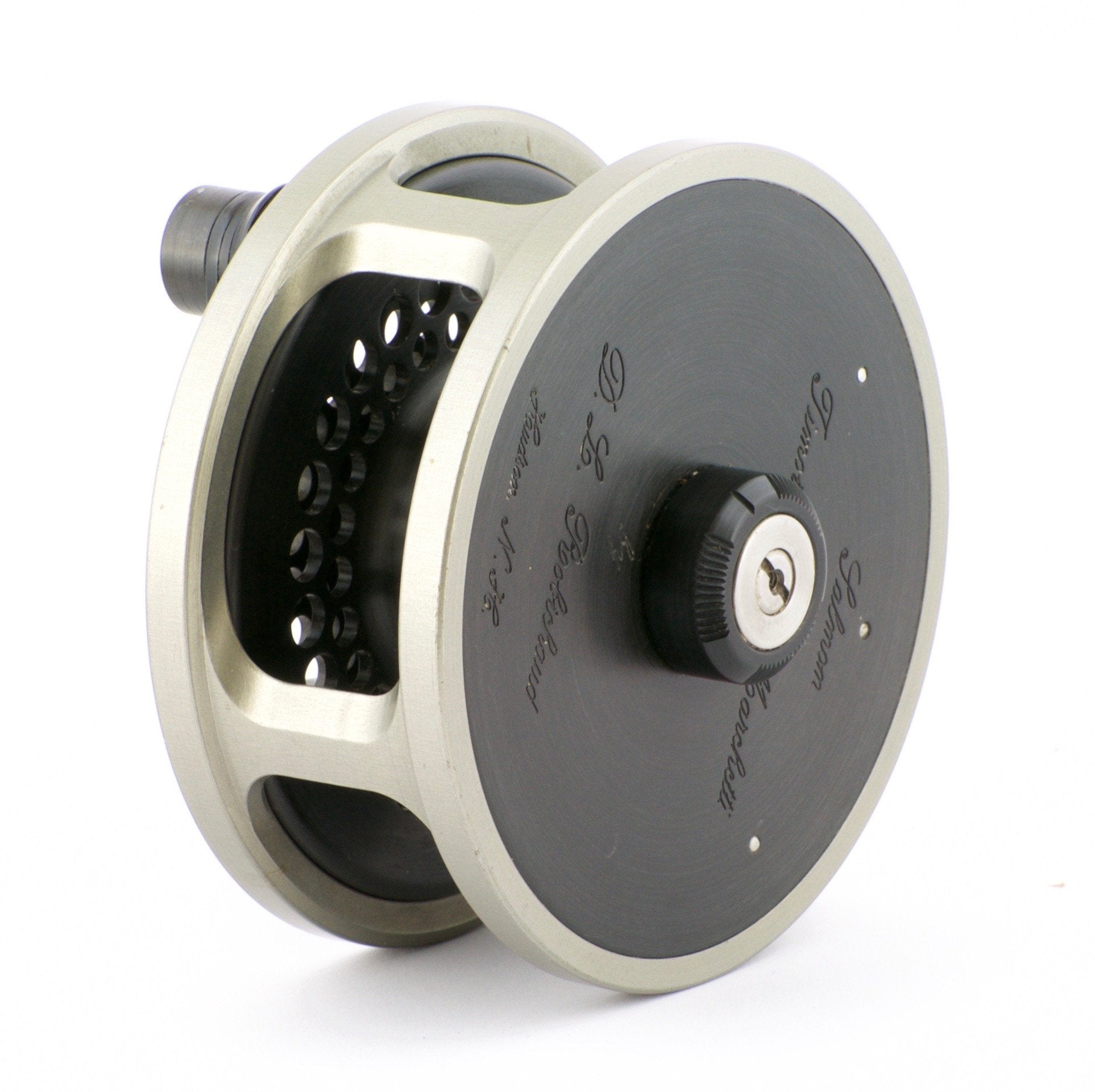 For sale here is a very scarce Dave Robichaud disc drag and anti-reverse salmon fly reel. Silver/gray color combination. The reel is in excellent used condition. Original reel pouch included. Set up for right hand retrieve, but is user convertible to left hand retrieve if desired. Incoming click and outgoing cork disc drag. The drag is adjustable, providing solid tension should one desire. 4" diameter. Spool width is 1". The reel weighs 11 1/2 oz.