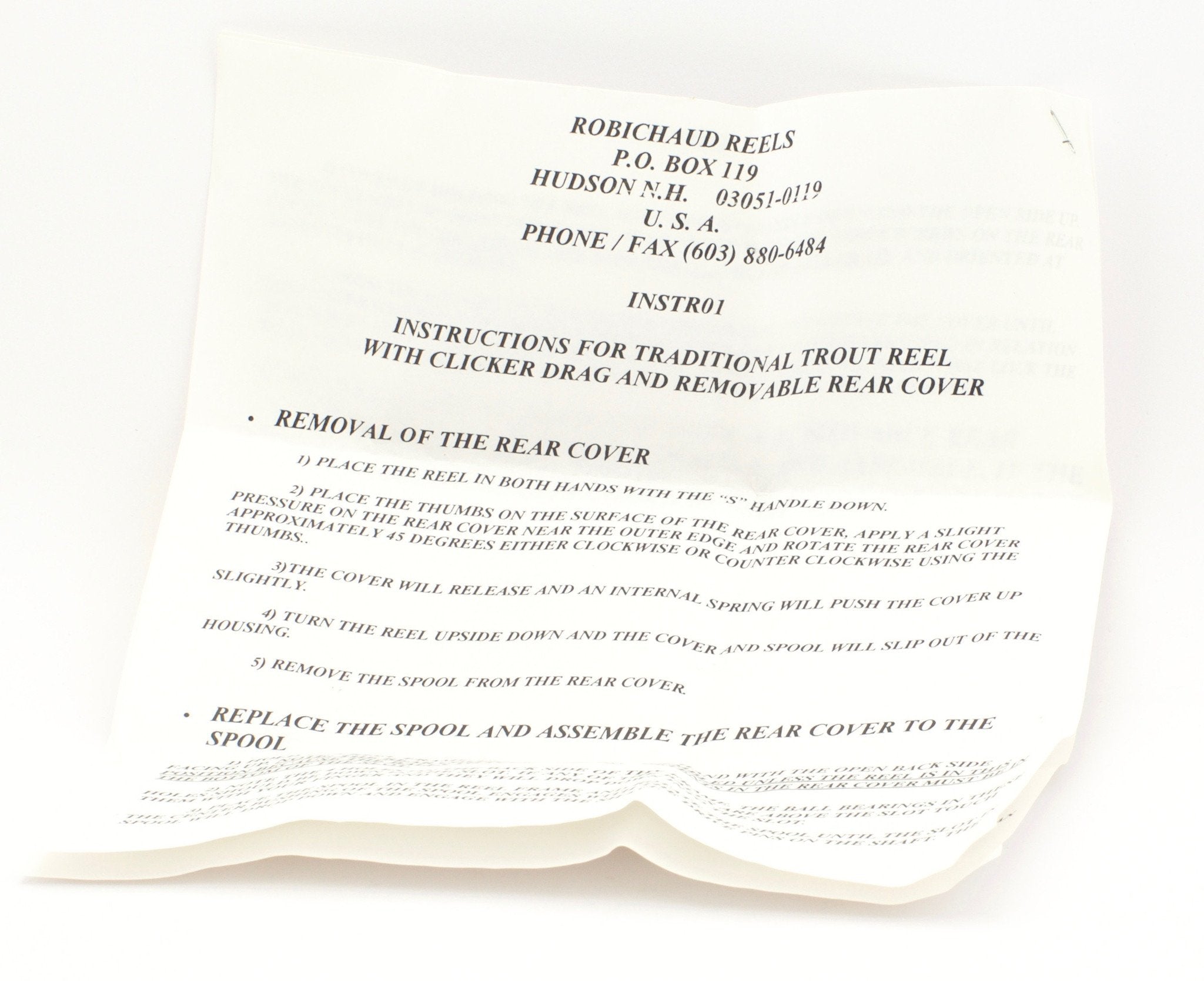 For sale here is a D.L. Robichaud #5 Traditional Trout fly reel with removable back cover. This spool removal method is very easy and a very nice feature with these reels. In the once crowded field of classic S-handle styled reels being made, I have to admit that these Robichauds are my absolute favorite choice, given their cost to quality ratio. Near mint condition with a few ever so slight handling marks in the anodized back plate if held up to bright light. Right hand retrieve only. Traditional fixed click/pawl. Made to hold a 5wt line plus backing. 3" diameter. Frame width is 1.33". Inner spool width of 0.70" Weighs 4 1/2 oz. Comes with its original reel pouch with Robichaud's stamped impression as well as the reel instructions.