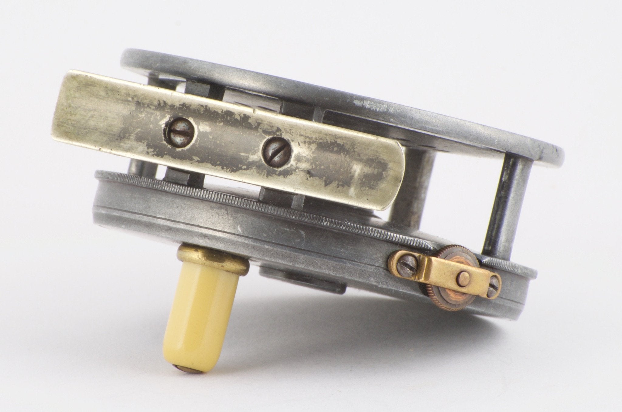 For sale here is a gorgeous old Dingley-made Perfect from the early 1920's. This 3 inch reel is extremely tight, very well made. It has a single pawl/spring and no ball bearings (a "eunuch" model). It comes with a strap-over tensioner (another feature hard to find on Dingley reels) that works perfectly, gradually increasing the spring tension throughout its adjustment range. The original brass foot is full length and unblemished.