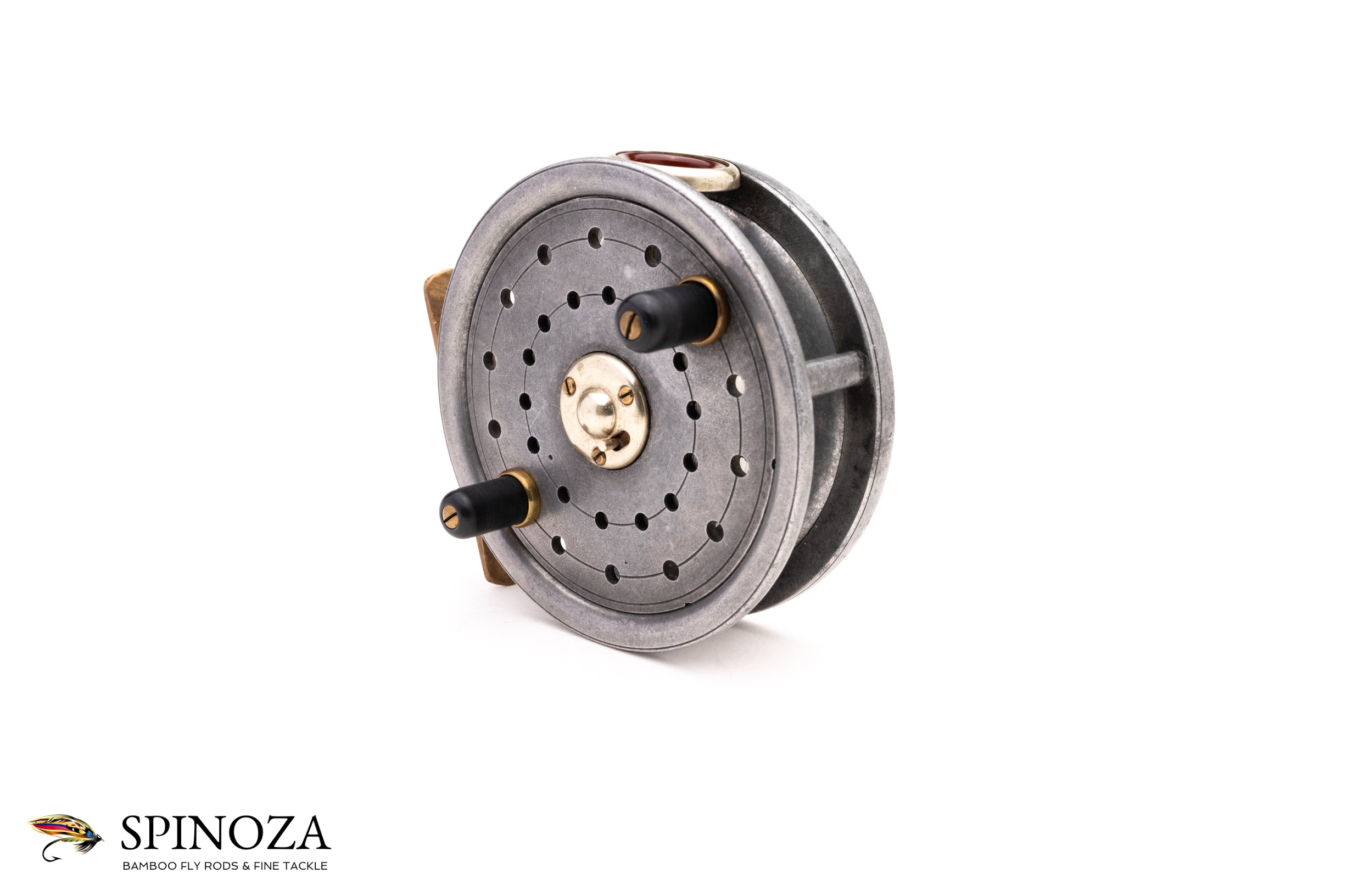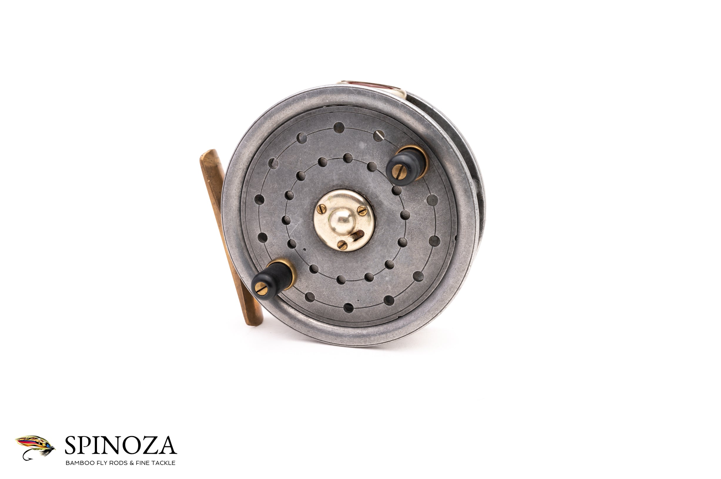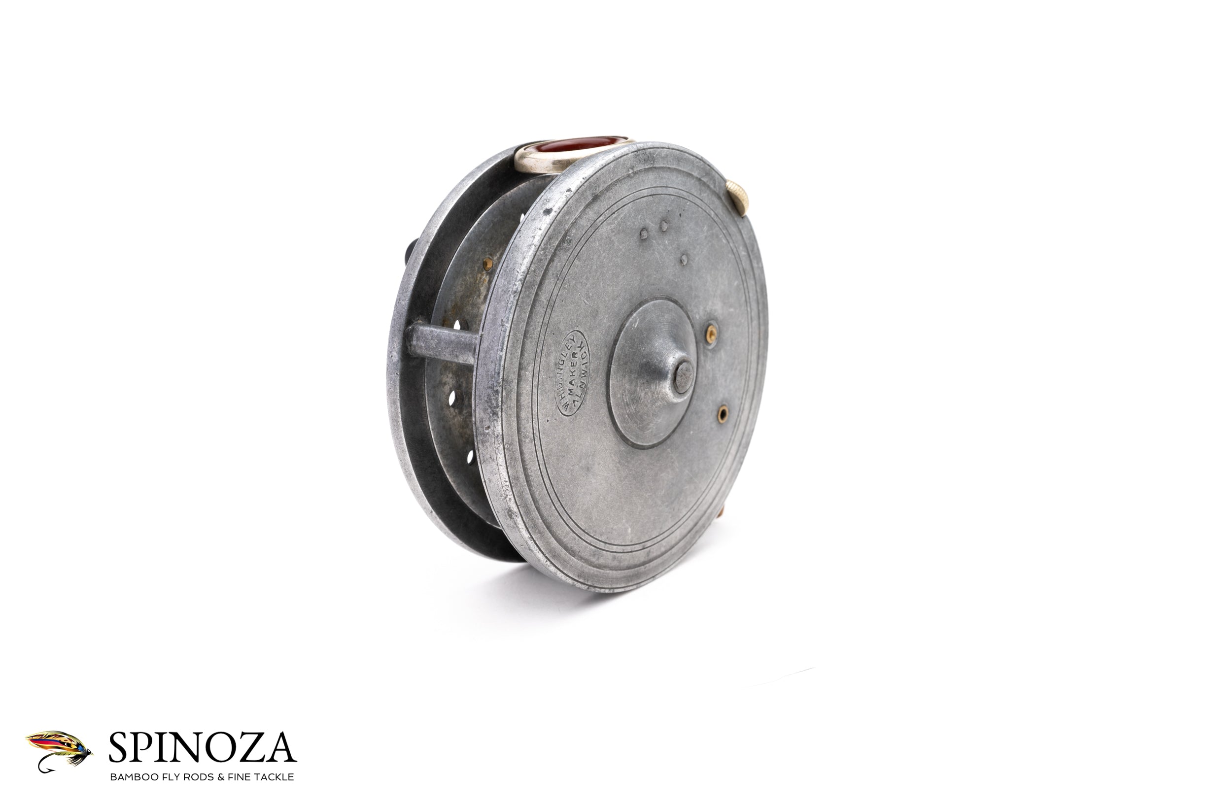 A very nice Dingley St. George-style reel, 3 3/8" diameter and set up for RHW. Red agate lineguard. Stamped "Dingley, Maker, Alnwick" on the backplate. Stamped "4" on the foot, and "4" and "I" on the inside of the frame. Excellent condition with normal cosmetic wear but no major defects of any sort. Full length brass foot and the red agate in the lineguard is free of cracks. Dual ebonite handles and this reel actually comes with a third section of ebonite as a possible replacement (the current handles on the reel look original to me, so the previous owner must have picked up the spare somewhere). Lever spool release. Simple single check inside and the drag is nice and smooth. The spool is nice and tight. A fine example of a St George style Dingley.