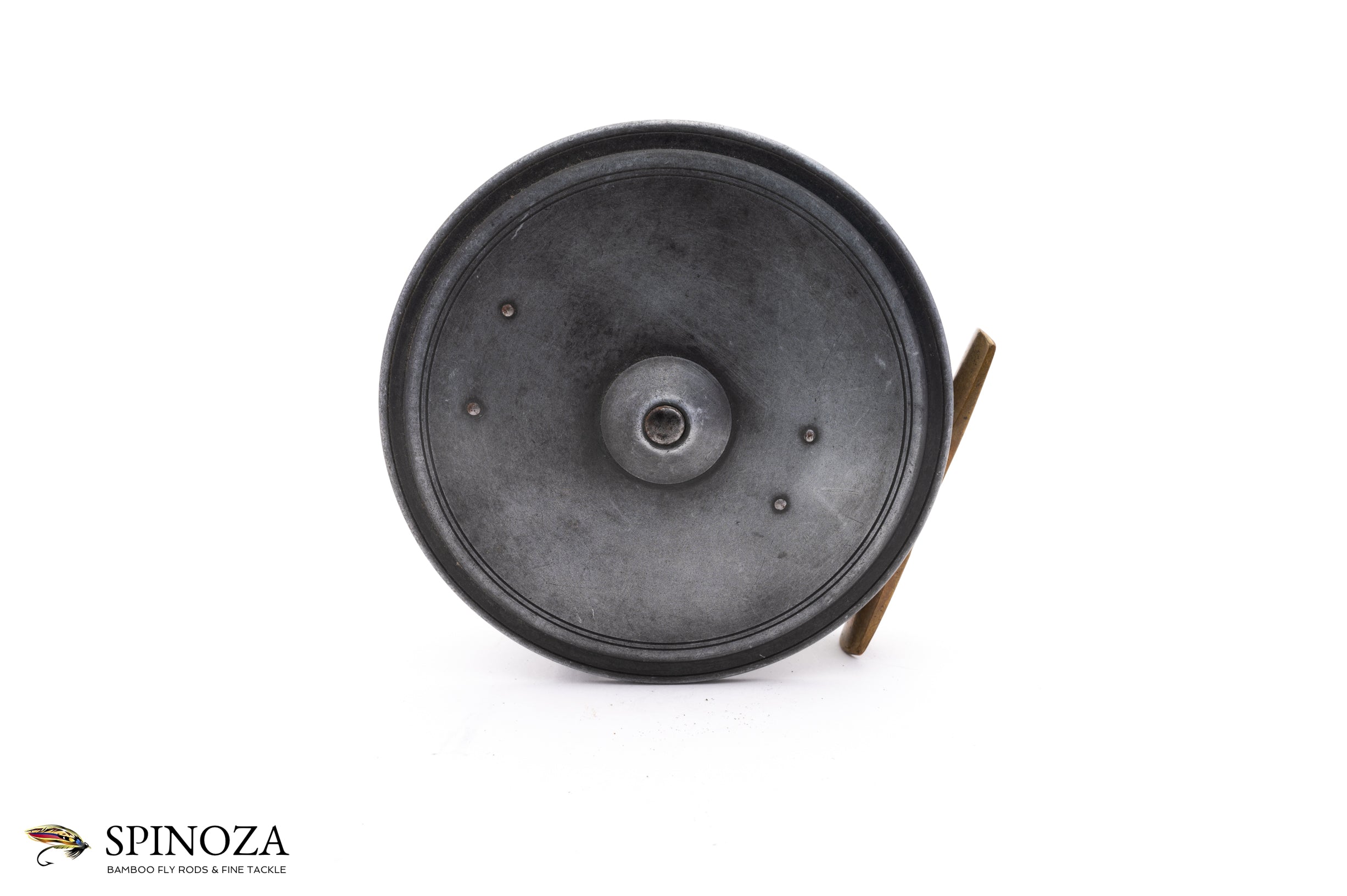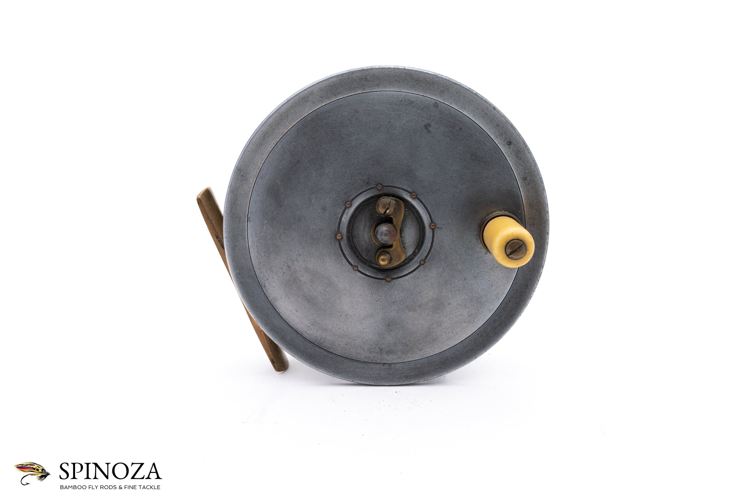 A very nice Dingley Uniqua style reel, 4 1/2" and set up for RHW. No retail or badging of any sort, though the reel has "D1" stamped on the inside of the frame. Excellent overall condition with normal cosmetic wear but no major defects. The patina is good, the brass foot is nice and straight, and the ivorine handle spins freely. Caged drum design. Caliper style check that is clearly set up for RHW, and the reel has a nice loud click. No tensioner. Telephone style latch. No bag.