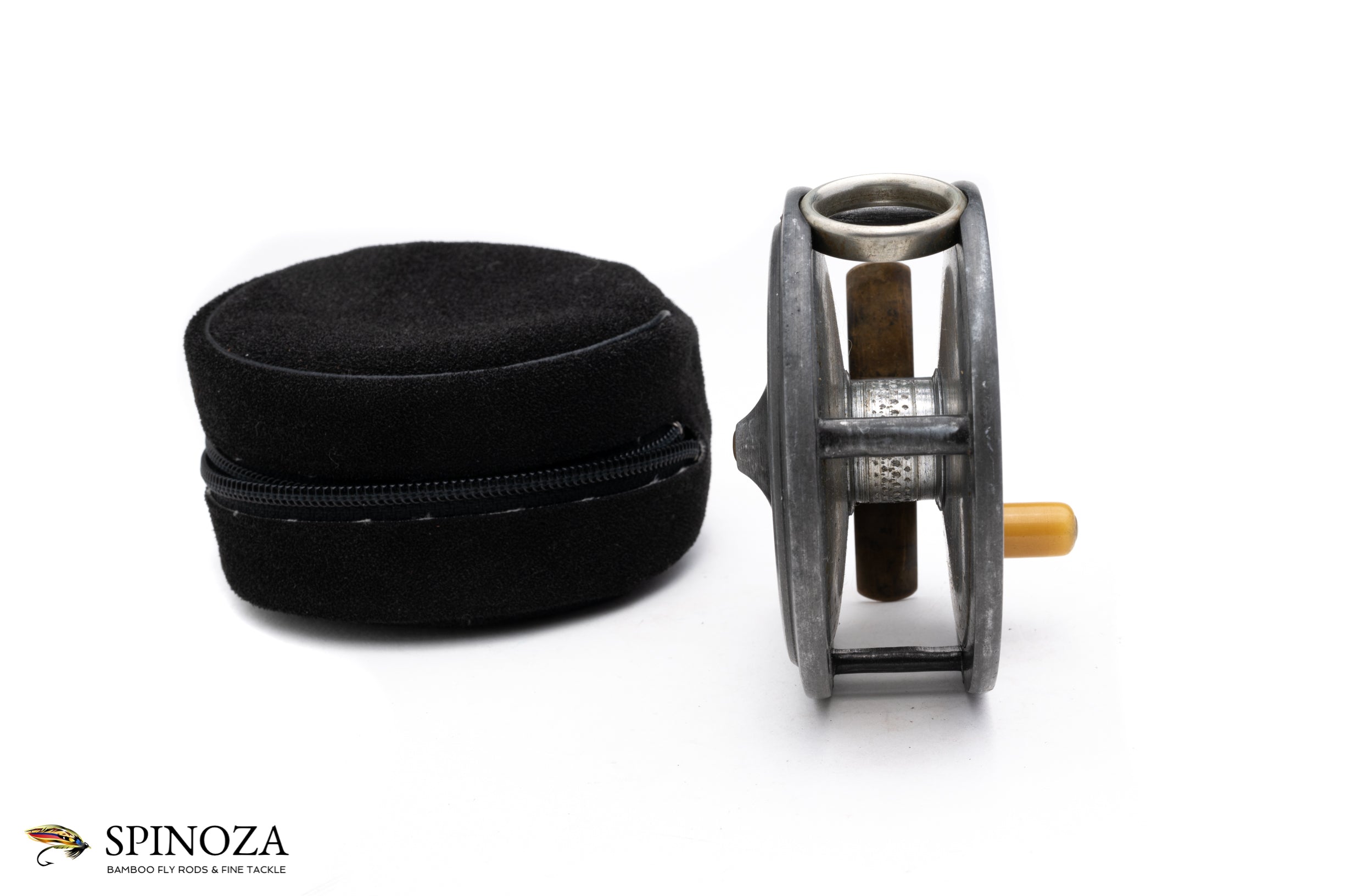 A very nice Dingley reel made for Westley Richards, and set up for rare left-hand wind. 3 1/8" diameter. Very nice condition overall with a tiny bit of cosmetic pitting on the frame edge near the foot, and the foot itself has a tiny bit of twist but it should mount properly. There are no other issues that I could see. The reel's patina is excellent, as are the lineguard, foot, and pillars. Telephone style latch, with an ivorine handle which spins freely. A simple click and pawl check internally with D1 stamped into the inside of the frame. "1" is also stamped into the side of the foot. The reel packs into a simple zipper pouch.