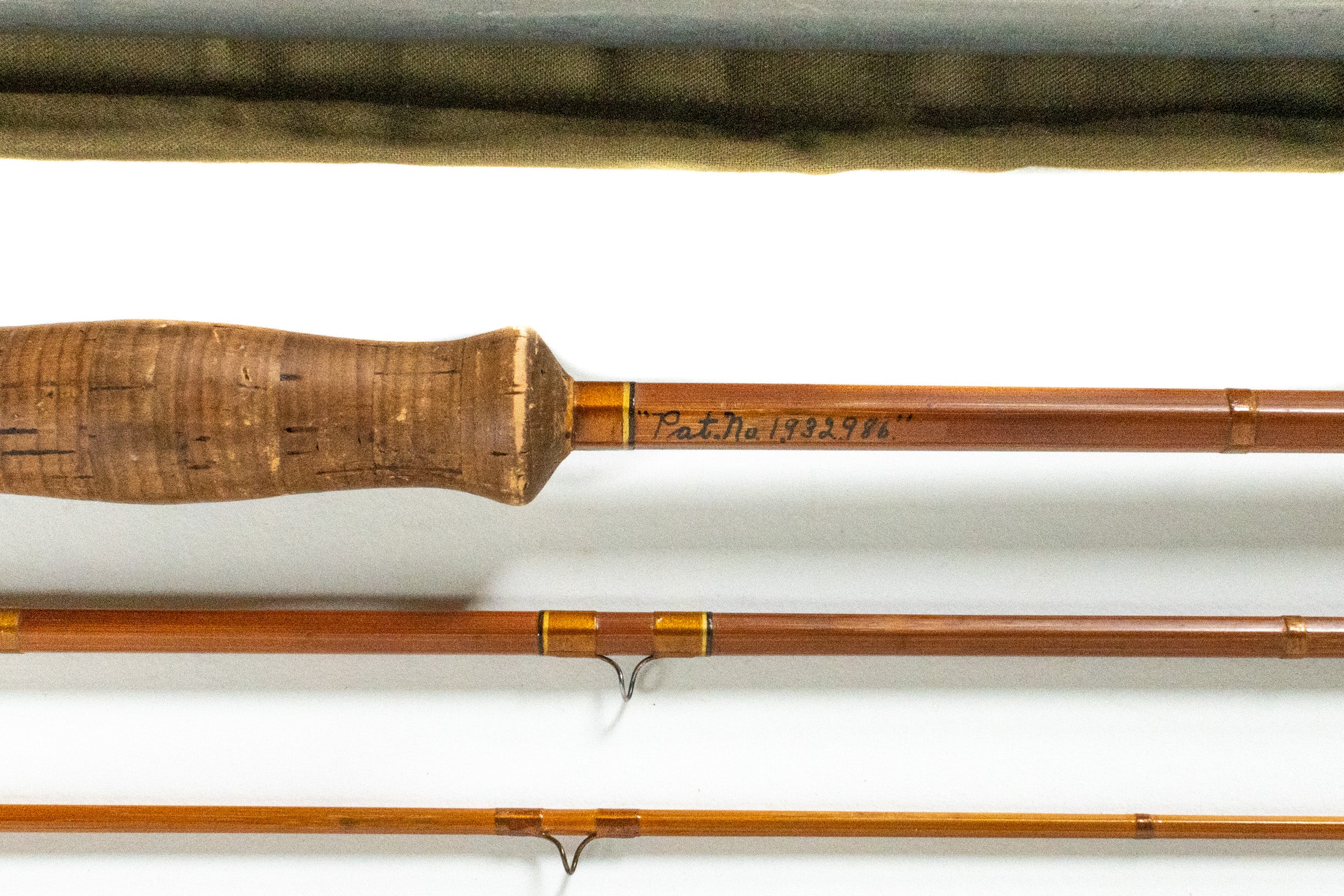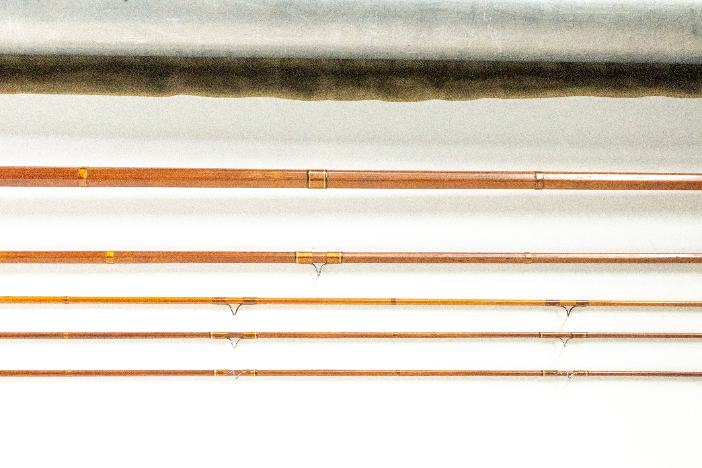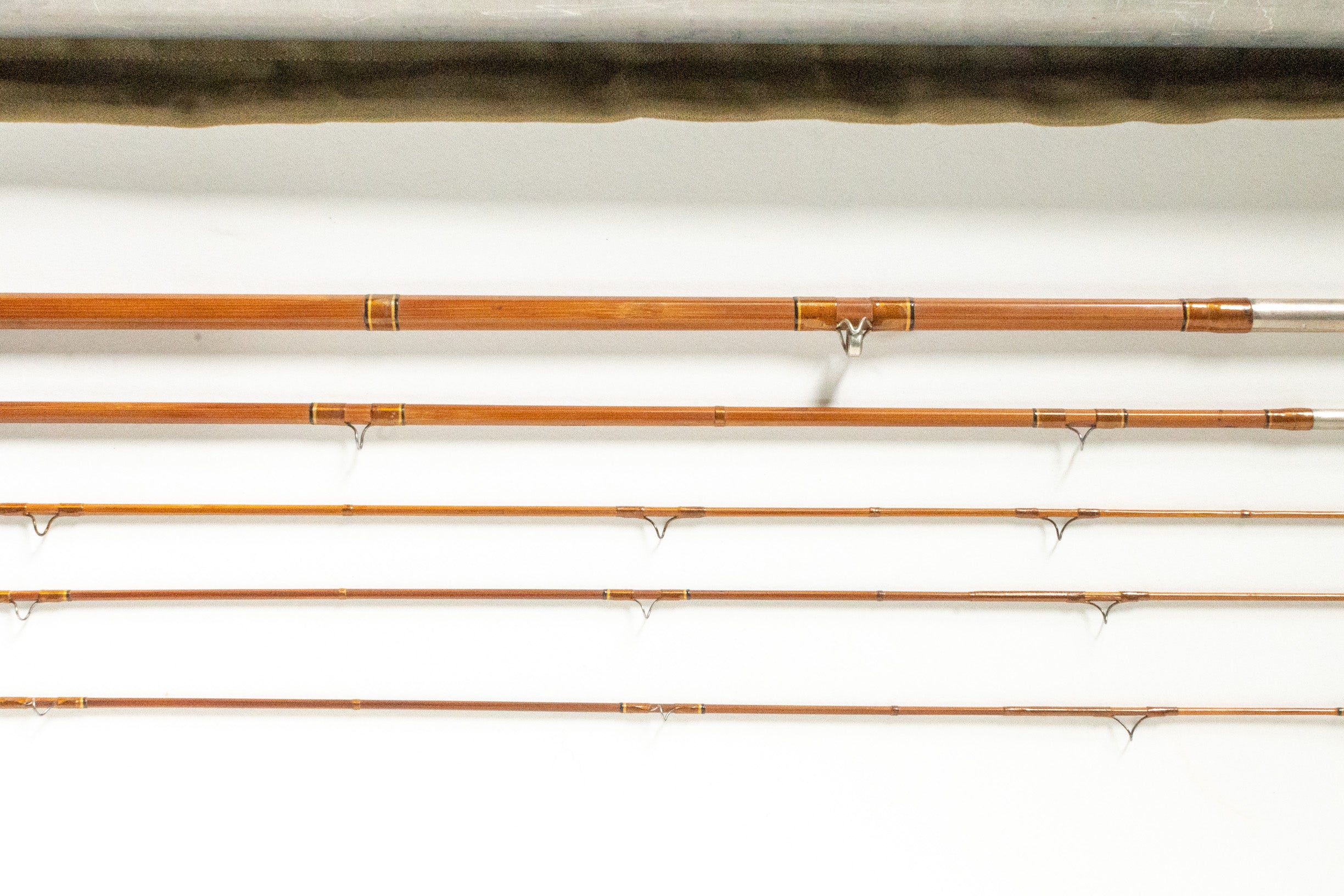 An E.C. Powell fly rod, 9', 3-piece, 3-tip (both short, one 1/8", the other 1/4") and weighing 4.8 oz. Medium action. The butt and mid feel fairly quick and the tips more flexing. Despite this, the rod has fairly large ferrule jumps of 15 thousandths. The two original tips both have scarf joints under the top snake guides and both with 1" long overwraps from those top guides down. One of the tips, the shortest, unfortunately has the top snake guide wrapped on the wrong flat putting it one to the right of the others. The third tip is a 2 opposed node pattern like the rest of the rod but is at least 2 temper shades lighter. All the tips have downstream sets. The main rod wraps are brown with yellow and black edges. The agate stripper is sized for silk lines. The step ferrules are drawn one piece so the step is not soldered, however, the end plugs are soldered and the midsection male is missing its water plug. The grip is 6" long and shaped like a full wells slimmed at the back and the thickest part 3/4 of the way forward. The reel seat spacer is black bakelite with an aluminum uplocking screwlock and the die stamp on the mortise states "E.C. Powell, Maker, Marysville, Cal" in a circular cartouche. A non-original sticker states the rod is a "Buddy Powell Dry Fly Accuracy" and "hollow built". Original tube and bag.