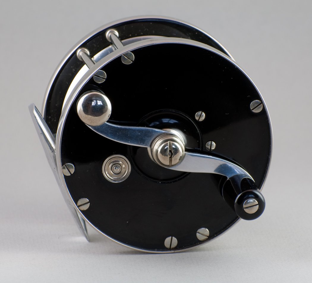 For sale here is a size 3/0 Edward Vom Hofe Model 423 Restigouche Salmon fly reel in excellent condition. 3 5/8" diameter, spool width 1 7/16", weight 11 oz. This reel carries the 1902 patent "Edward Vom Hofe Maker -N.Y.-" marked drag knob cover, and has a strong click and fully functional adjustable drag with bright red indicator dots. German silver screws, pillars, rims, on/off knob, handle arm screw, handle counterbalance cap, and drag adjustment knob. Aluminum handle, foot and spool flanges. The foot has been very neatly filed on one end as can be seen in the photos. Scratch and crack free side plates. A wonderful example for the EVH fisherman/collector!