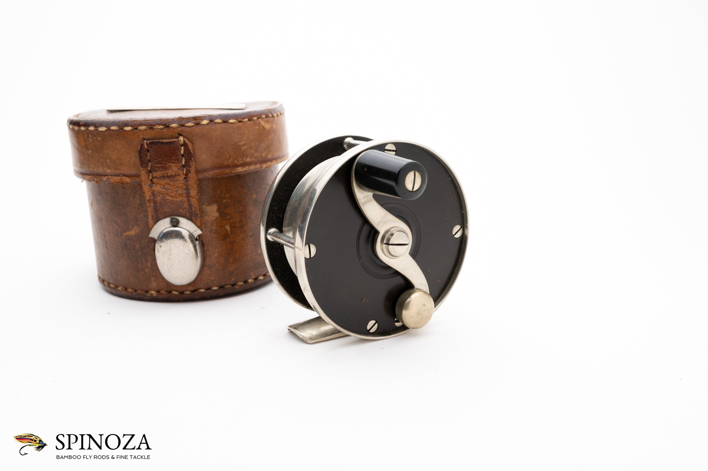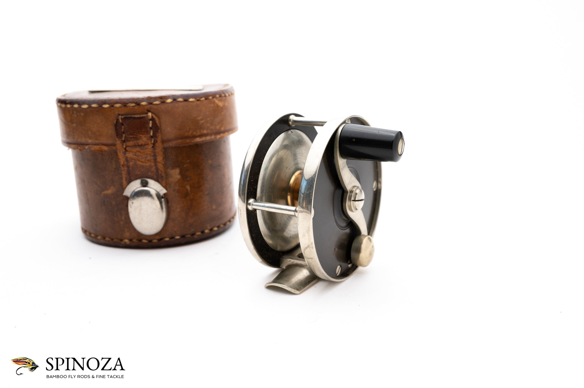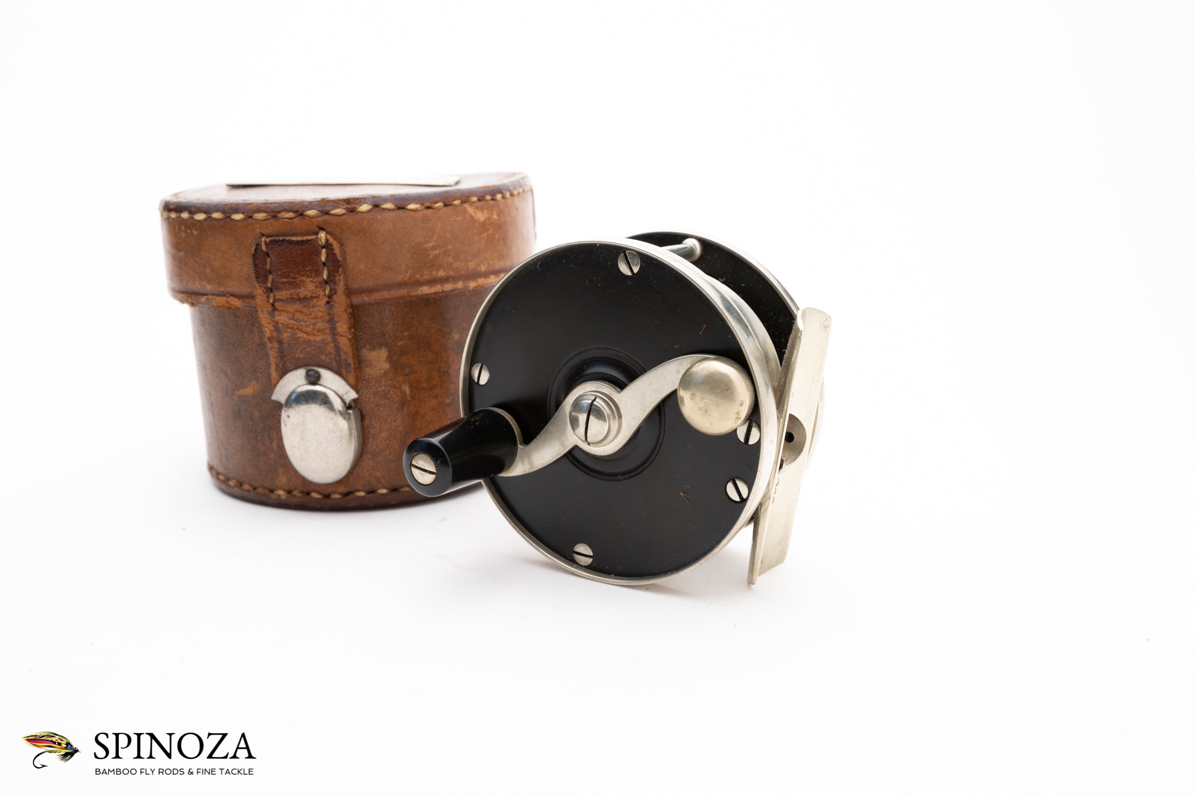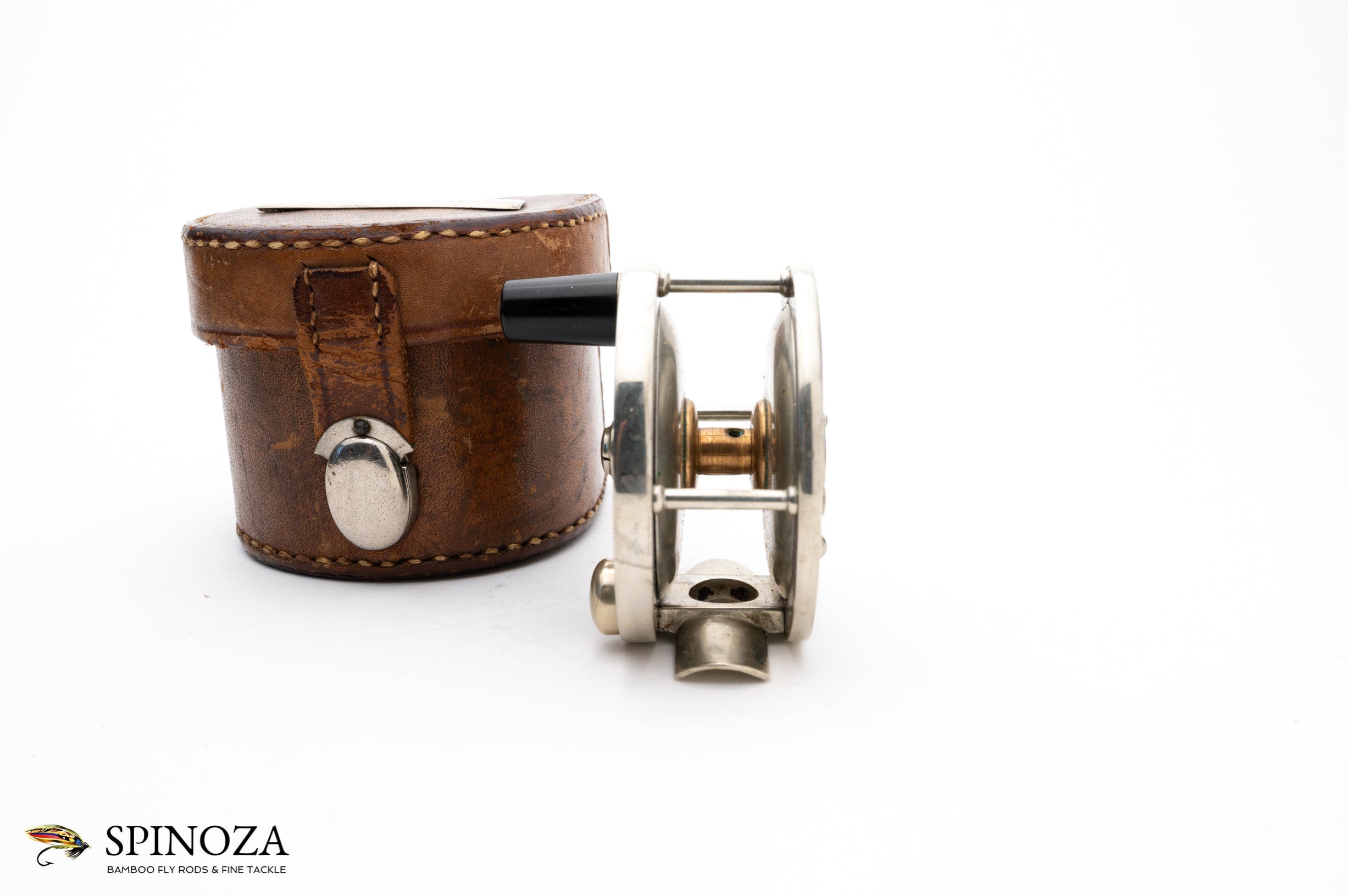 A superb Edward vom Hofe Peerless reel in size 3 ½. This circa 1905 RHW reel measures 2 1/2” x 3/4”, and it is made of nickel silver and hard rubber. It carries the “Jan 23 83” stamping on the sliding grease cap and the model 355 and sizing stamps on the foot. It has the nicely sculptured nickel silver pillars and the “S” shaped handle that one associates with Edward vom Hofe. This reel has survived without a scratch, buggered screw or chips in the hard rubber, however the foot has been shortened slightly when you compare it to the original (though nicely done). And it favors LHW. It comes in a marked “E vom Hofe NY” block leather case with a unique nickel silver clasp in a rare style that I don't think I have ever seen. This reel would make a centerpiece in any Edward vom Hofe collection.
