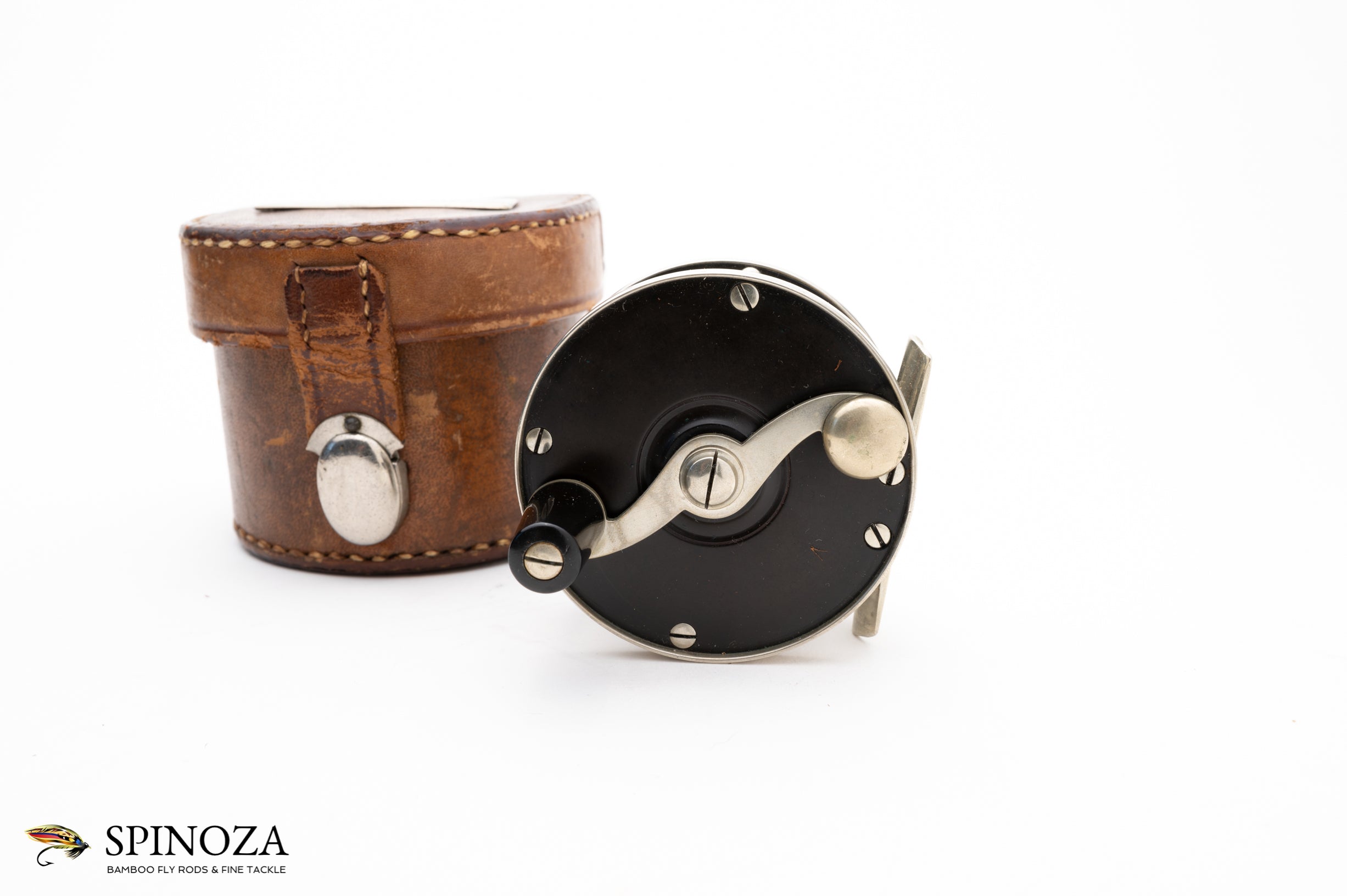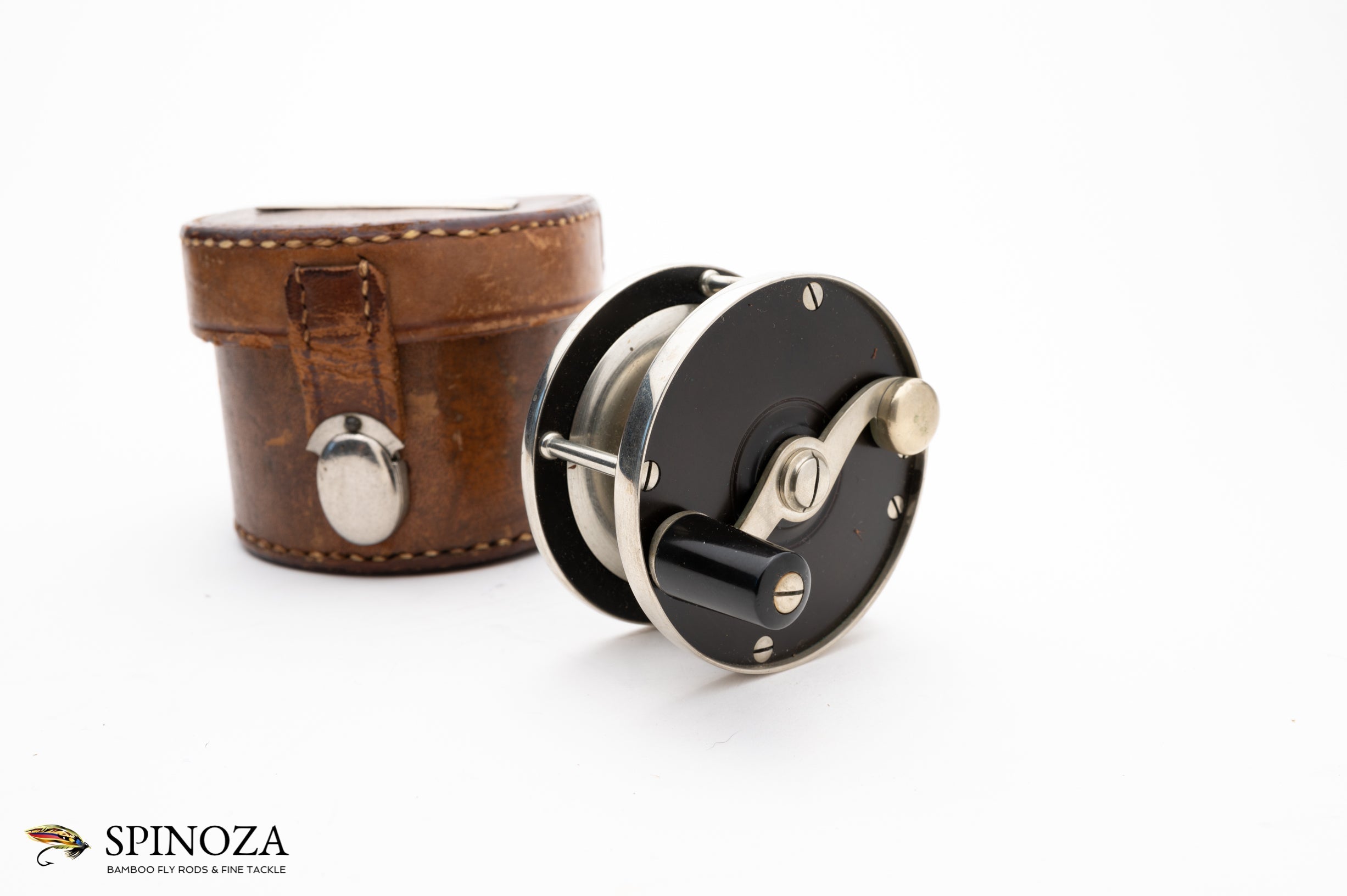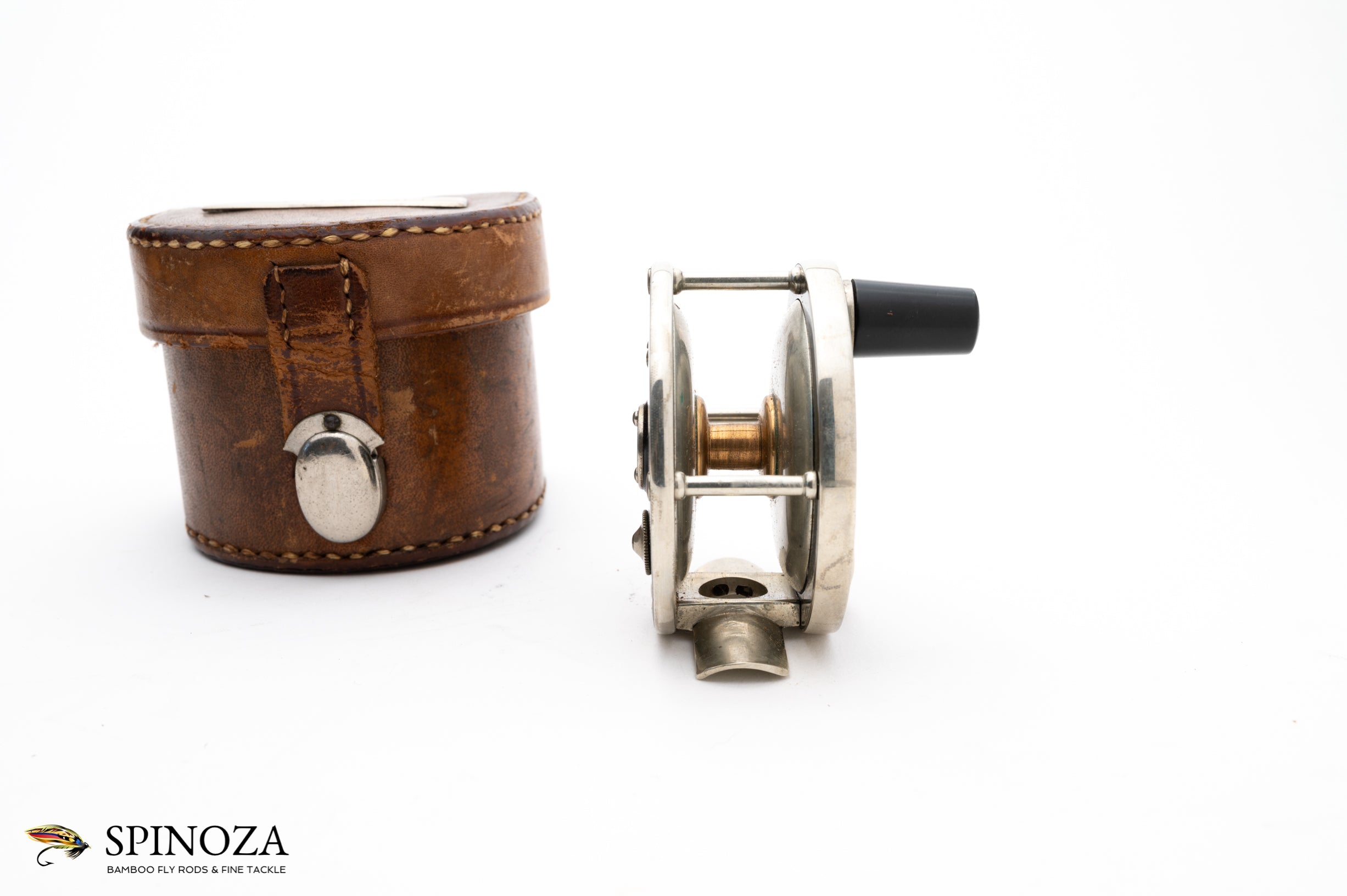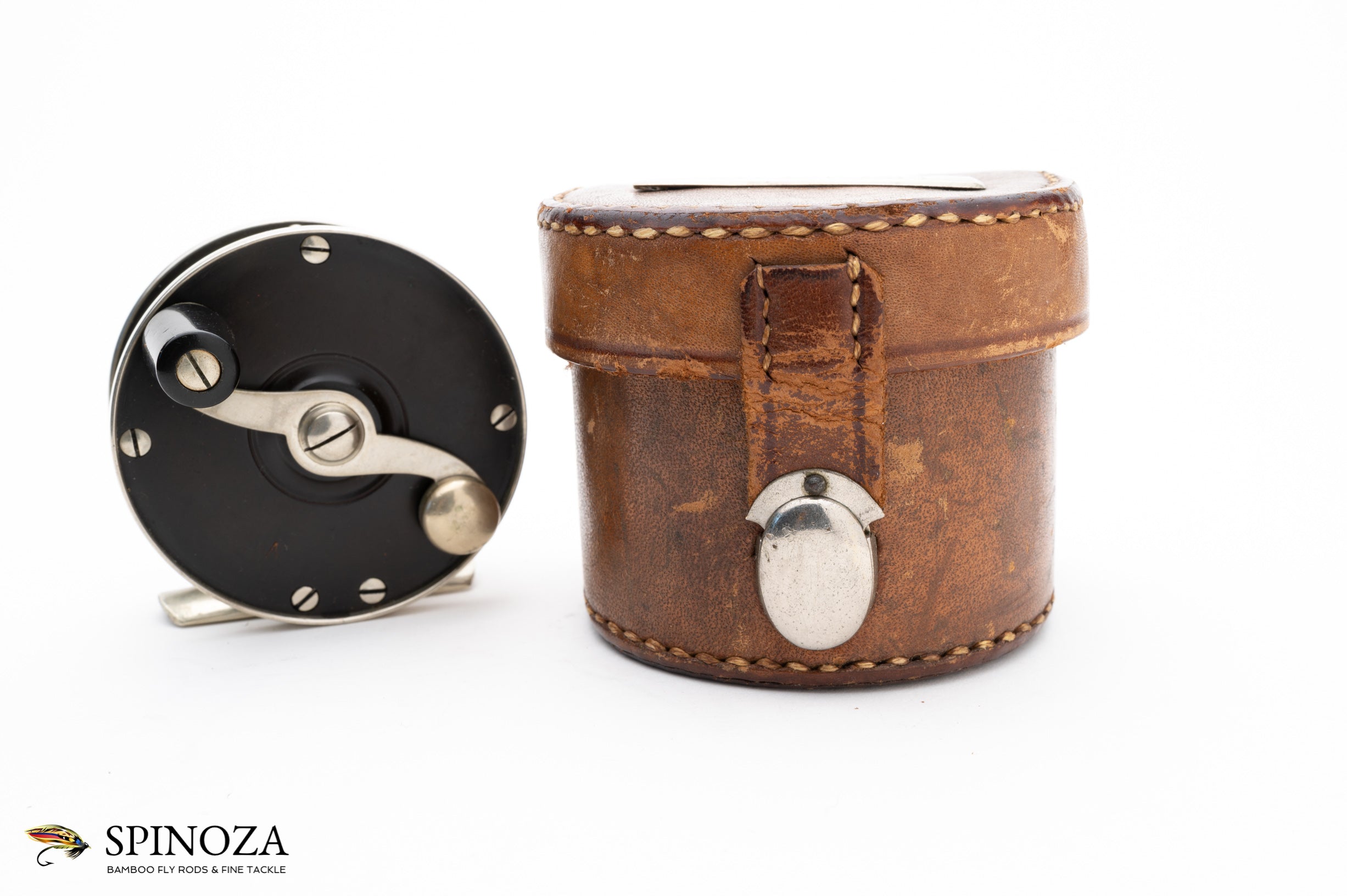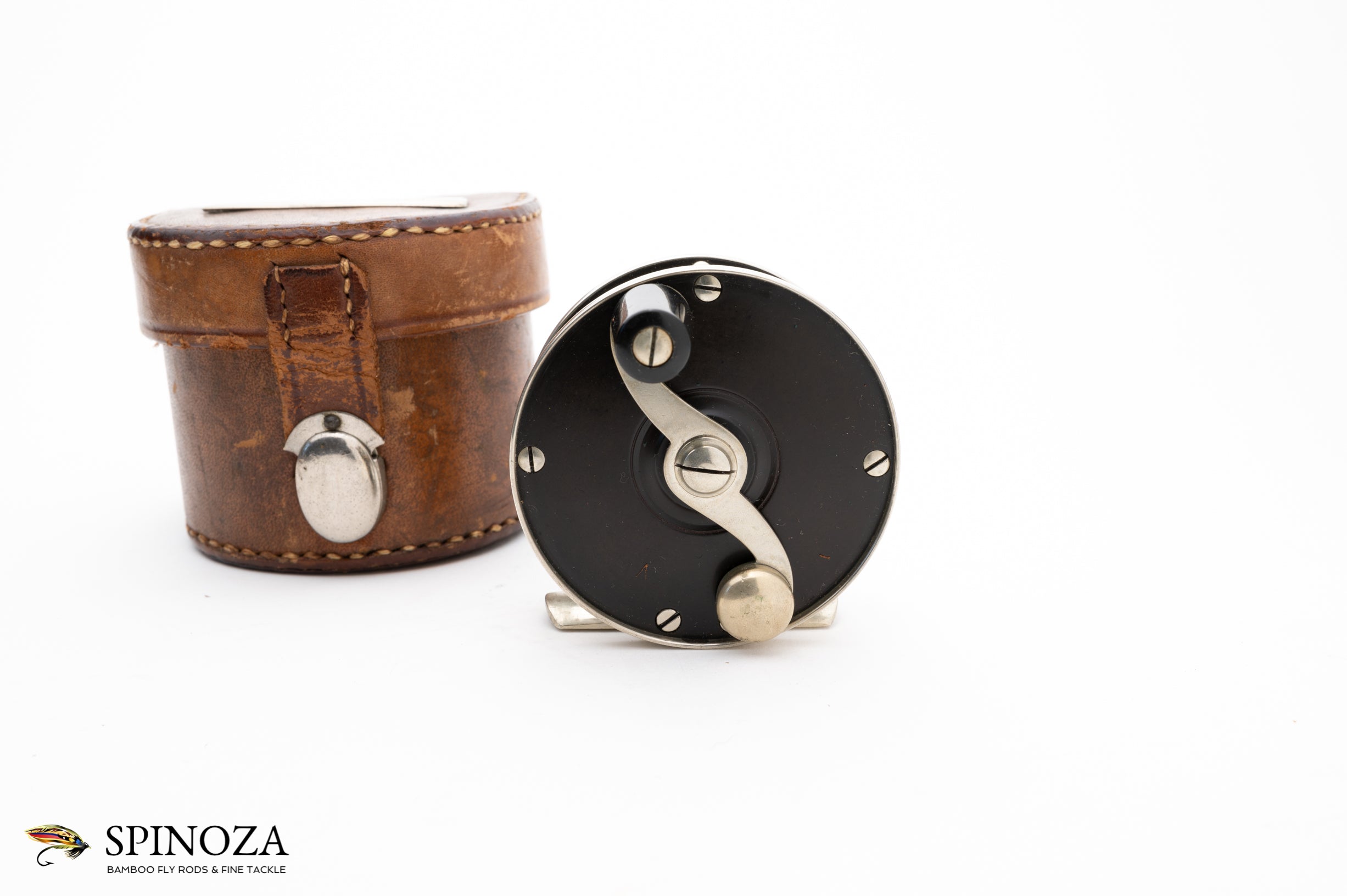 A superb Edward vom Hofe Peerless reel in size 3 ½. This circa 1905 RHW reel measures 2 1/2” x 3/4”, and it is made of nickel silver and hard rubber. It carries the “Jan 23 83” stamping on the sliding grease cap and the model 355 and sizing stamps on the foot. It has the nicely sculptured nickel silver pillars and the “S” shaped handle that one associates with Edward vom Hofe. This reel has survived without a scratch, buggered screw or chips in the hard rubber, however the foot has been shortened slightly when you compare it to the original (though nicely done). And it favors LHW. It comes in a marked “E vom Hofe NY” block leather case with a  unique nickel silver clasp in a rare style that I don't think I have ever seen. This reel would make a centerpiece in any Edward vom Hofe collection.