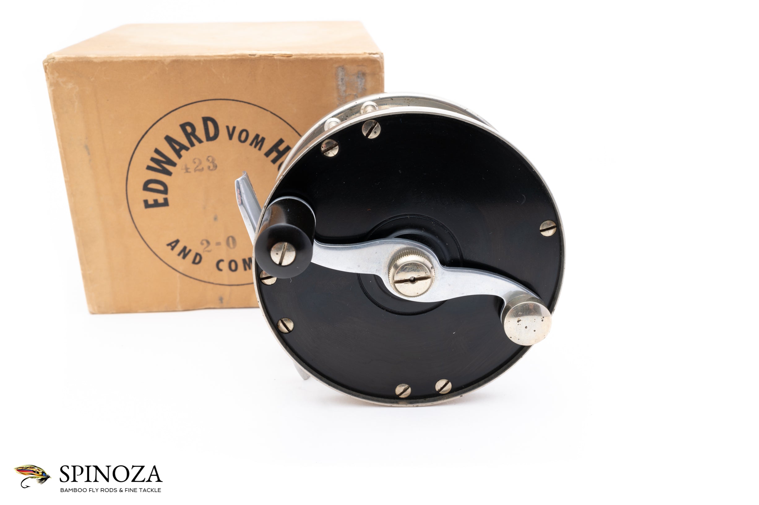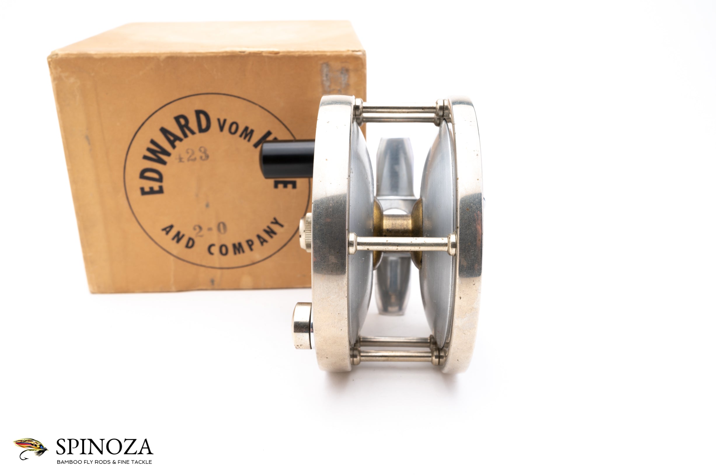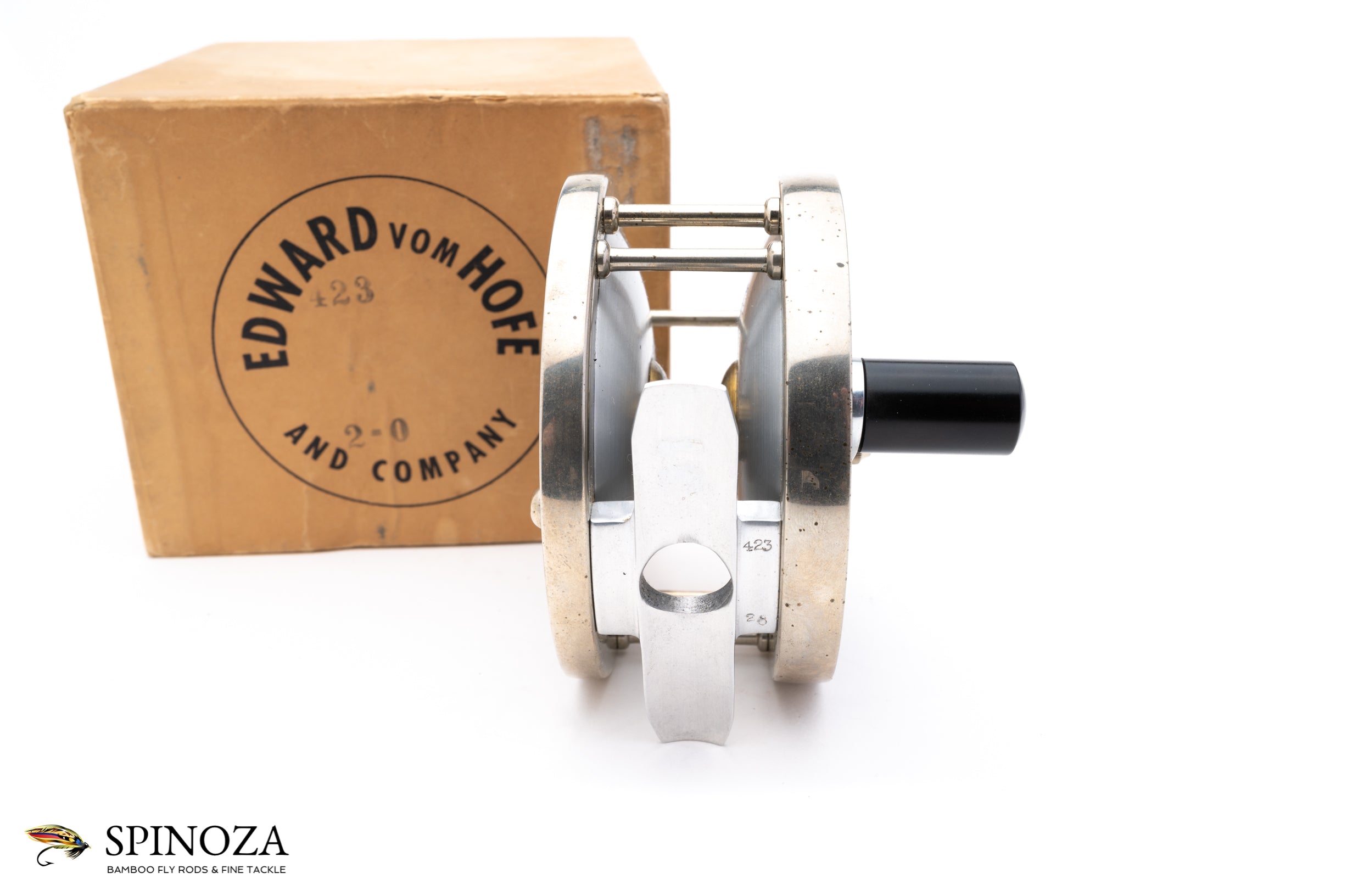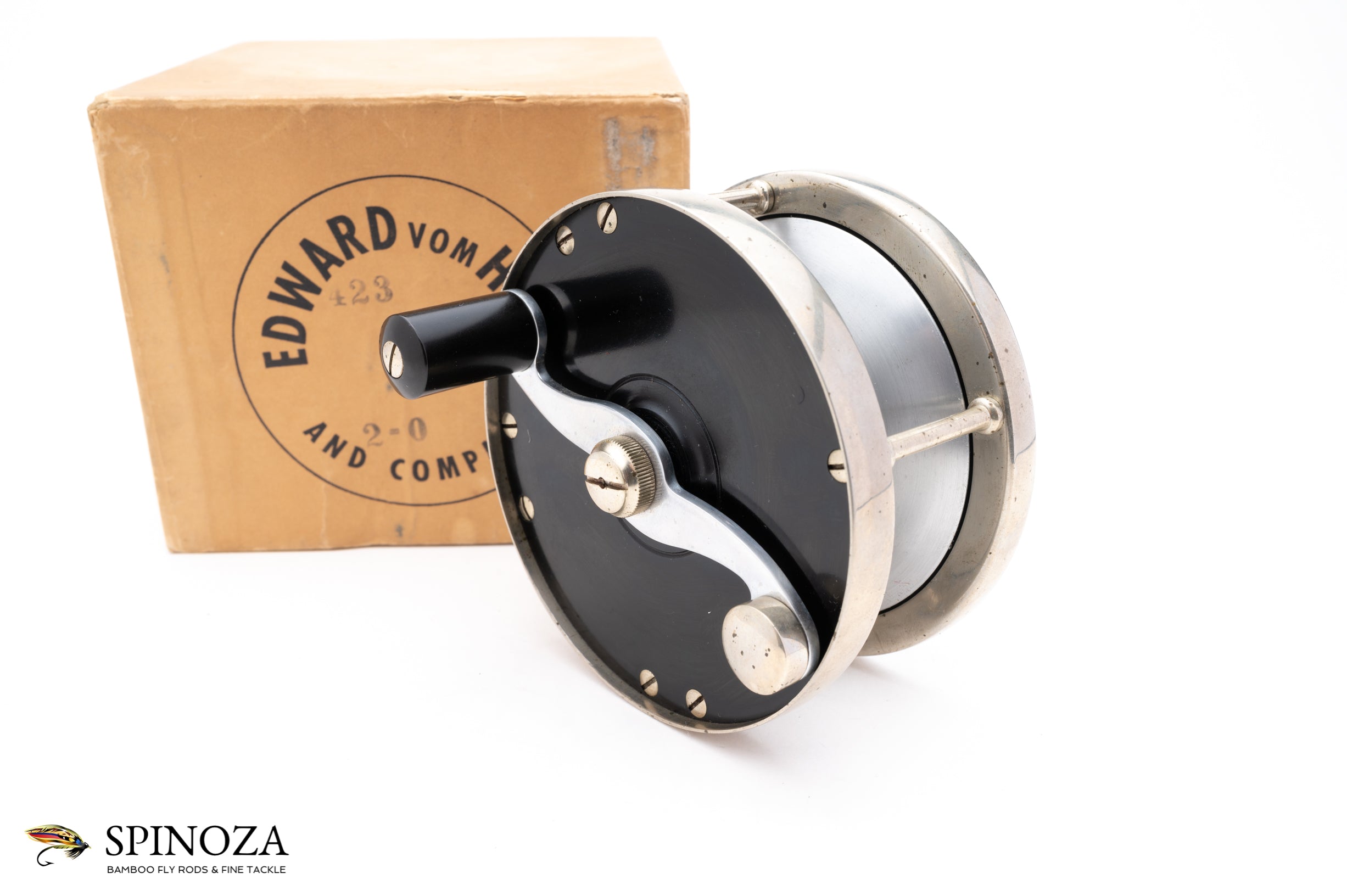 An excellent Edward Vom Hofe Restigouche Salmon Reel, model 423, in 2/0 size. 3 5/8" diameter with a 1 7/8" frame width (recall that Restigouche models did not always follow the standard Vom Hofe sizing conventions and this one is slightly larger than a "standard" 2/0). Set up for RHW. Philadelphia era. Superb original condition. The frame has some minor and normal discoloration spots but no dings, noticeable scratches, or other evidence of much use. The hard rubber sideplates are smooth and clean, with just the faintest whisper of two minor scratches on the crankside plate. Full length foot with "423" and "2/0" stamped into the crossbar. The drag is in good mechanical shape and adjusts nicely (the red lacquer on a few of the drag indicator has faded but most are present). The screws are in excellent condition overall with just the faintest suggestion of use. Comes in the original Vom Hofe Box. One of the nicer later era examples of this model and size that I've come across. A salmon fishing classic.