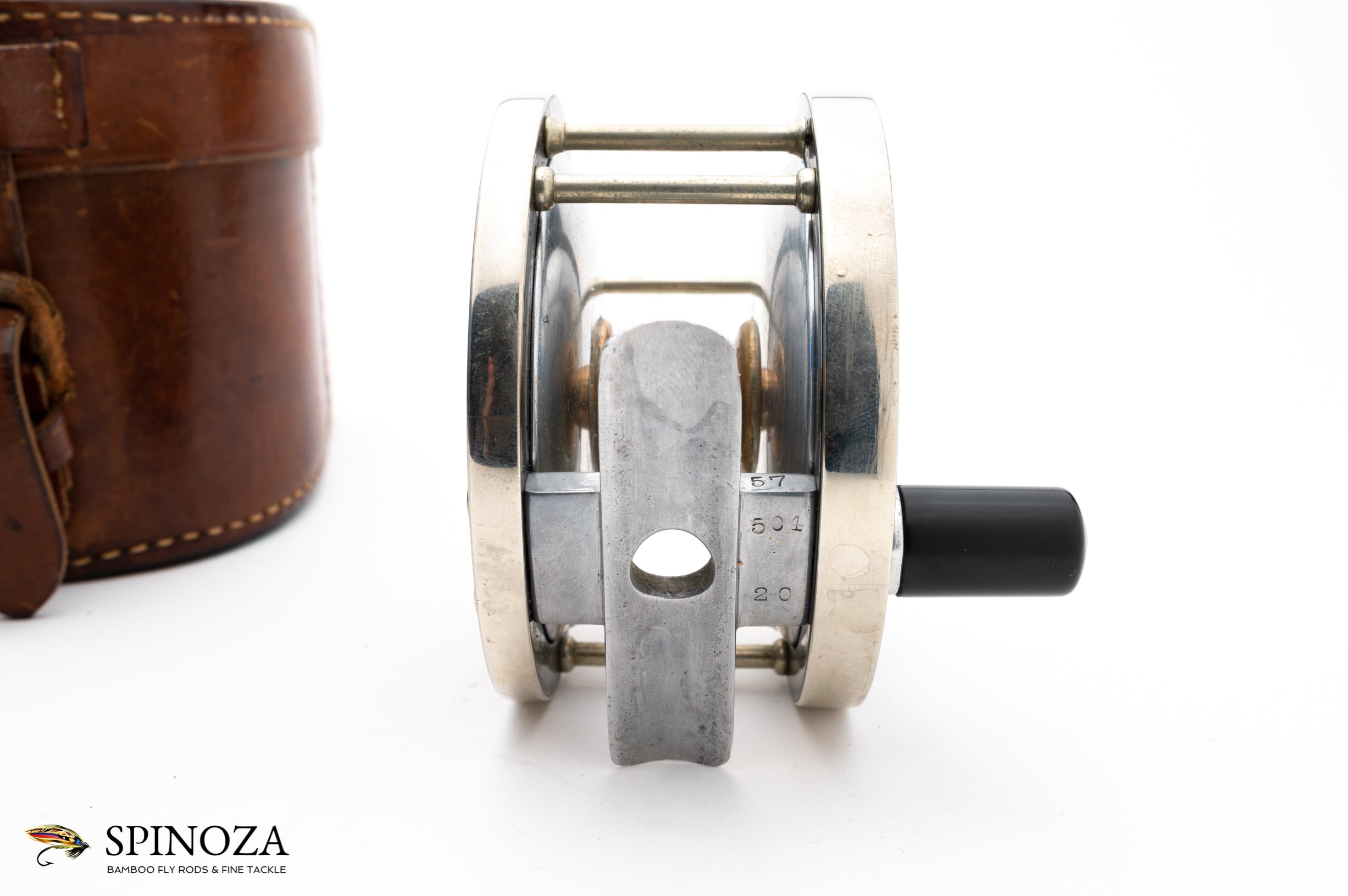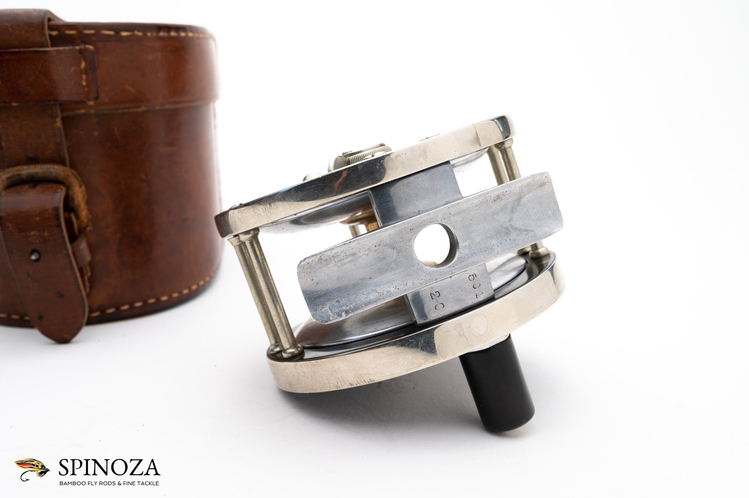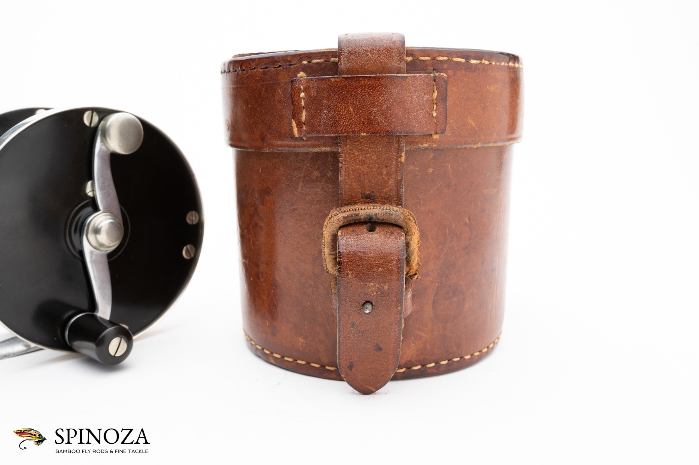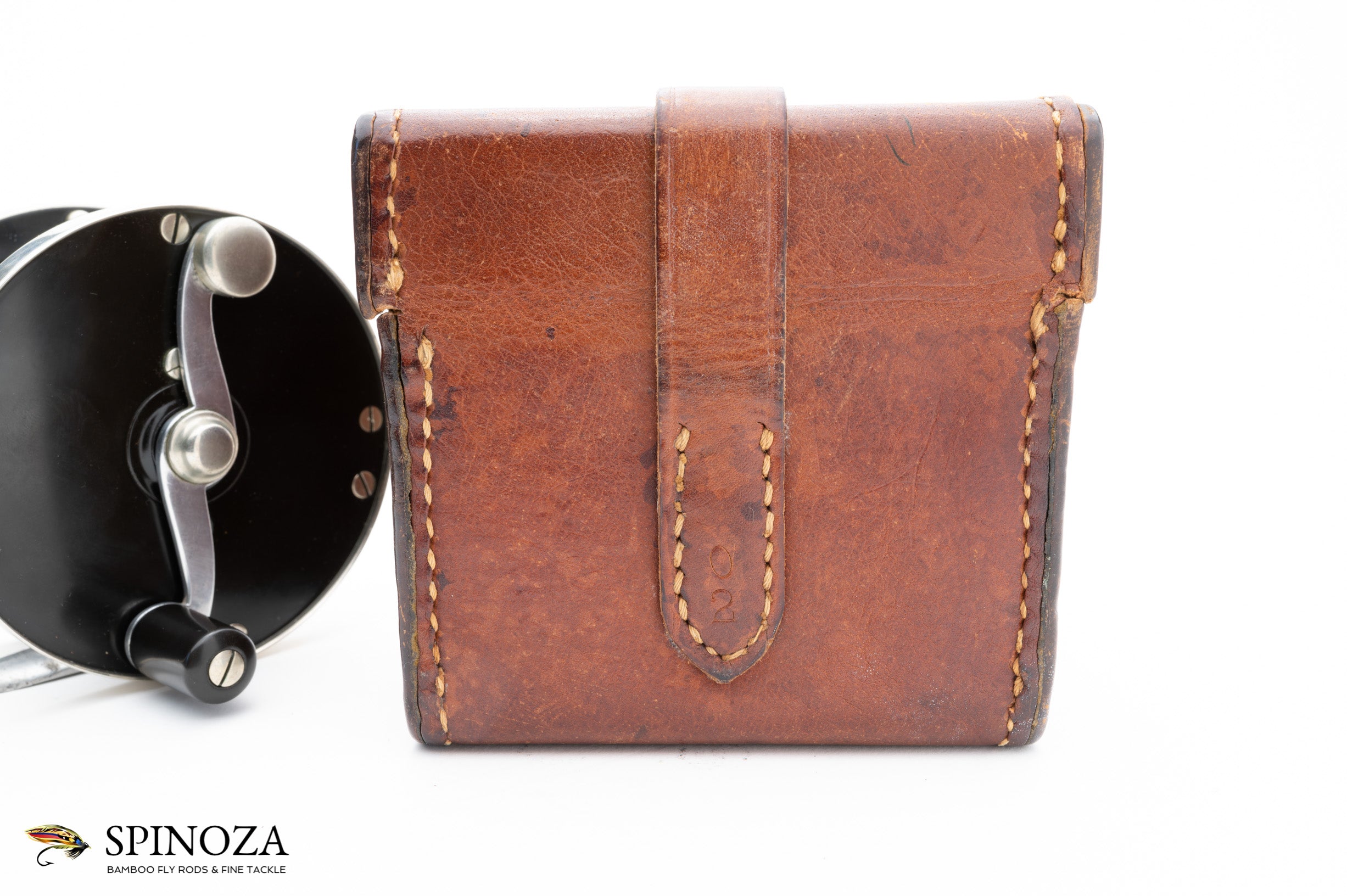 A superb Edward Vom Hofe 504 Tobique multiplying salmon reel, set up for RHW. 2/0 size, 3 1/2" diameter with a 1 1/4" spool width. Hard rubber plates, nickel silver rims and pillars, the usual aluminum foot that is full-length, and the classic "S" shaped handle. The screws do not show abuse at the hands of a screwdriver, and the seven-portion drag disk works perfectly and can hold almost any salmon in the pool. The reel was made and owned by Gordon S. Rentschler, then Chapman of First National City Bank in New York, and there is a repair ticket included with his name and address on it. This example, made in 1935, comes in the original E vom Hofe leather D block case that is, too, in beautiful condition.