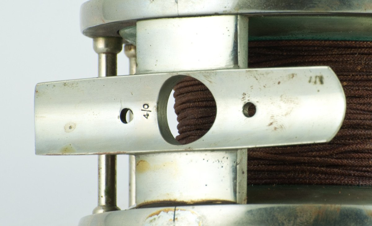 This reel carries the Sep 2, 1879 patent on the drag adjustment knob under the handle arm, as well as the Jan 23, 1883 patent mark for the sliding click drag. German silver safety bands and pair of roller bars, one single and one double. The reel has a strong click and fully functional adjustable drag under the handle (this was the second model with seven detent flat arrowhead pointer, after the pin in detent system of the first model, and prior to the drag knob moving to the back plate in later models). This reel has a screw-in S-handle reel with a german silver counterbalance. Full-length and un-filed foot with two extra holes, also representing an early feature of these reels. It is believed that they started stamping the serial numbers on the feet circa 1908.