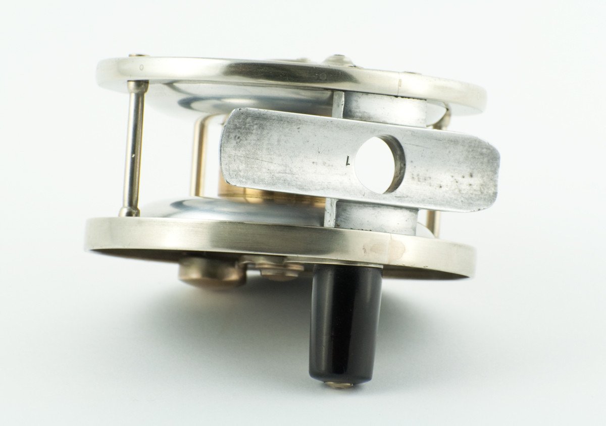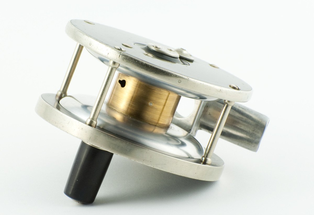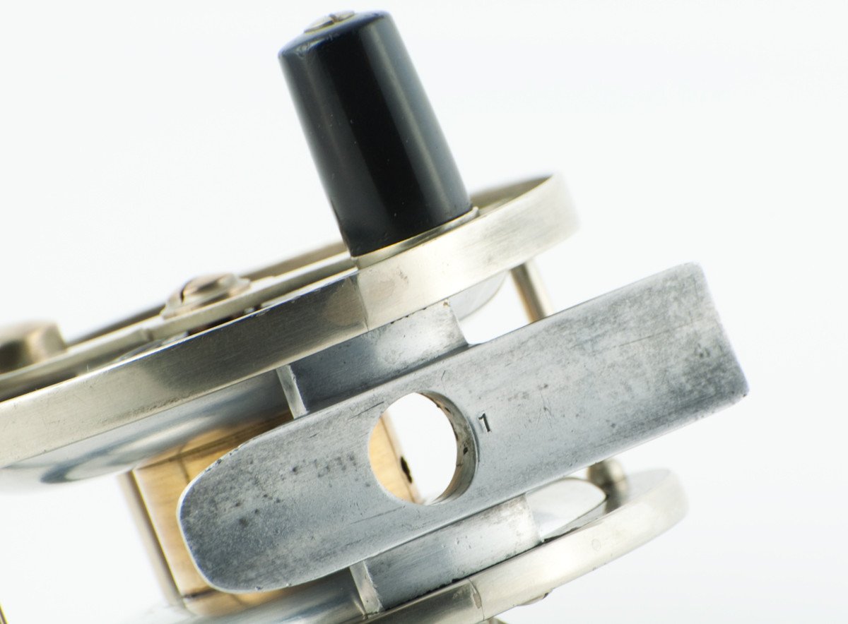 For sale here is a scarce early Edward Vom Hofe Model 355 Fly Reel - Size 1. Late 19th century reel owing to the lack of model number on the reel foot (instituted at the turn of the century), or serial number (instituted in 1908). This model was later dubbed the "Peerless" in 1911. German silver / hard rubber construction. The hard rubber side plates are in excellent condition with no cracks. Mechanically the reel remains in excellent condition. The oil cap has the 1883 patent stamp. This is an early reel before serial numbers were instituted and when EVH made the reels with offset reel feet. I've included a photo of two other reels with similar offset reel feet from a similar era. This reel also has a large arbor that may have been a custom feature requested by the customer. The reel comes with its original Edward Vom Hofe stamped leather reel case with a missing strap, otherwise in good original condition.