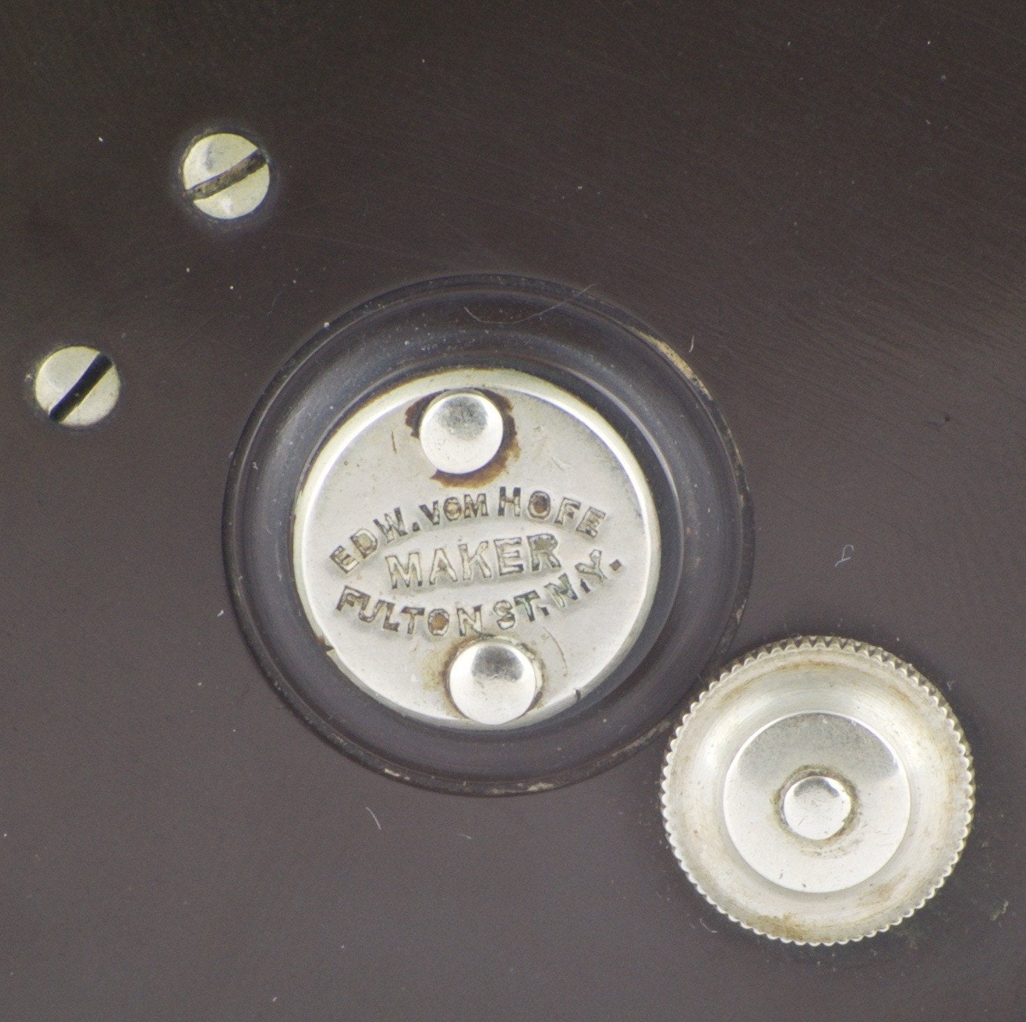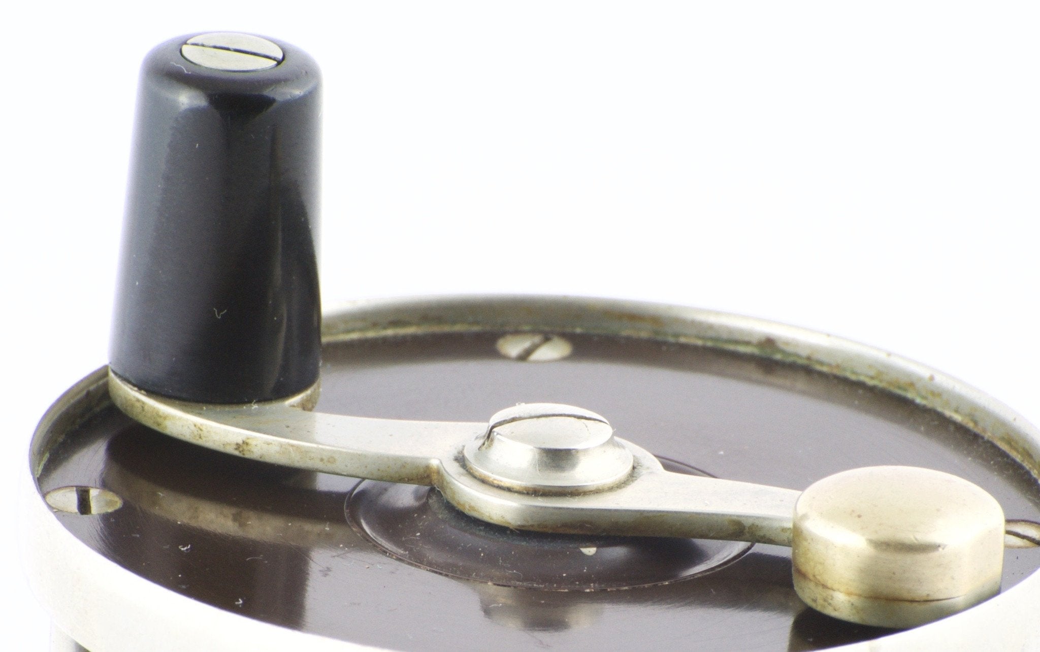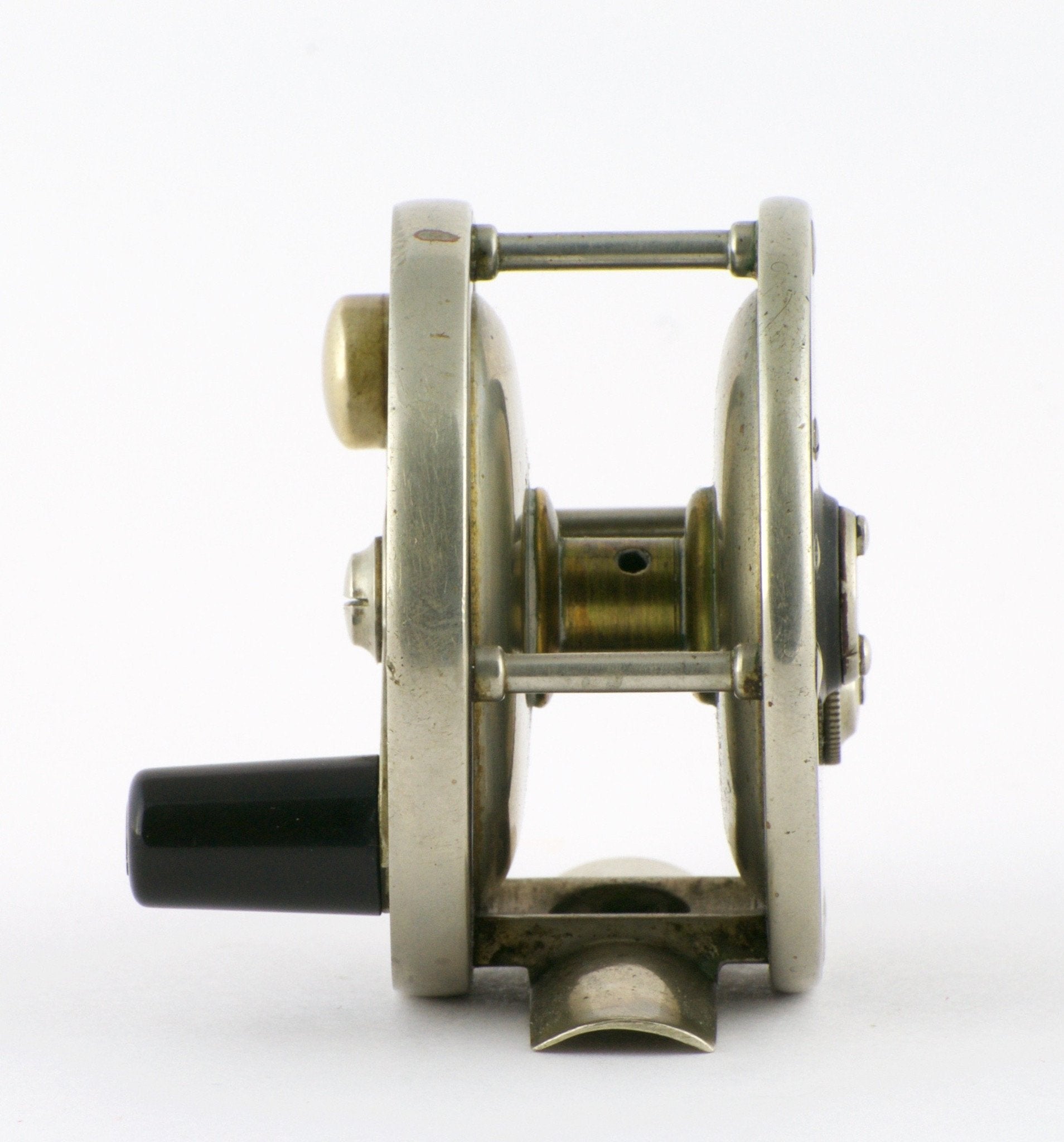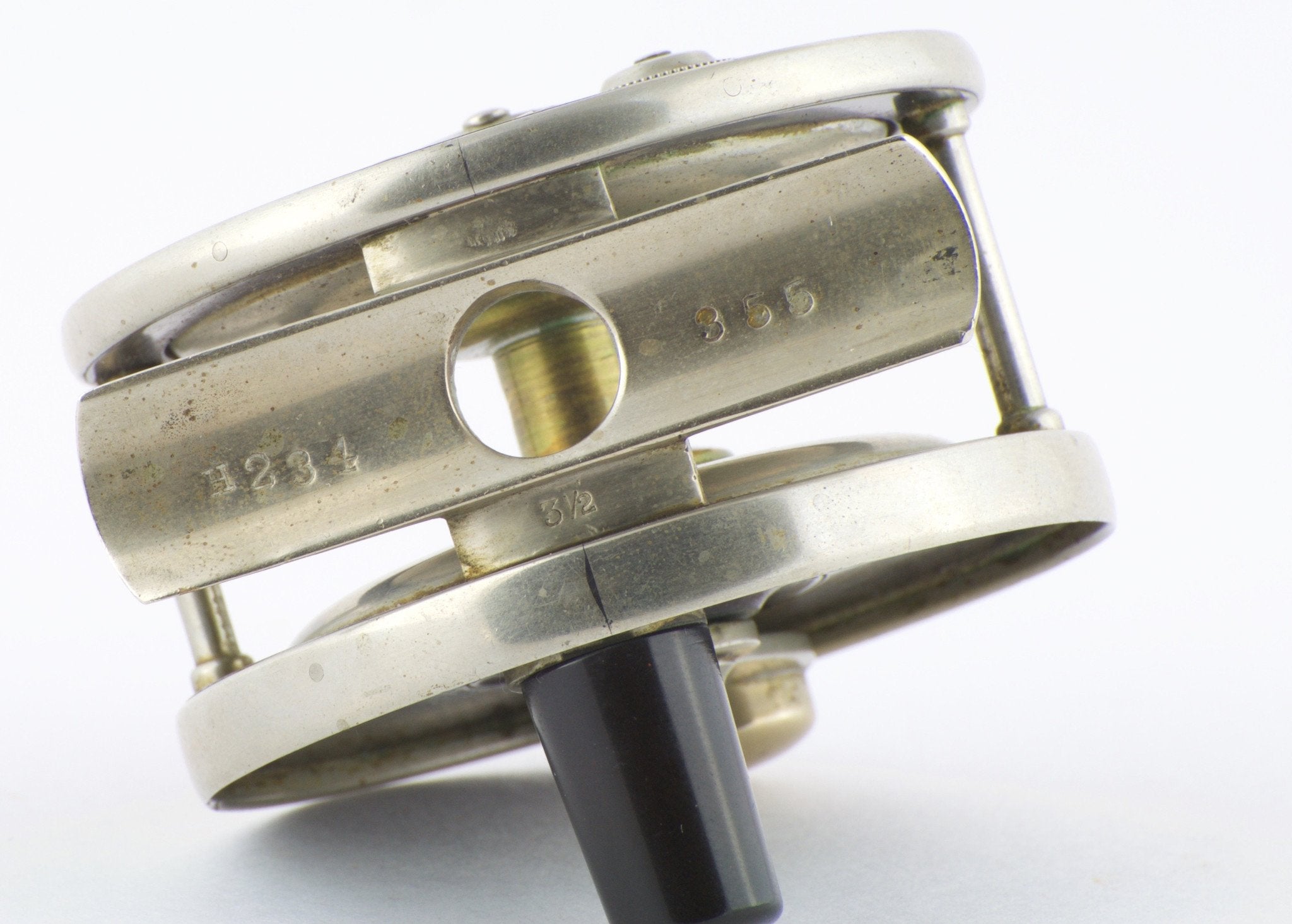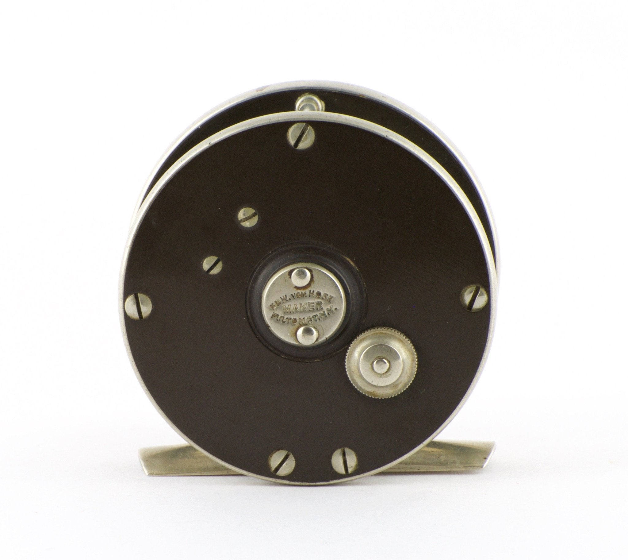 For sale here is a scarce Edward Vom Hofe Model 355 Peerless fly reel - Size 3 1/2. Fair to good condition. Made in 1915 reel. Needs servicing inside - gear teeth don’t engage the pawl properly. Small rim ding. Fulton St. oil cap stamp - not often seen. Ebonite in good condition.