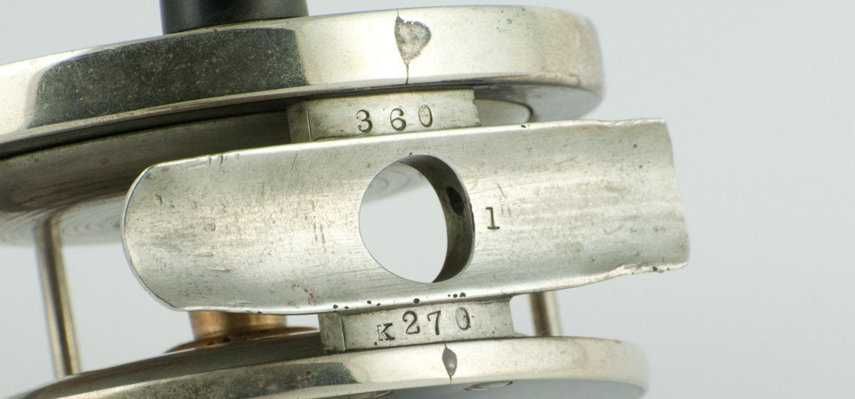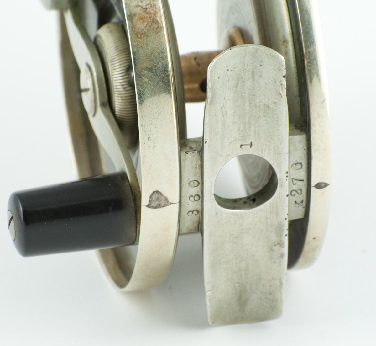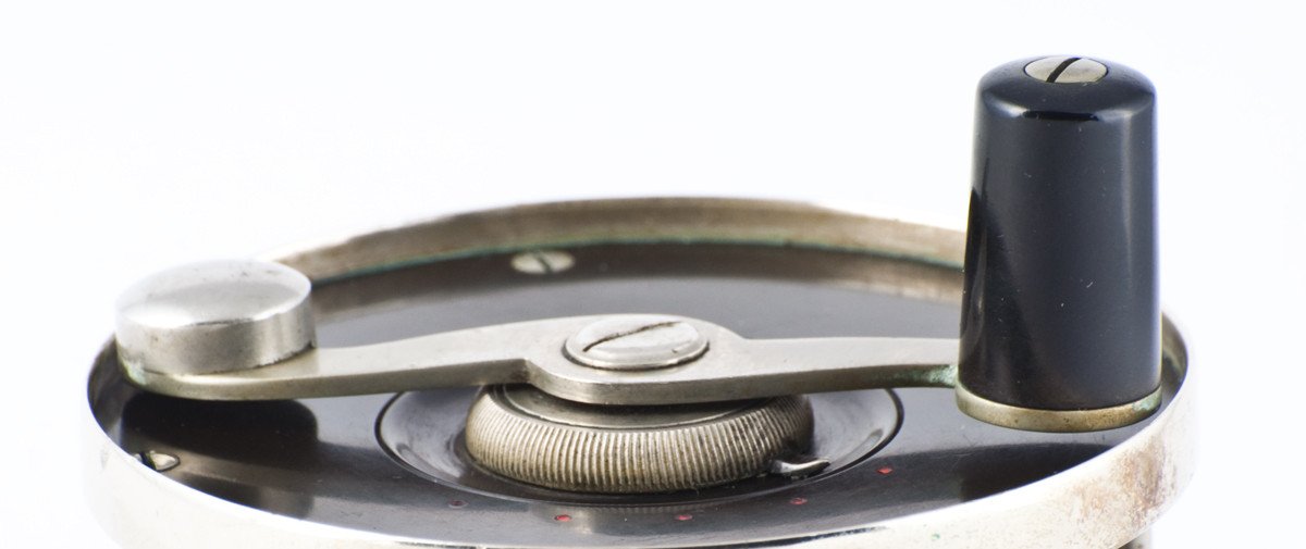 For sale here is an Edward Vom Hofe Model 360 Perfection fly reel in excellent overall condition. Size 1. This reel carries the '83 patent date on the oil cap. Serial number K270 dating the reel to 1918. German silver / hard rubber construction. No chips/cracks in the hard rubber. The reel has an adjustable drag and click and the five detent arrowhead pointer drag feature with red dot indicators. The reel foot is original, full length and a little kinked/bent, but not overly objectionable. Mechanically the reel remains in excellent condition with a great drag and smooth-running operation.