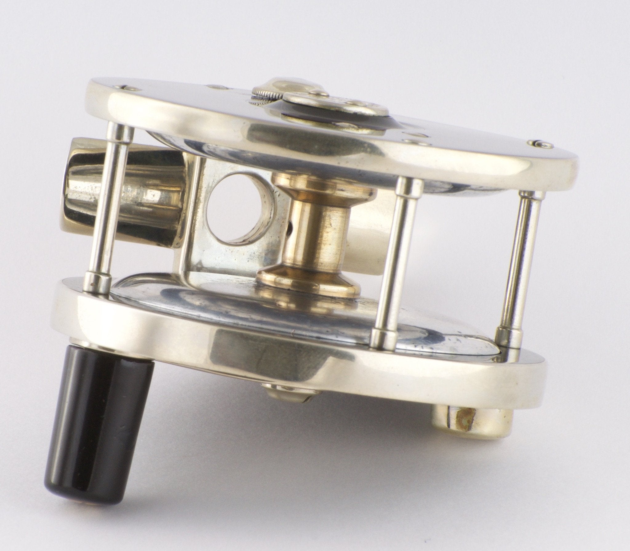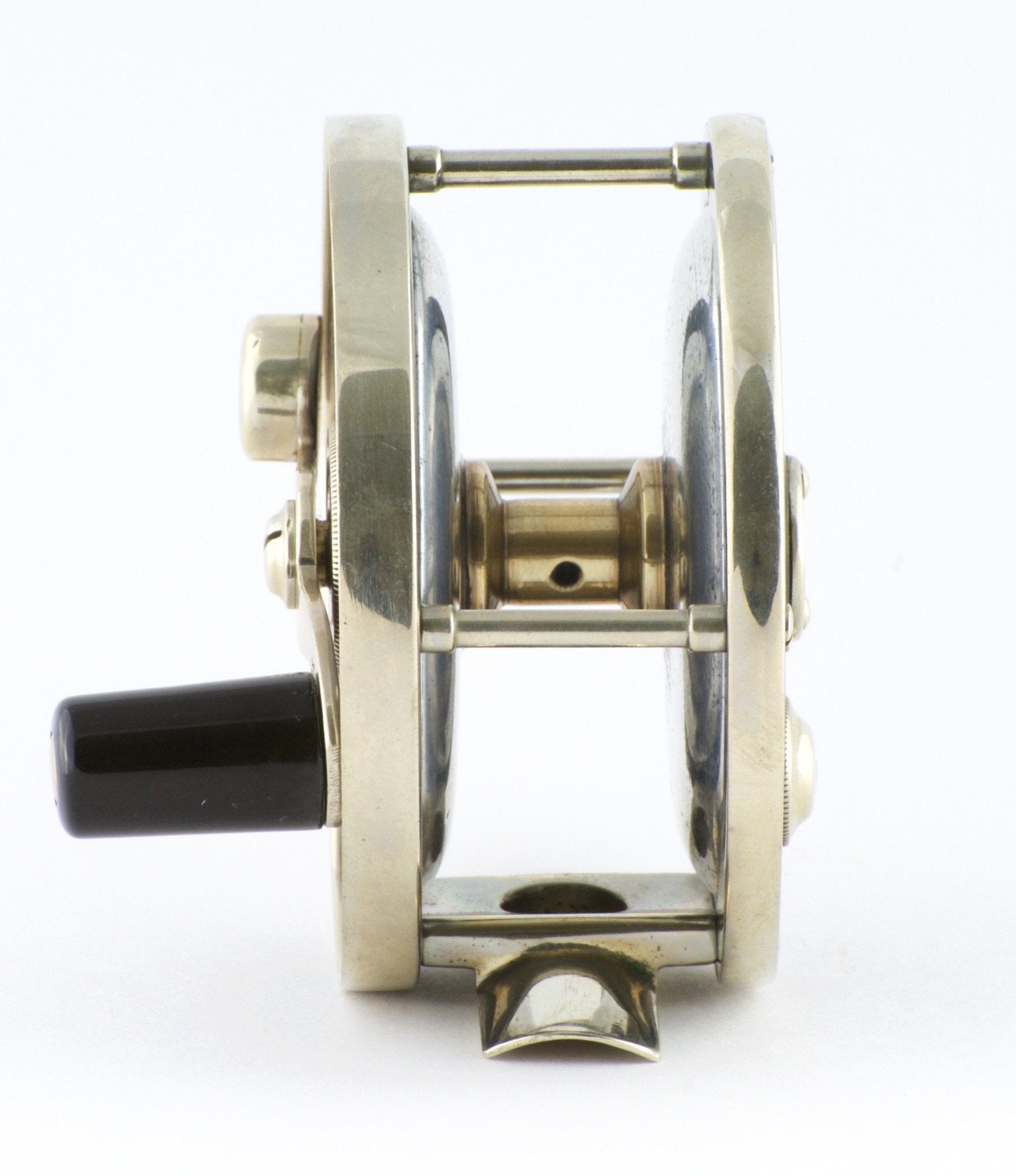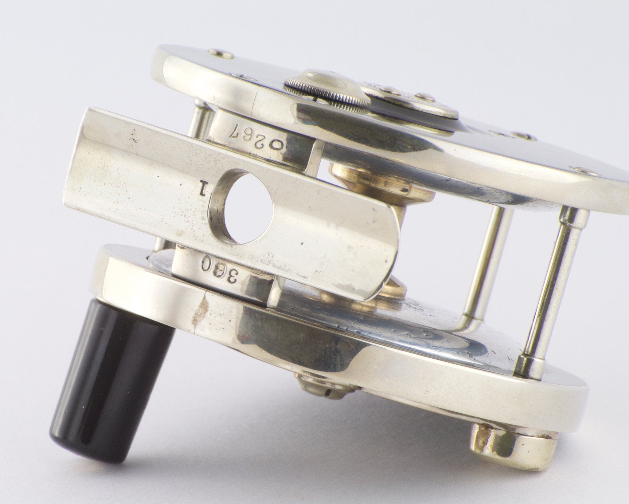 For sale here is an Edward Vom Hofe Model 360 Perfection fly reel (size 1) in excellent overall condition. 3" diameter with 1" wide spool. This reel carries the '02 patent date on the oil cap. Serial number O267 dating the reel to 1922. German silver / hard rubber construction. Aluminum spool and german silver foot. The reel has been professionally cleaned and polished. No chips/cracks in the hard rubber sideplates. The ebonite handle grasp had a small chip in it that was filled in - a well done and very minor repair. The reel has an adjustable drag and click and the five detent arrowhead pointer drag feature with red dot indicators. The reel foot is original and unmolested. Mechanically the reel remains in excellent condition with a great drag and smooth-running operation. A stellar example of one of the finest trout reels ever made!