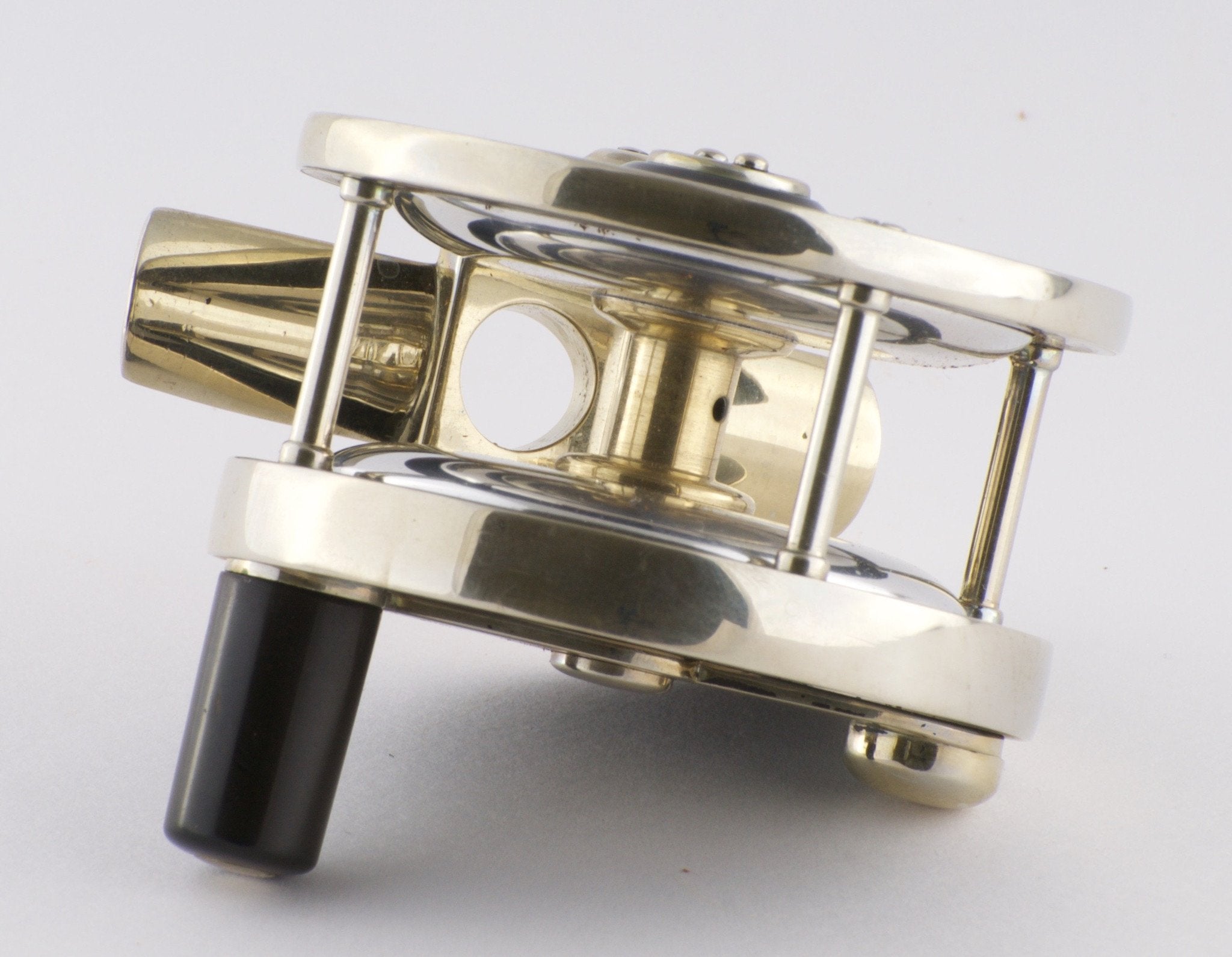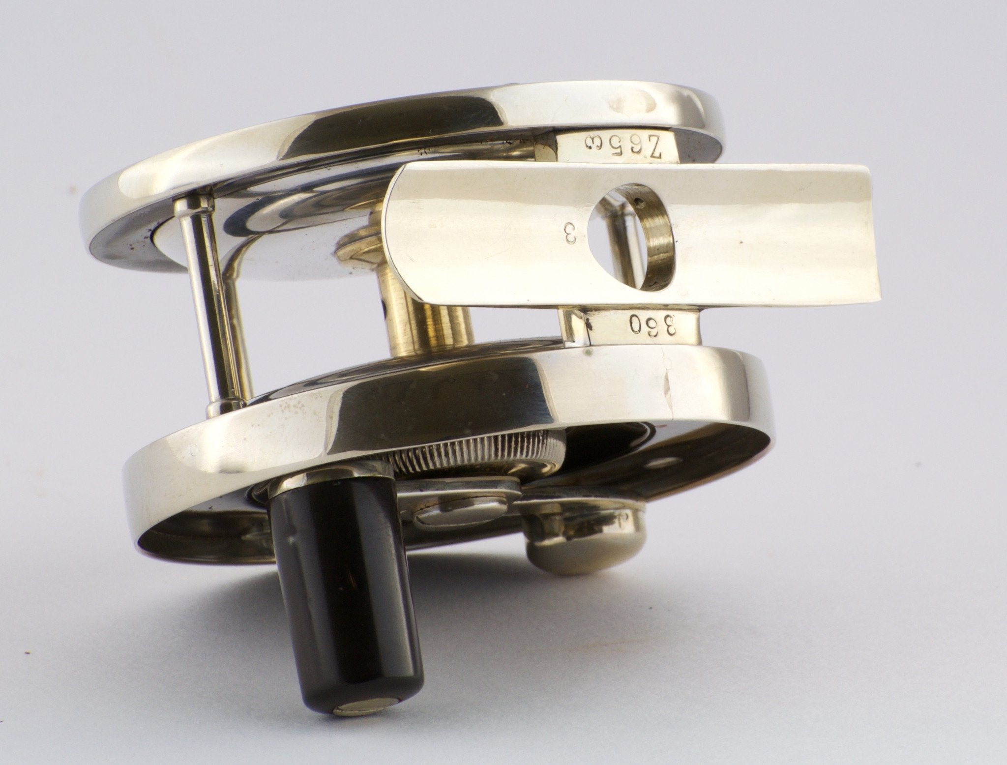 For sale here is an Edward Vom Hofe Model 360 Perfection fly reel (size 3) in excellent overall condition. ~2.5" diameter with 0.9" wide spool. This reel features the Fulton St. stamp on the oil cap. Serial number Z653 dating the reel to 1933. German silver / hard rubber construction. German silver foot and aluminum spool. The reel has an adjustable drag and click and the five detent arrowhead pointer drag feature with red dot indicators. For some reason, the drag wheel does not extend to the weakest two settings. The reel foot is original and unblemished. Mechanically the reel remains in excellent condition with a great drag and smooth-running operation. As close to perfect as it gets actually. The reel has been professionally cleaned and polished. Comes with an Edward Vom Hofe leather case, also stamped "3", with a replacement strap.