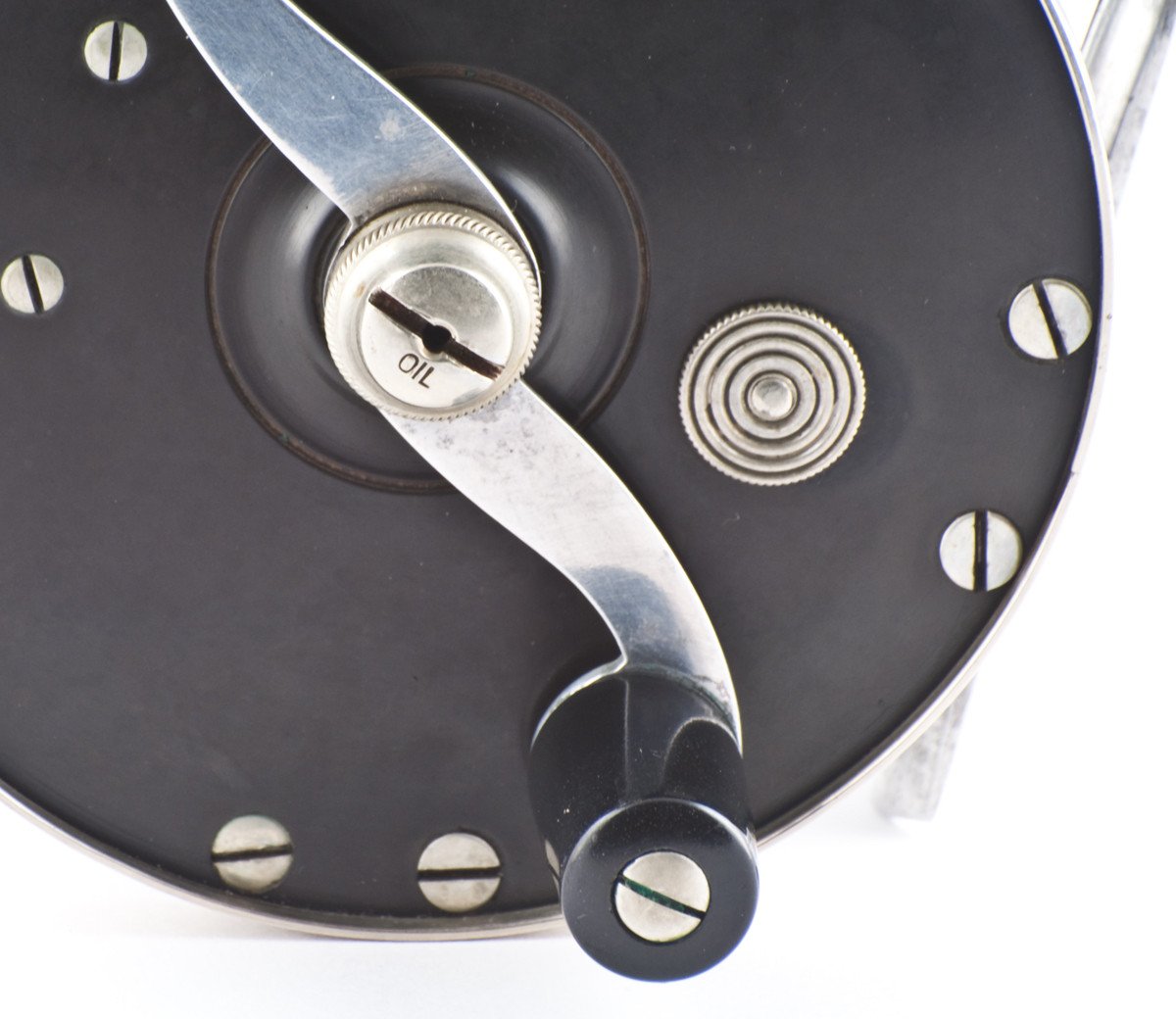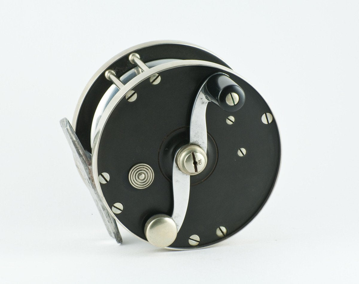 For sale here is a classic Edward Vom Hofe Model 423 "Restigouche" Salmon fly reel in excellent plus overall condition. Size 3/0. This reel carries the 1902 patent on the sliding oil cap. German silver safety bands and pair of roller bars. The reel has a strong adjustable drag and click. This reel has the seven detent arrowhead pointer drag feature with the red dot indicators in excellent condition.The reel foot is full length and not filed. Includes a 3/0 marking on it and serial number F278.