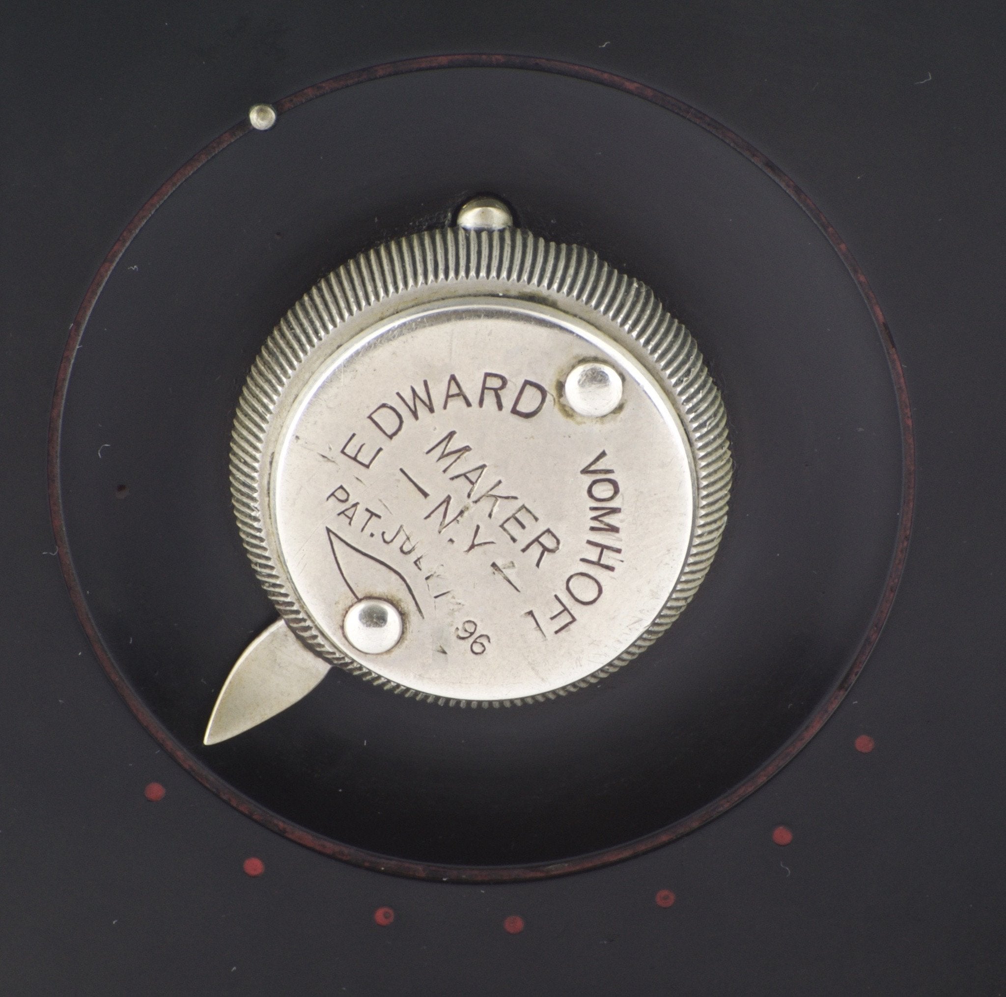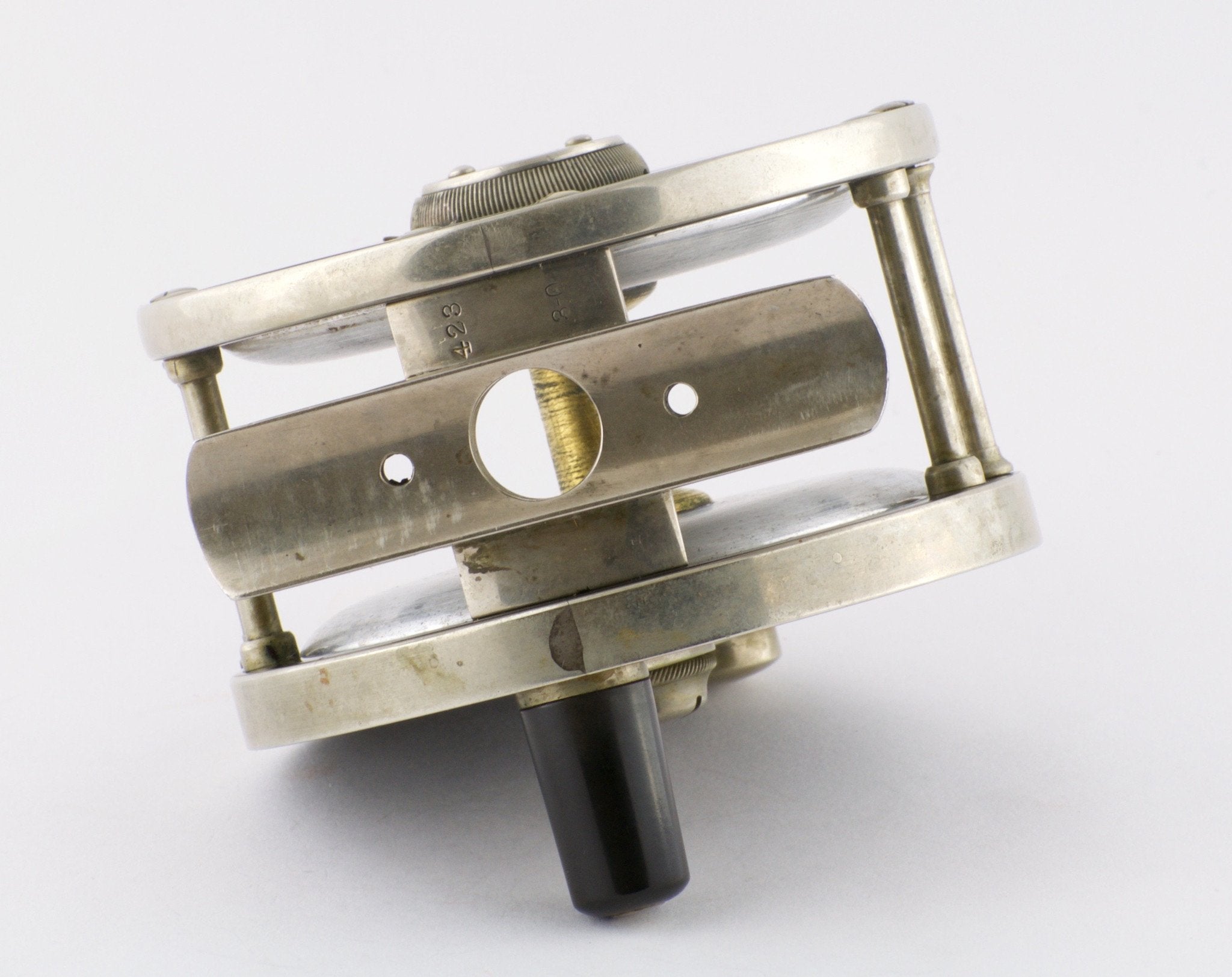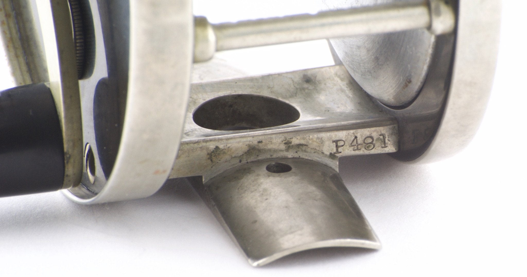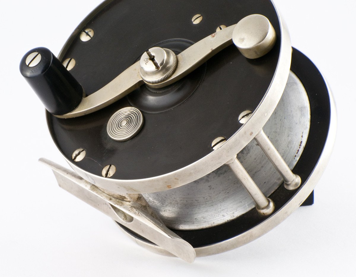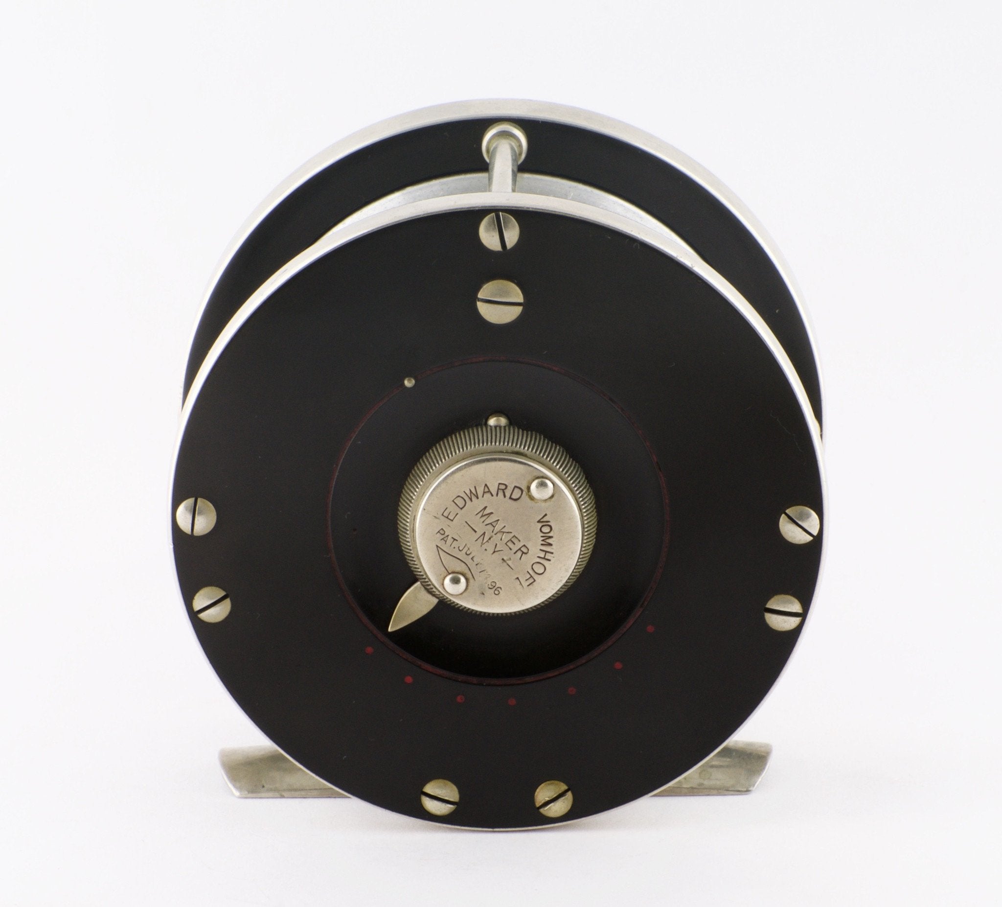For sale here is a classic Edward Vom Hofe Model 423 "Restigouche" Salmon fly reel in excellent overall condition. Size 3/0 - 3 5/8" diameter, spool width of 1 7/16" and weighs 11 1/4 oz. This reel carries the 1896 patent on the oil cap. German silver protective bands and a pair of double roller bars. The reel has a strong and smooth adjustable drag and click. This reel has the seven detent arrowhead pointer drag feature with red dot indicators. The nickel silver reel foot is full length, unmolested, and includes a 3/0 marking on it and serial number P481 dating the reel to 1923. There is a very slight hairline crack in the hard rubber between the two pillar screws on the headplate. Some of the screws also show some marks from ill-fitting screwdrivers over the years, although all of the screws are removable as-is. The reel comes with what appears to be its original 3/0 marked leather case with a broken and detached strap and buckle.