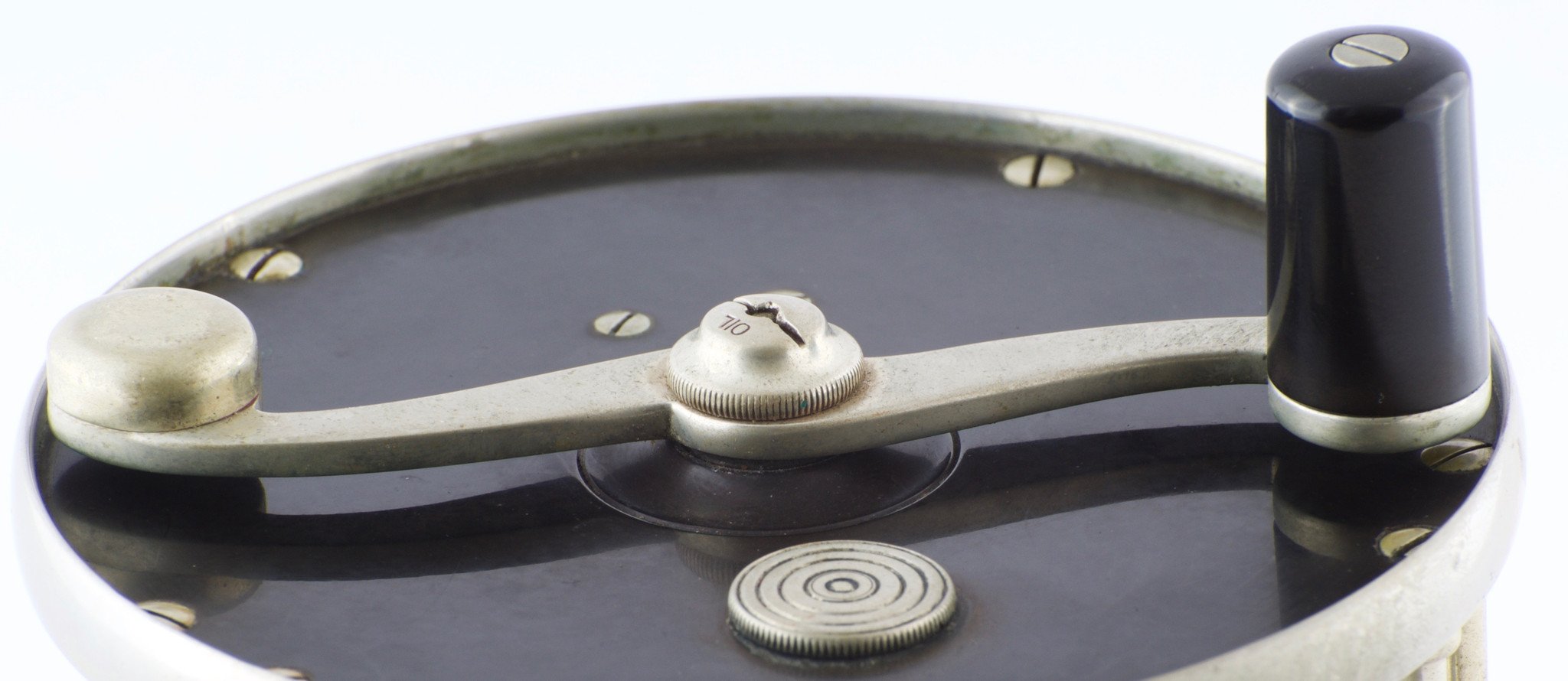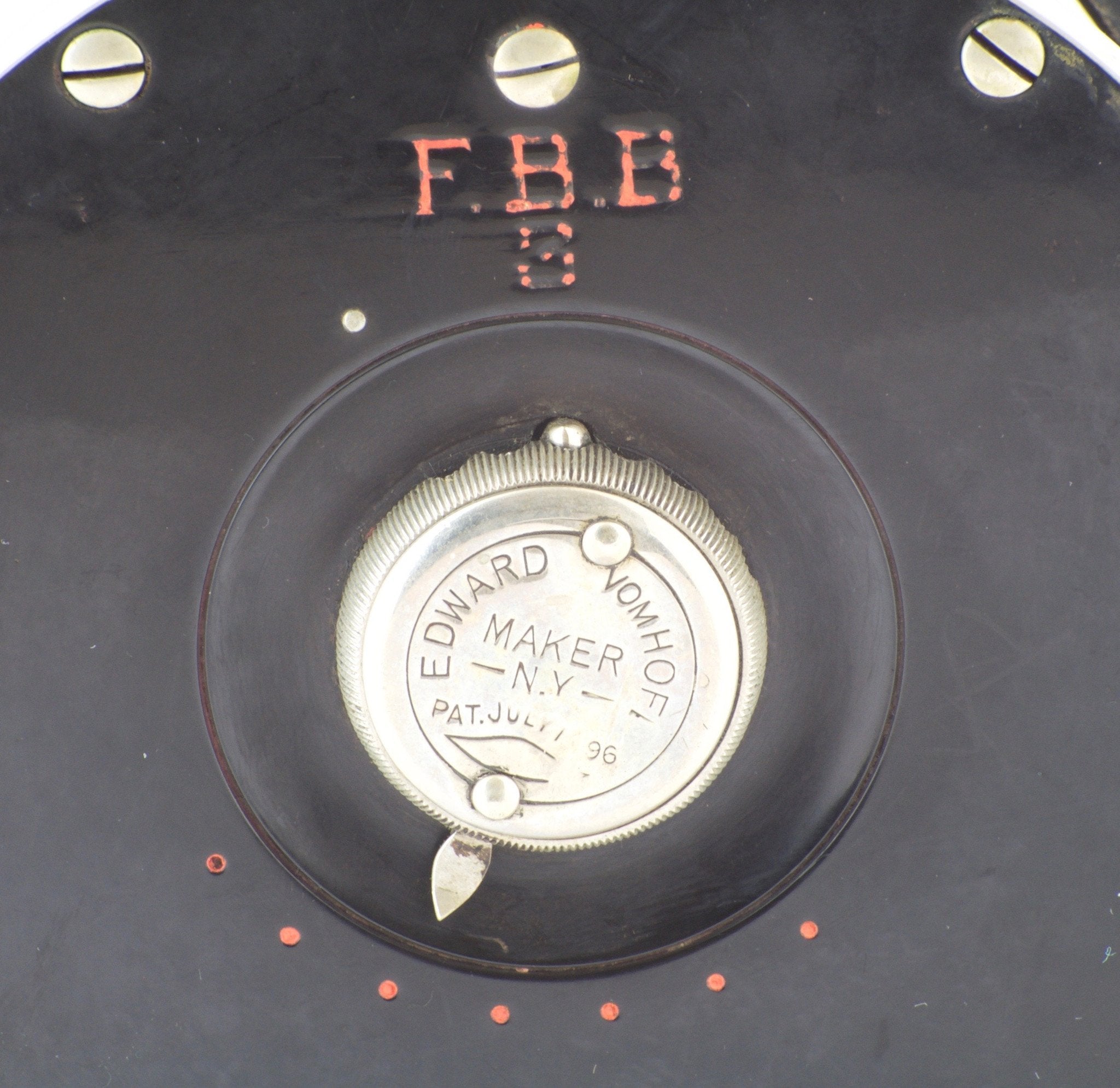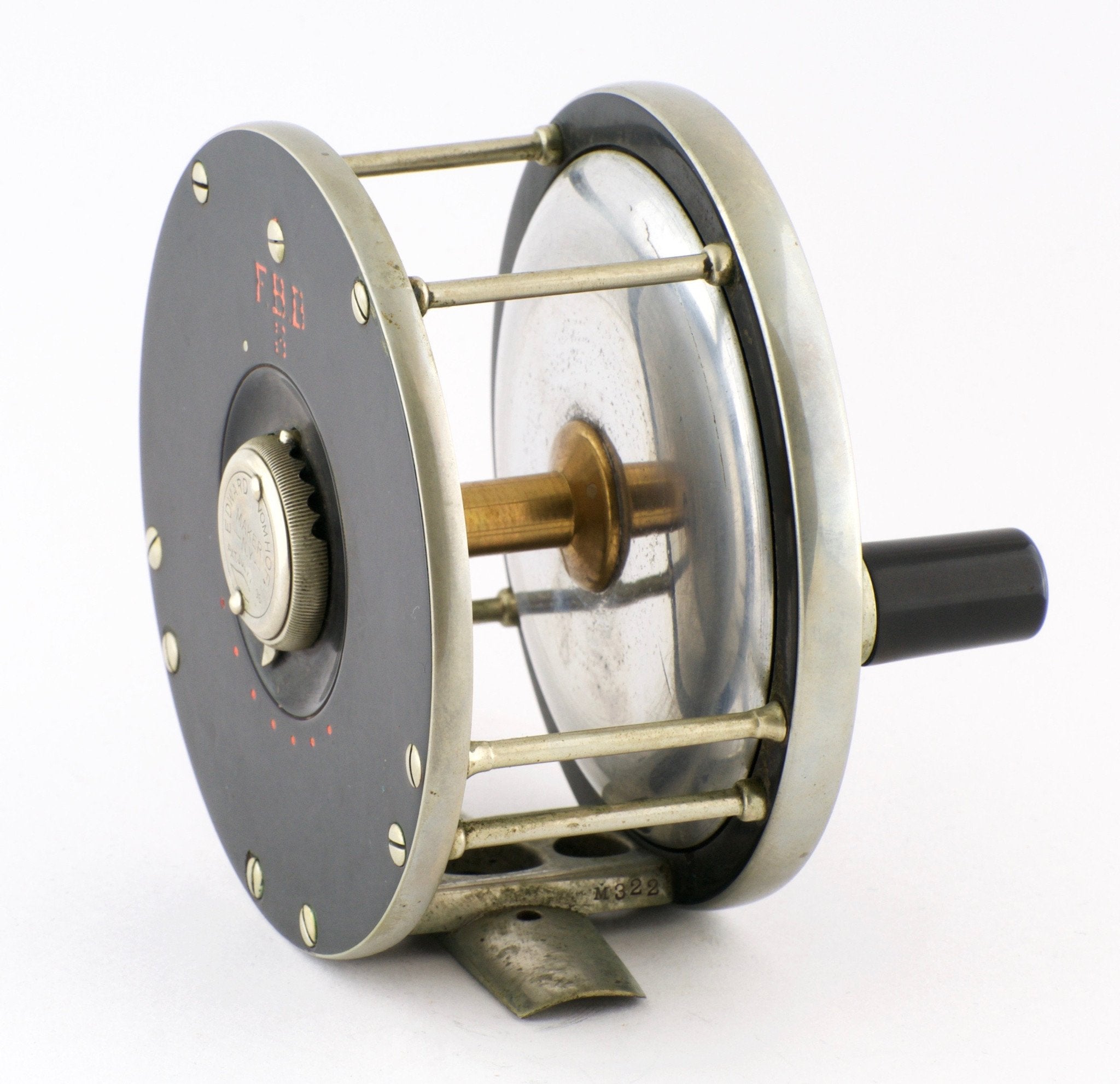 For sale here is an Edward Vom Hofe Model 423 salmon fly reel in excellent overall condition. This serial number M322 reel was made in 1920.Size 6/0 - 4 1/4" diameter. This reel carries the 1896 patent stamp on the oil cap. German silver safety bands and pair of roller bars. The reel's drag is smooth and strong throughout its range.The reel foot is full length and not filed. Includes a 6/0 marking as well as the model and serial number. No cracks exist in the hard rubber and no dings to the rims. A fine example and still a very capable reel to catch very large salmon or steelhead. The original leather case is a bit ragged and shows its age.