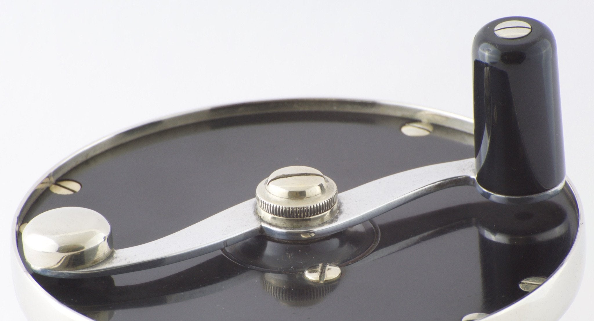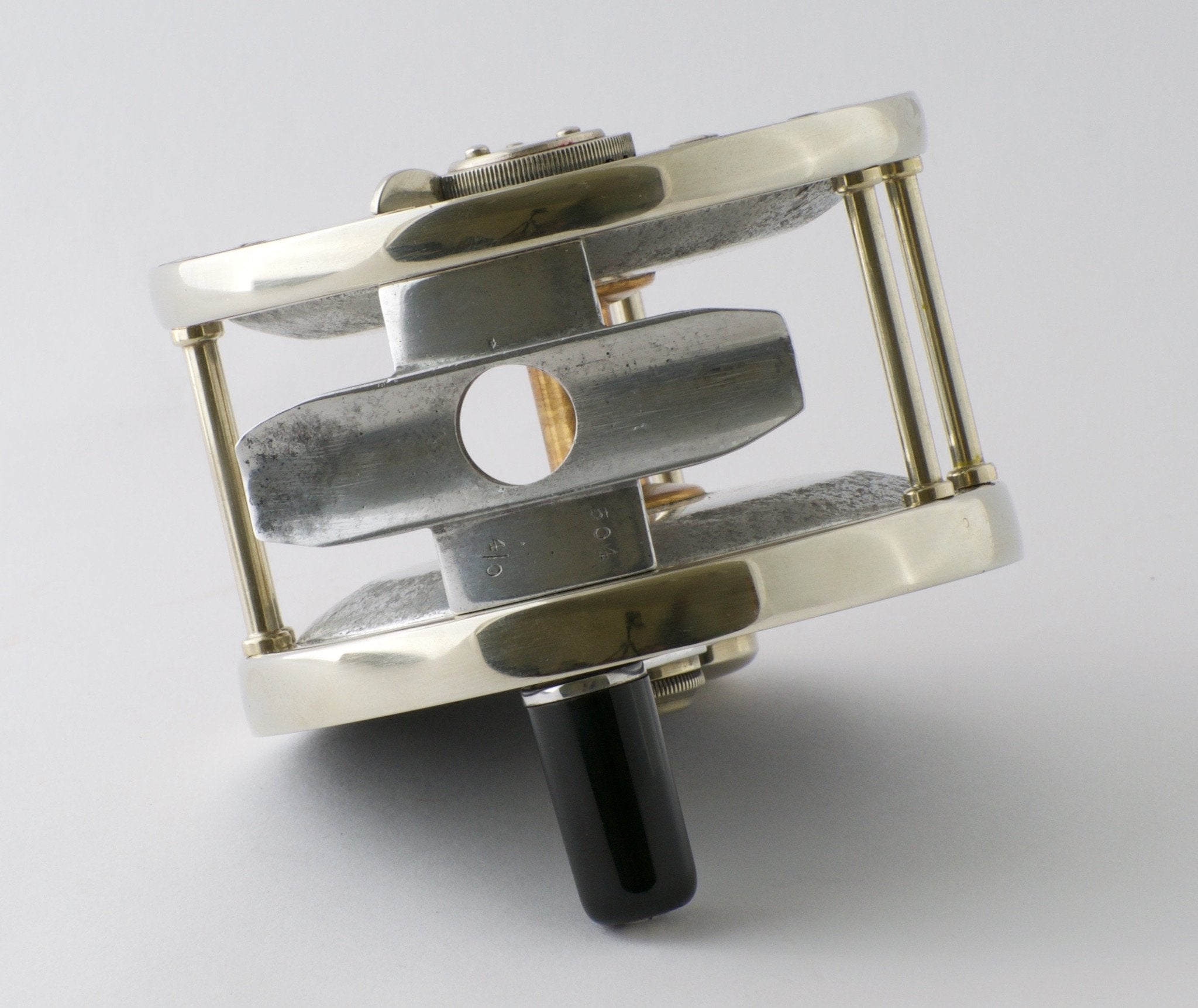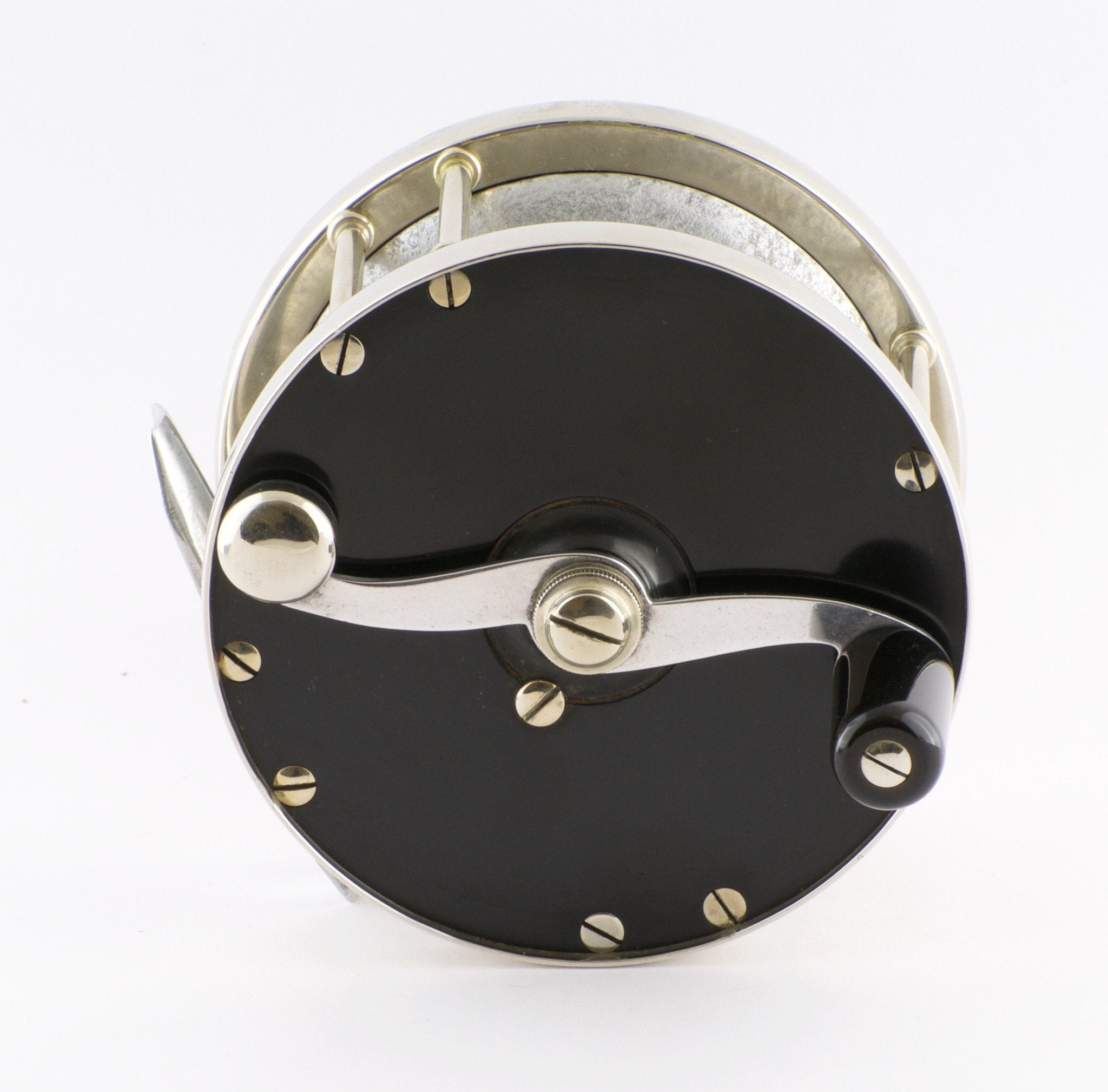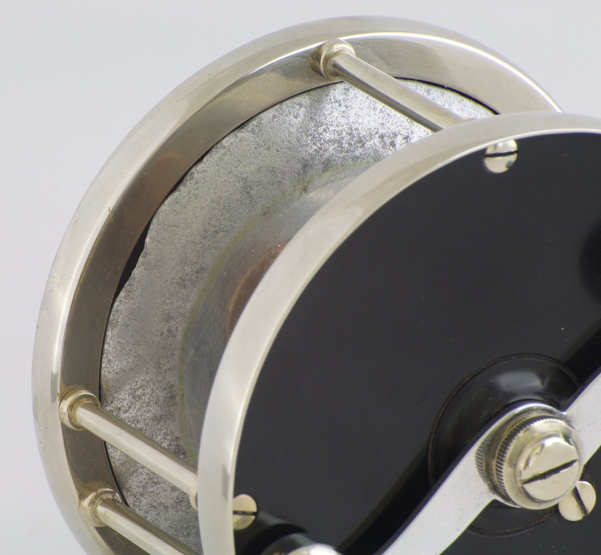 This reel is priced attractively based on the spool showing some minor corrosion as well as having a slight chip in it (see last photo), which doesn't affect its mechanical integrity whatsoever. The reel foot is also a modern replacement without a serial number.