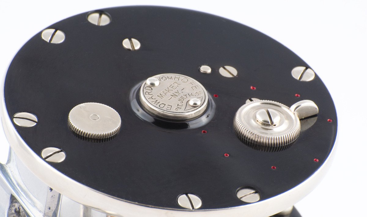 For sale here is a very rare special order Edward Vom Hofe fly reel, a Model 504 Tobique. Although the reel foot is stamped "1/0" and has the standard 3 1/8" diameter, this reel actually has a spool width of 1 3/8", similar to a standard size 2/0 reel. What also makes this reel possibly unique is the configuration of the back plate and drag design. Rather than being placed around the center pivot cap as with the standard Tobique and Restigouche reels, this reel features the adjustable drag and red indicator dots being placed closer to the outer rim of the backplate. The reel carries the 1896 patent "Edward Vom Hofe Maker -N.Y.-" marked pivot cap. Serial number Z279 appears on the foot, placing the date of production in 1933.