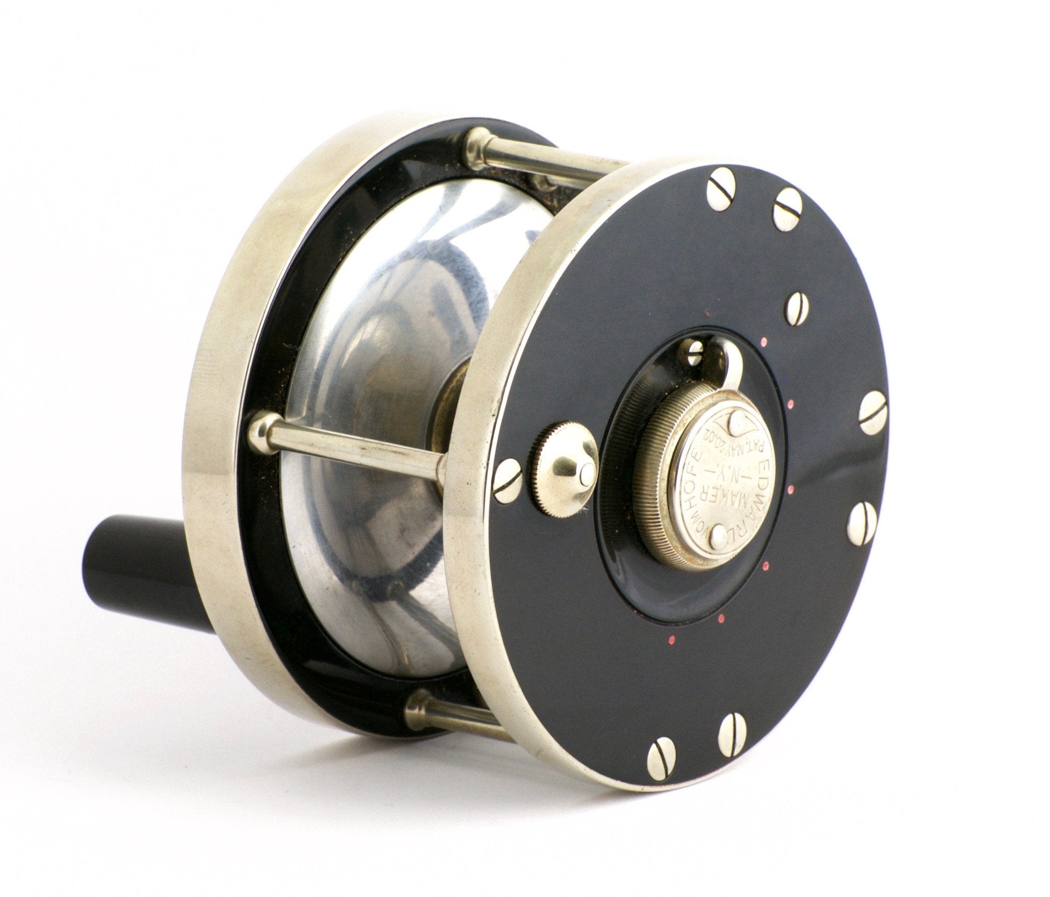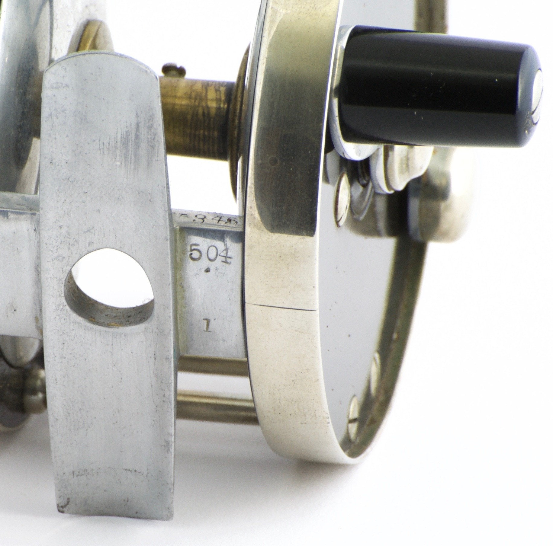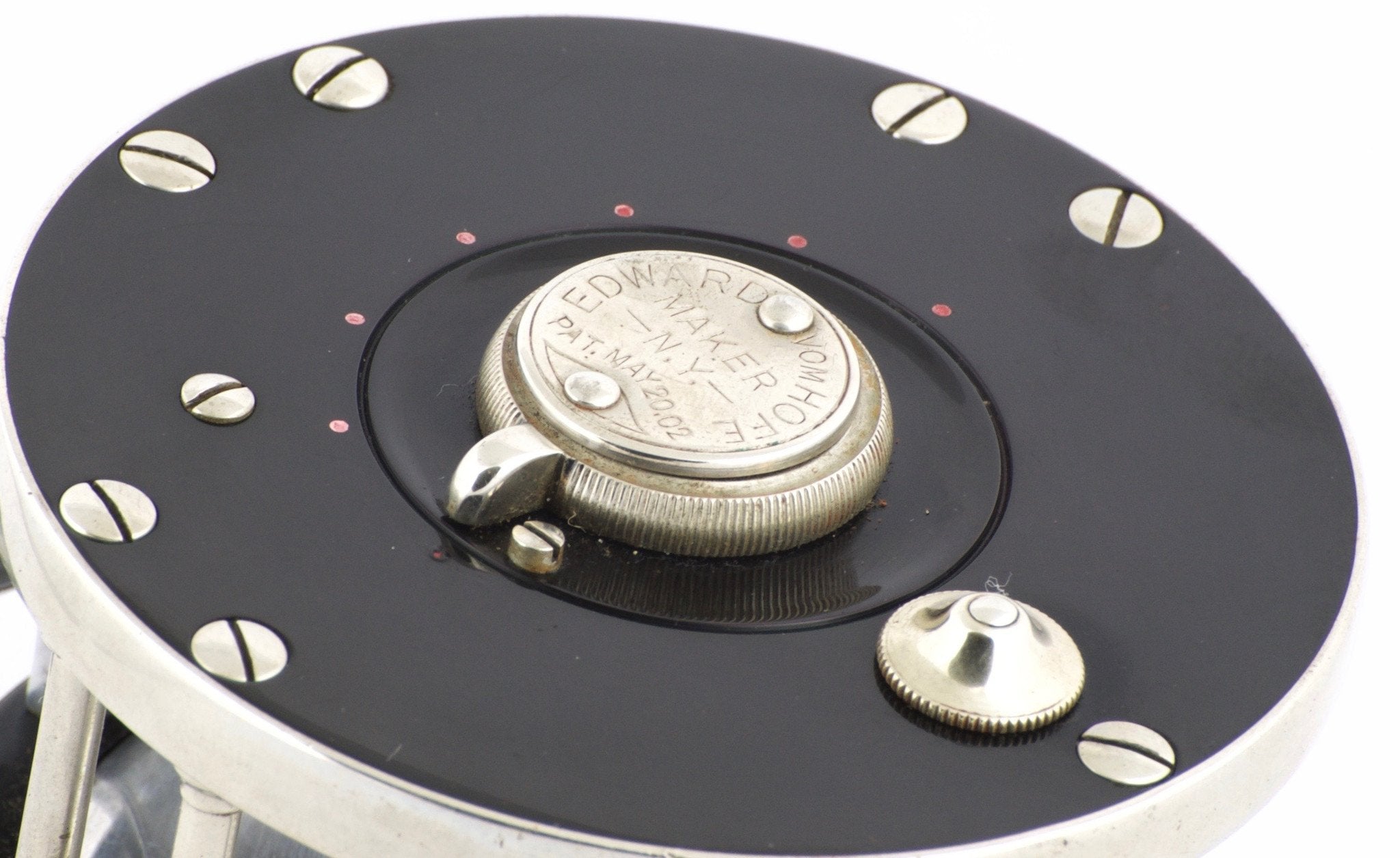 For sale here is a scarce size 1/0 Edward Vom Hofe Model 504 Tobique Salmon fly reel in excellent+ condition. This reel carries the May 20, 1902 patent date "Edward Vom Hofe Maker -N.Y.-" marked drag knob cover, and has a strong click and fully functional adjustable drag with bright red indicator dots. V345 serial number appears on the foot, dating the reel to 1939. German silver screws, pillars, rims, on/off knob, handle arm threaded cap, handle arm counterbalance cap, and drag adjustment knob. Aluminum handle, foot and spool flanges. Full-length and un-filed foot. Comes with presumably the original leather reel case in good overall condition with a buckle strap that has seen better days. A wonderful example for the EVH fisherman/collector!