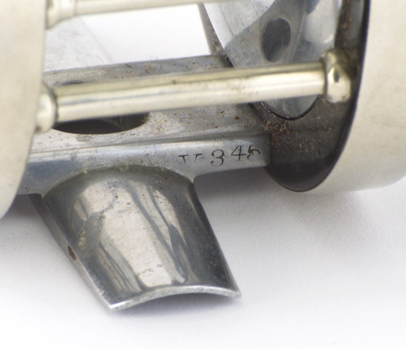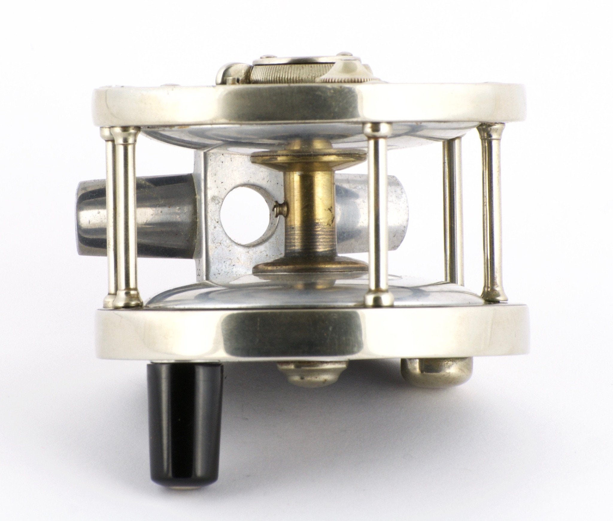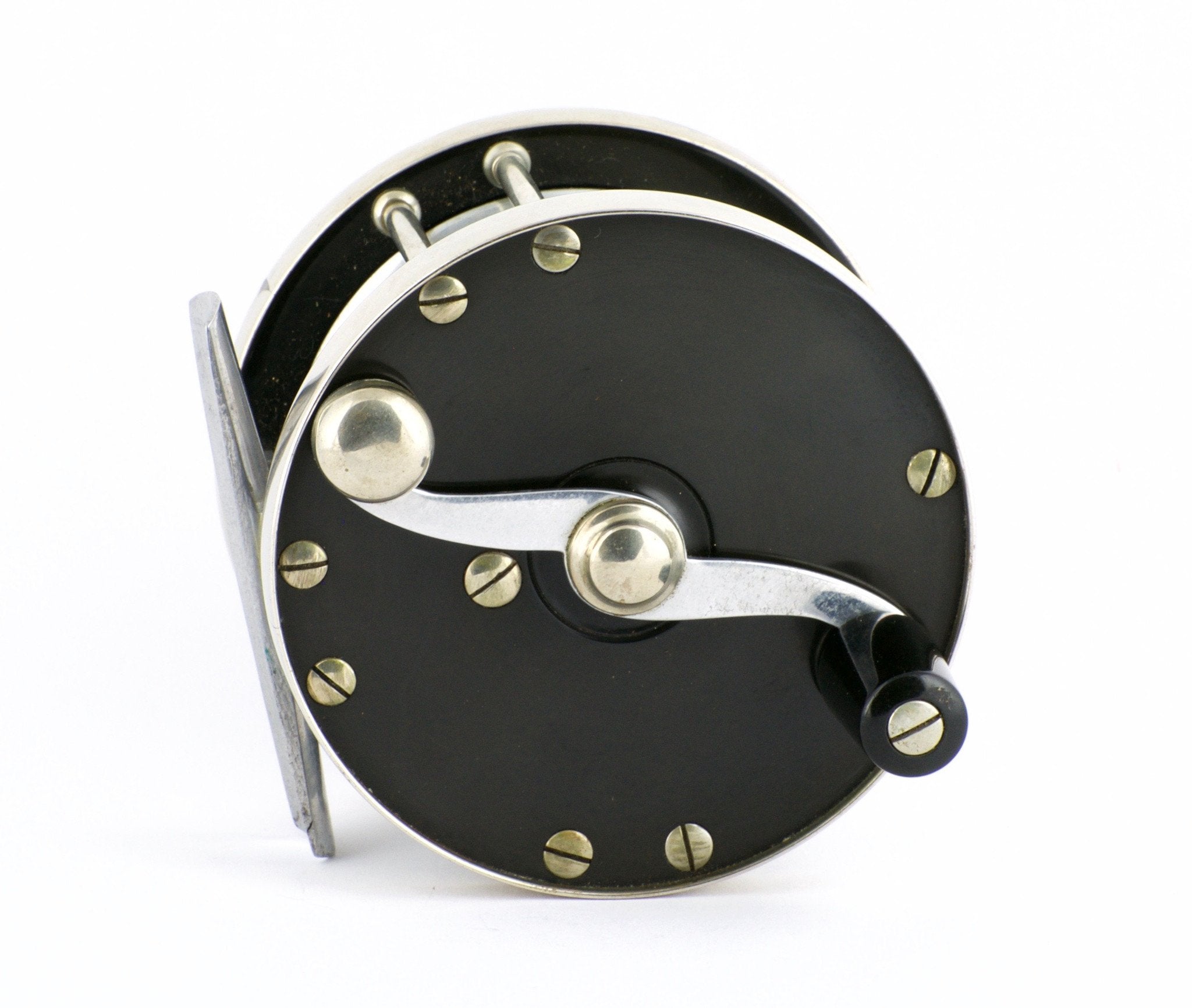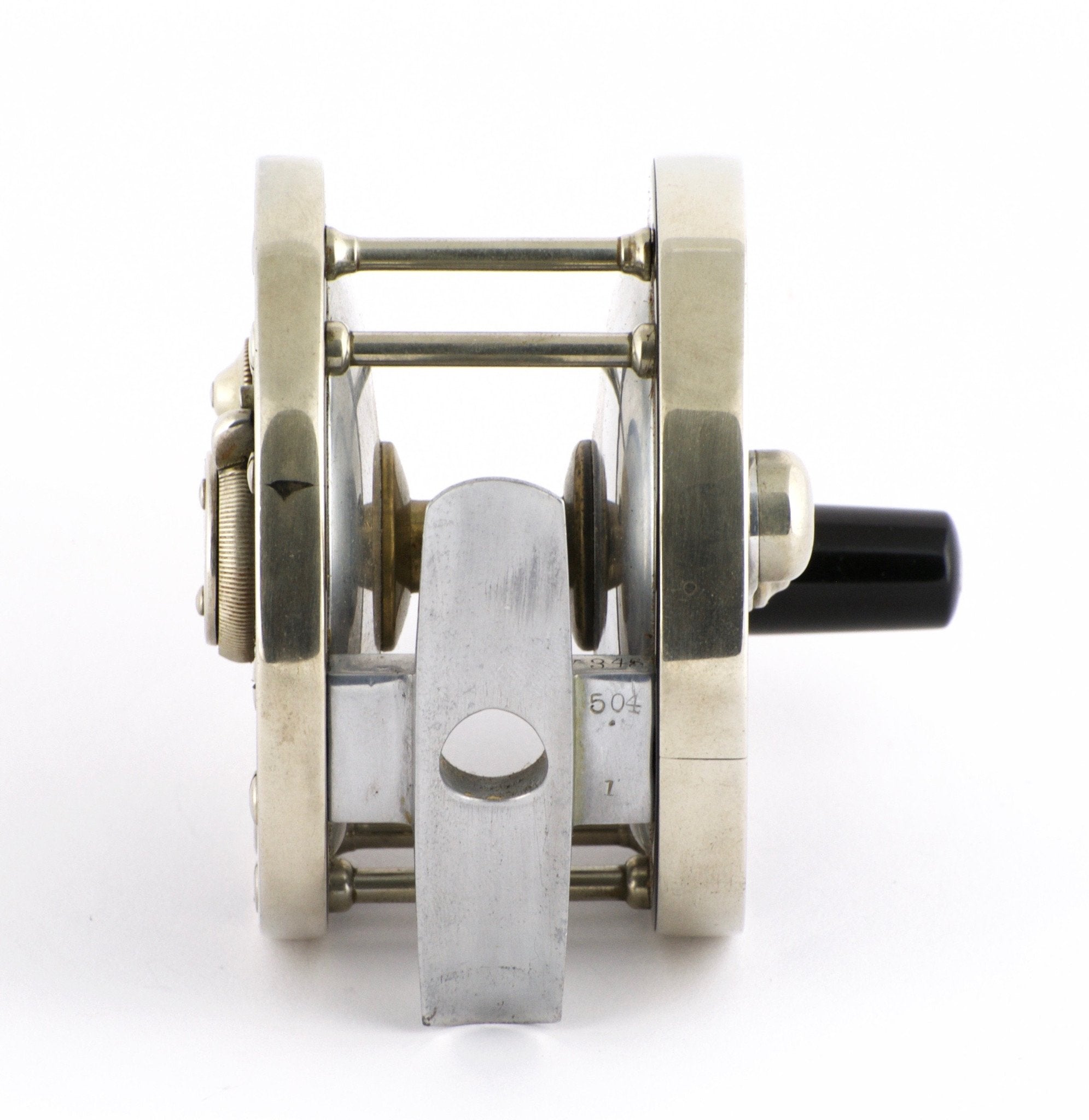 For sale here is a scarce size 1/0 Edward Vom Hofe Model 504 Tobique Salmon fly reel in excellent+ condition. This reel carries the May 20, 1902 patent date "Edward Vom Hofe Maker -N.Y.-" marked drag knob cover, and has a strong click and fully functional adjustable drag with bright red indicator dots. V345 serial number appears on the foot, dating the reel to 1939. German silver screws, pillars, rims, on/off knob, handle arm threaded cap, handle arm counterbalance cap, and drag adjustment knob. Aluminum handle, foot and spool flanges. Full-length and un-filed foot. Comes with presumably the original leather reel case in good overall condition with a buckle strap that has seen better days. A wonderful example for the EVH fisherman/collector!