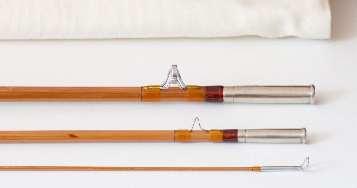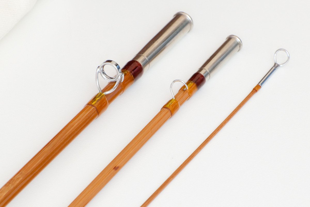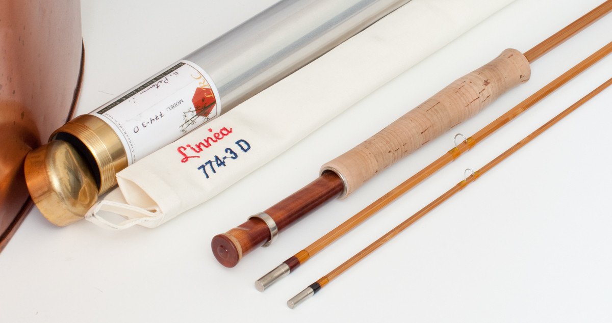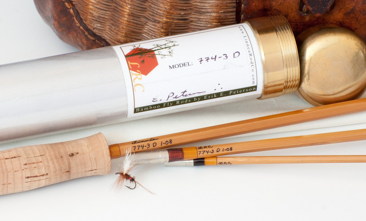 For sale here is a Linnea Model 774-3D hollow-built bamboo rod by Erik Peterson. 7'7" for a 4 weight line. The rod has three sections and one tip (made that way). All sections remain straight as an arrow. Stunning cherry plum reel seat spacer. Here's Erik's description of this model: "The Dalles Rod and Gun Club is a located on the Deschutes River in Oregon. Every Spring I visit the club with my friends Clint Bailey and James Harrington and we have the first opportunity of the year to field test the rods that I designed the previous winter. The waters adjacent to the club are lined with large Alders and when the bugs are emerging, the rainbows stack up along the banks and under the trees to feed. To catch these fish an angler must use stealth to approach and once in position, he must make precise casts to be effective. Like the river, the Redsides Rainbows are large and powerful. I designed the 774-3 with these circumstances and conditions in mind. The rod is medium fast with the power to turn large fish and very accurate in its casting characteristics with the ability to deliver flies on a dime. Its tip tapers to .054 to protect fine tippets and with its length, the 774-3 is perfect for fishing the somewhat confined areas that are presented to the Deschutes angler."
