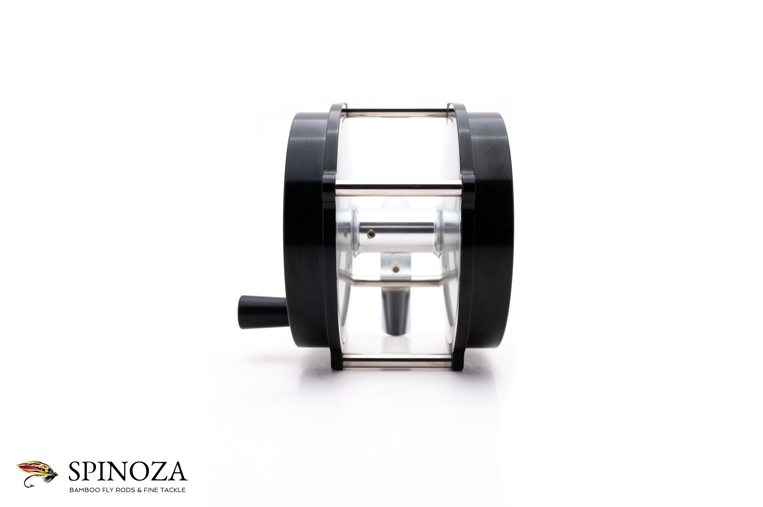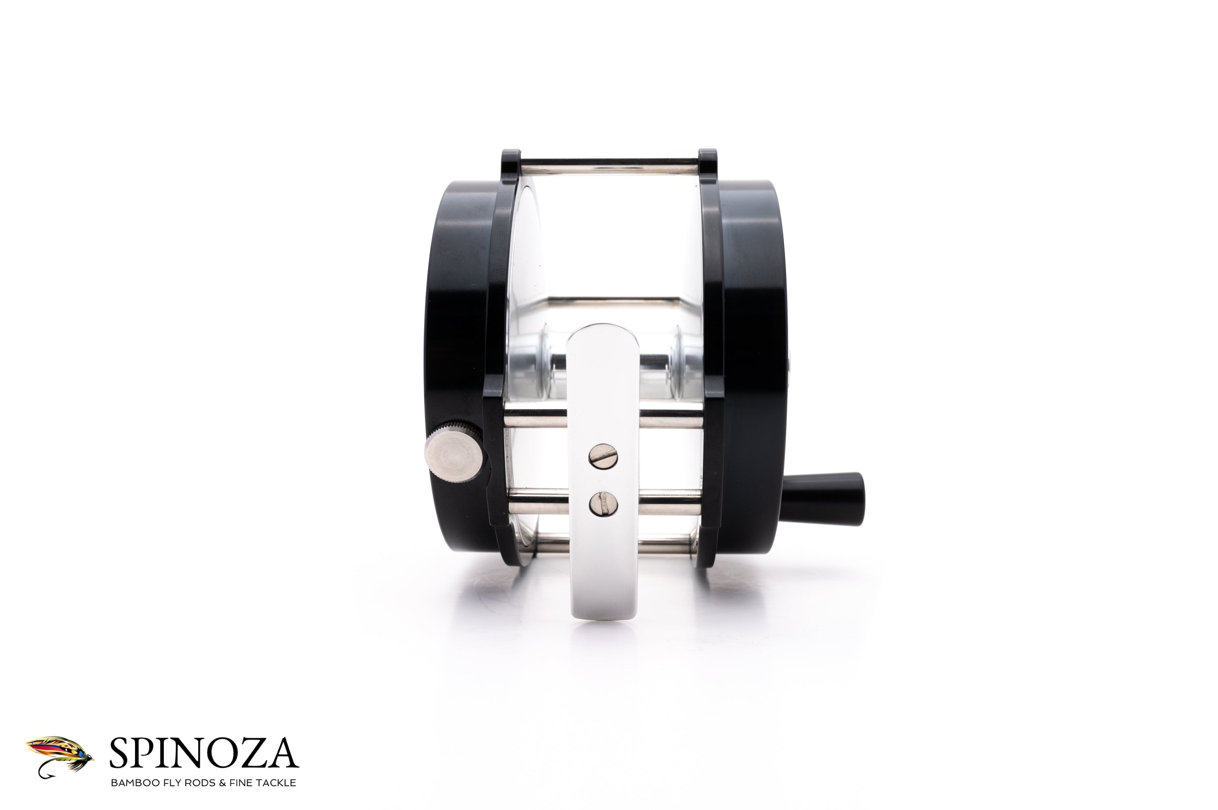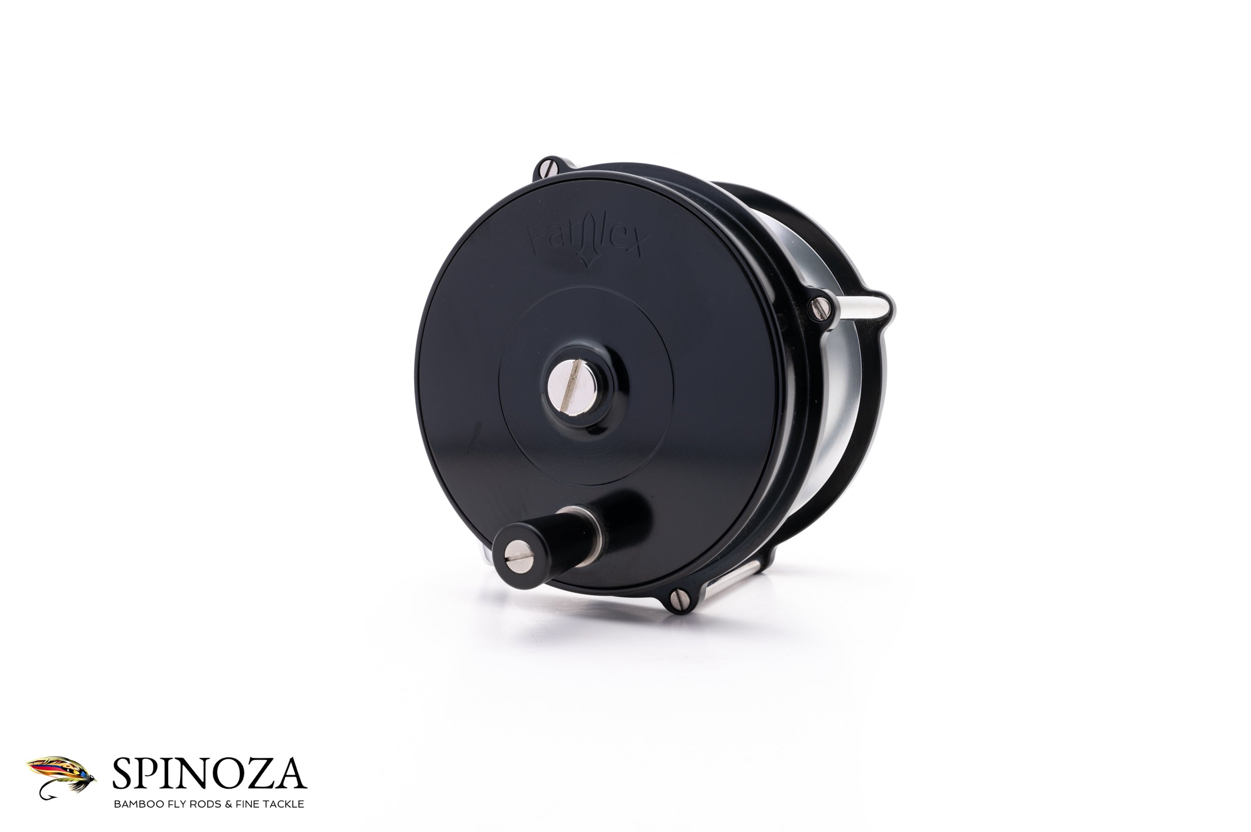 A nice Farlex 1-1 Platewind direct drive fly reel, 4" diameter and set up for RHW (though the bias is fairly neutral). Raised pillar design. Serial #11. Mint, unfished condition. Black anodized throughout. The reel weighs 13.6 ounces on my scale. Gear and pawl drag system with a nice loud click. Ebonite handle that's slightly flared at the end. "Farlex" is etched into both the winding plate and backplate. There is also a tensioner in the frame edge near the foot to adjust the drag. No bag. A nice match for spey rods in the 14' to 16' class.