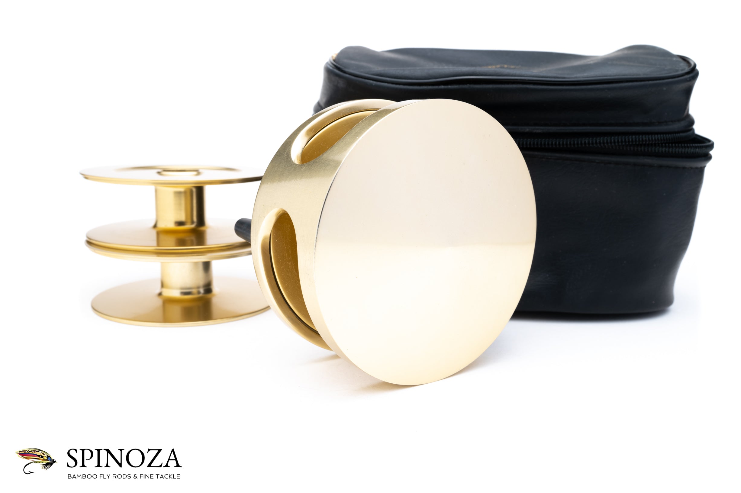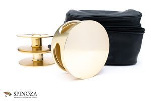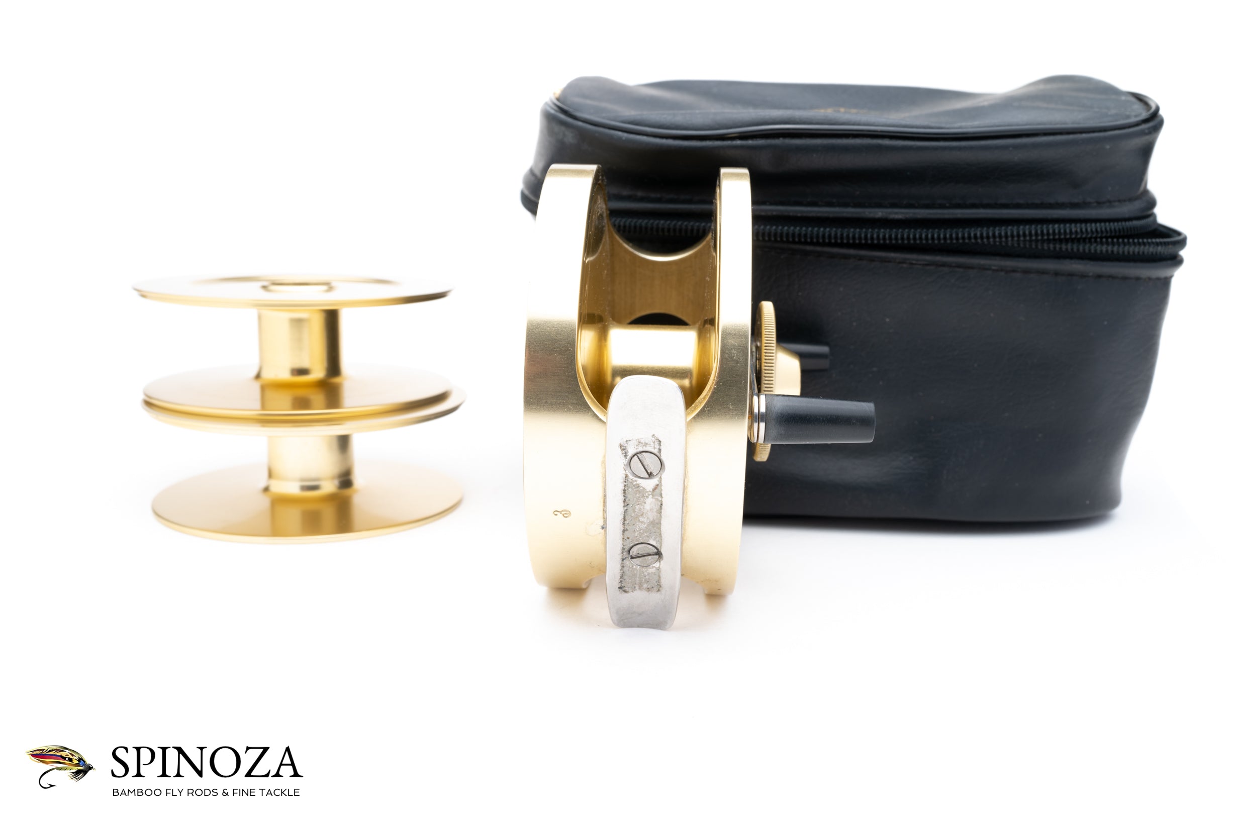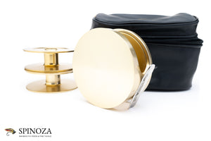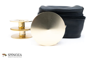 A Fin-Nor #3 anti-reverse fly reel with two spare spools, set up for RHW. 3 5/8" diameter with a 1" spool width. Weighs 11.6 ounces on my scale. Designed for 7-10 wt lines with approximately 200 yards of 30 lb. backing. Excellent condition overall with just a few minor marks overall. Somewhat unusually there is no writing on the backplate. Gold anodized throughout. The spare spools appear little used, if at all. The reel and spare spools pack into a large original Fin-Nor black pouch zipper pouch with the Fin-Nor gold logo on the top.