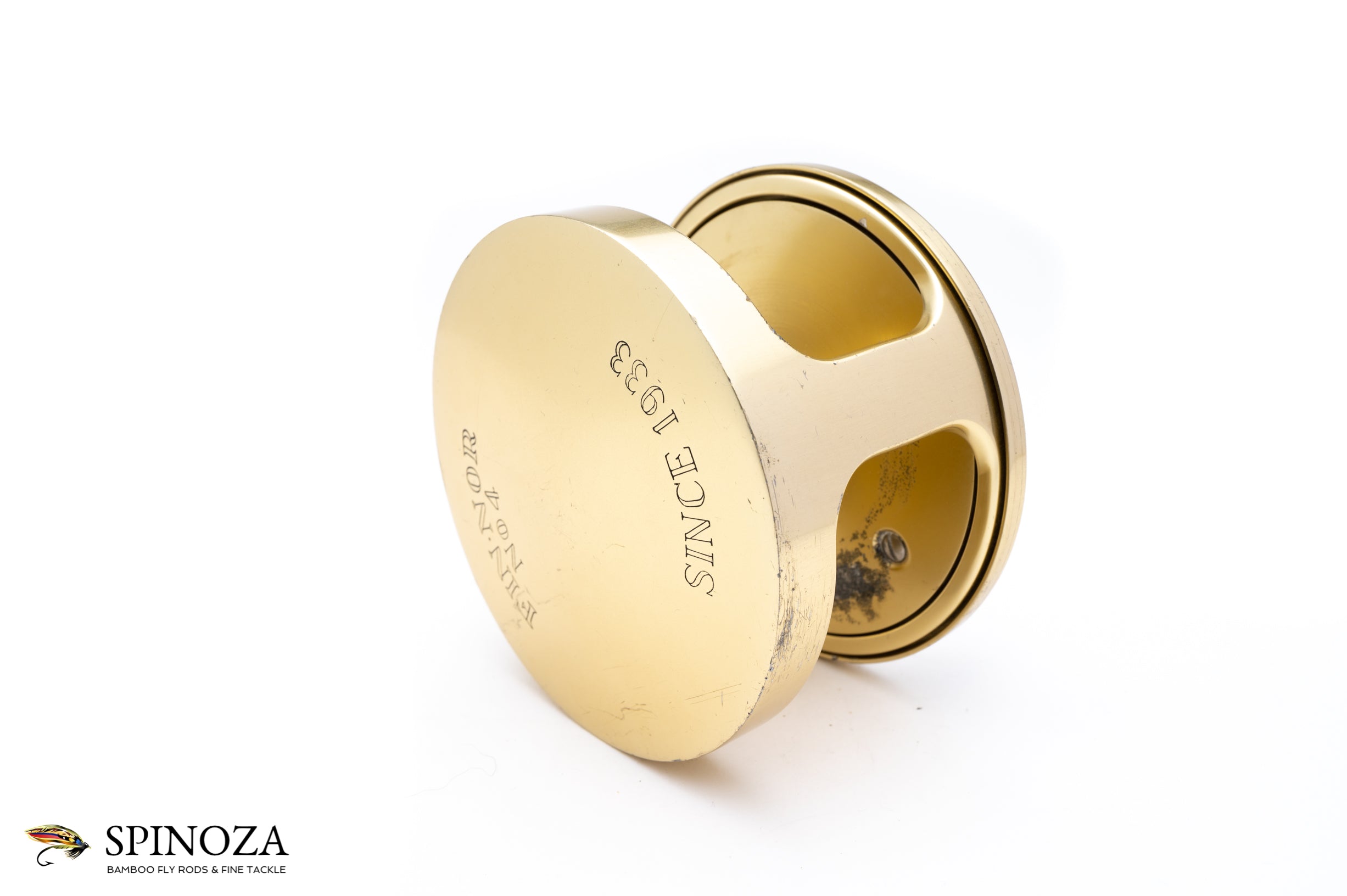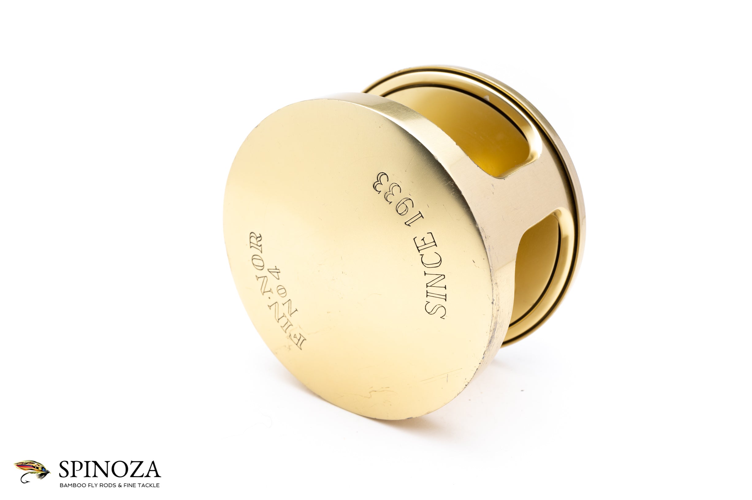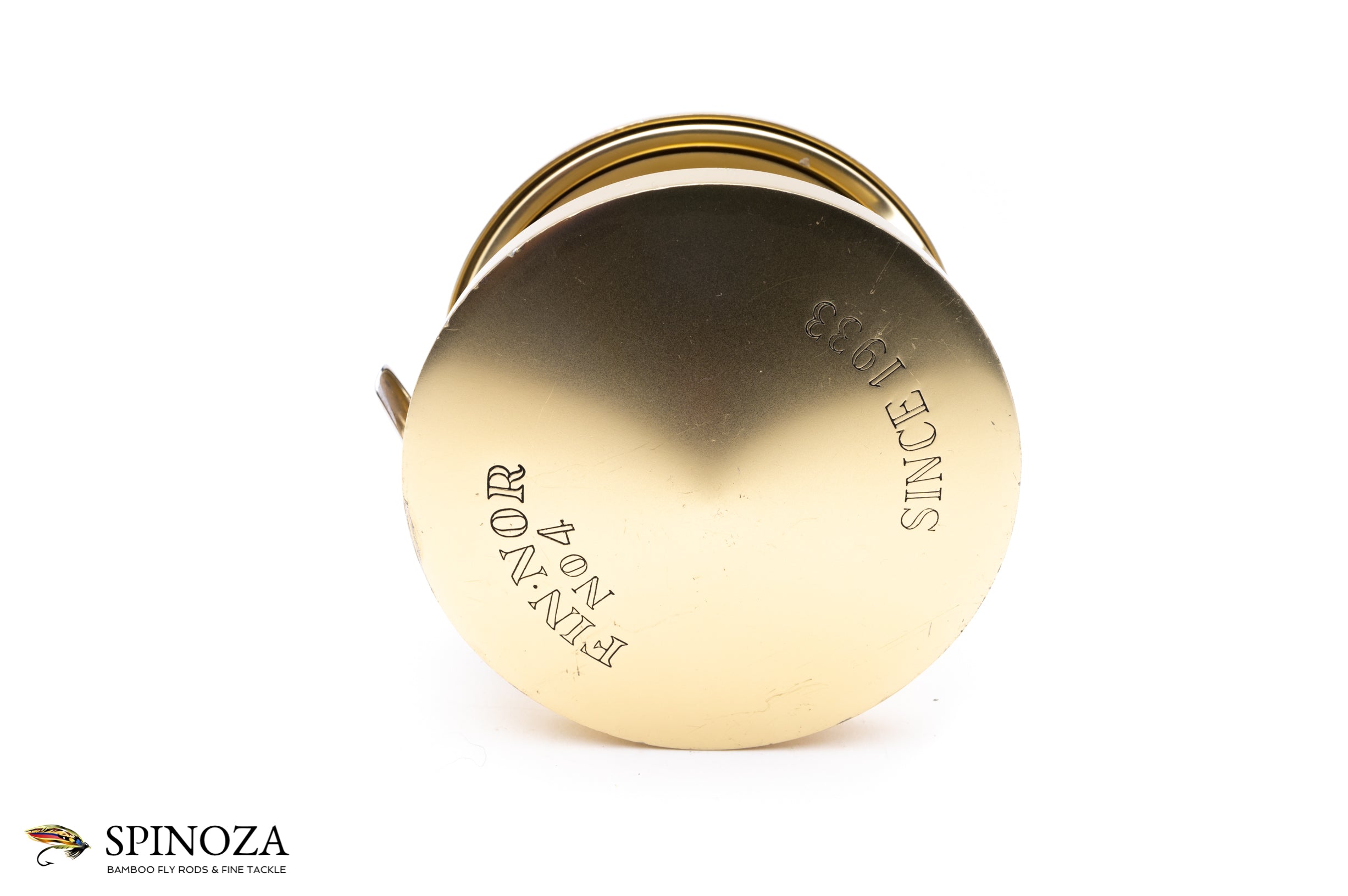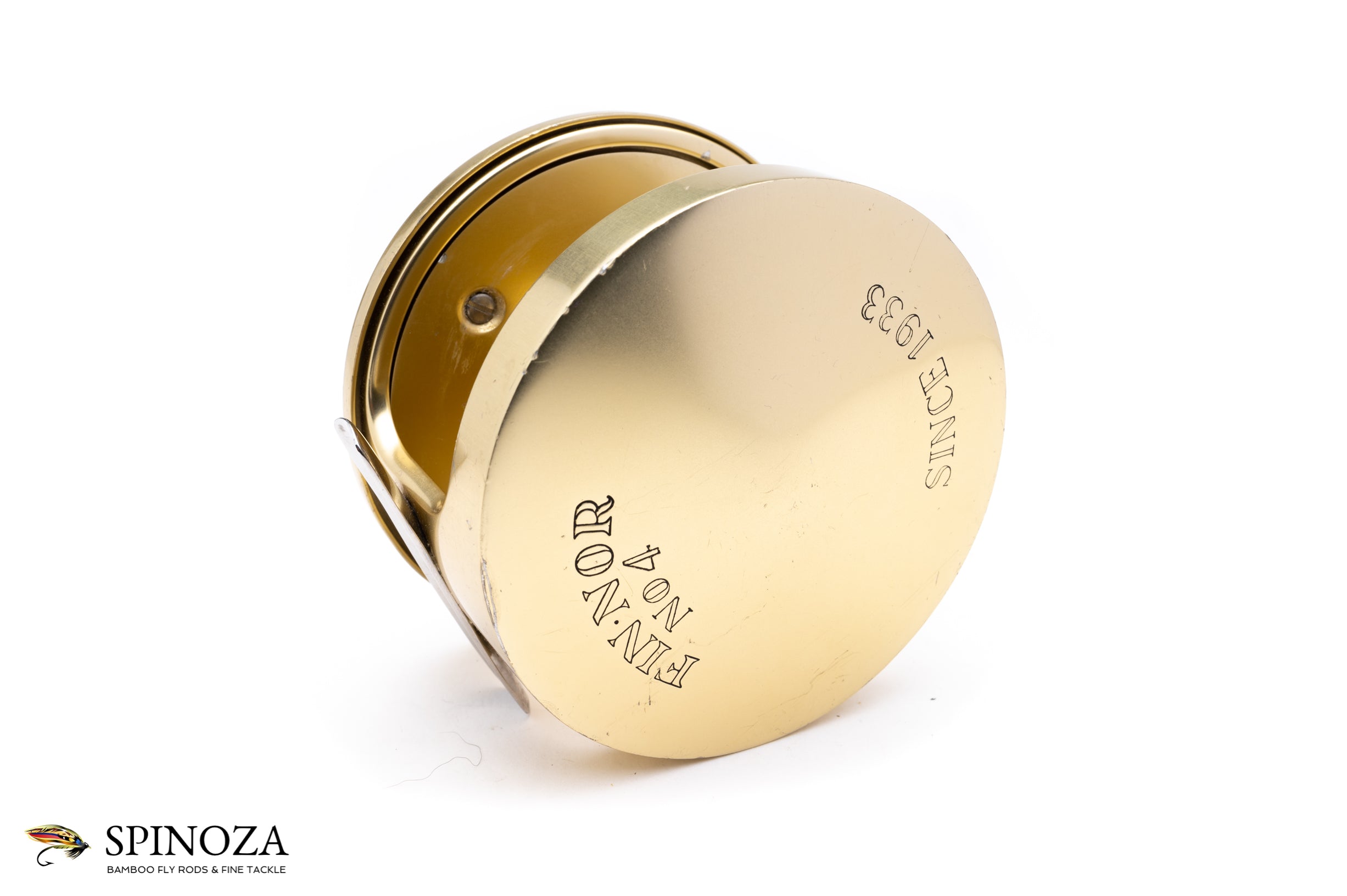 A Fin-Nor #4 fly reel, set up for LHW. 3 5/8" diameter with a 1 1/2" spool width. Weighs 12 3/4 ounces. Direct drive. Used condition with some rash on the rims and plates as well as some wear and corrosion on the spool. Mechanically sound. The typical gold anodized with the silver foot. No bag.
