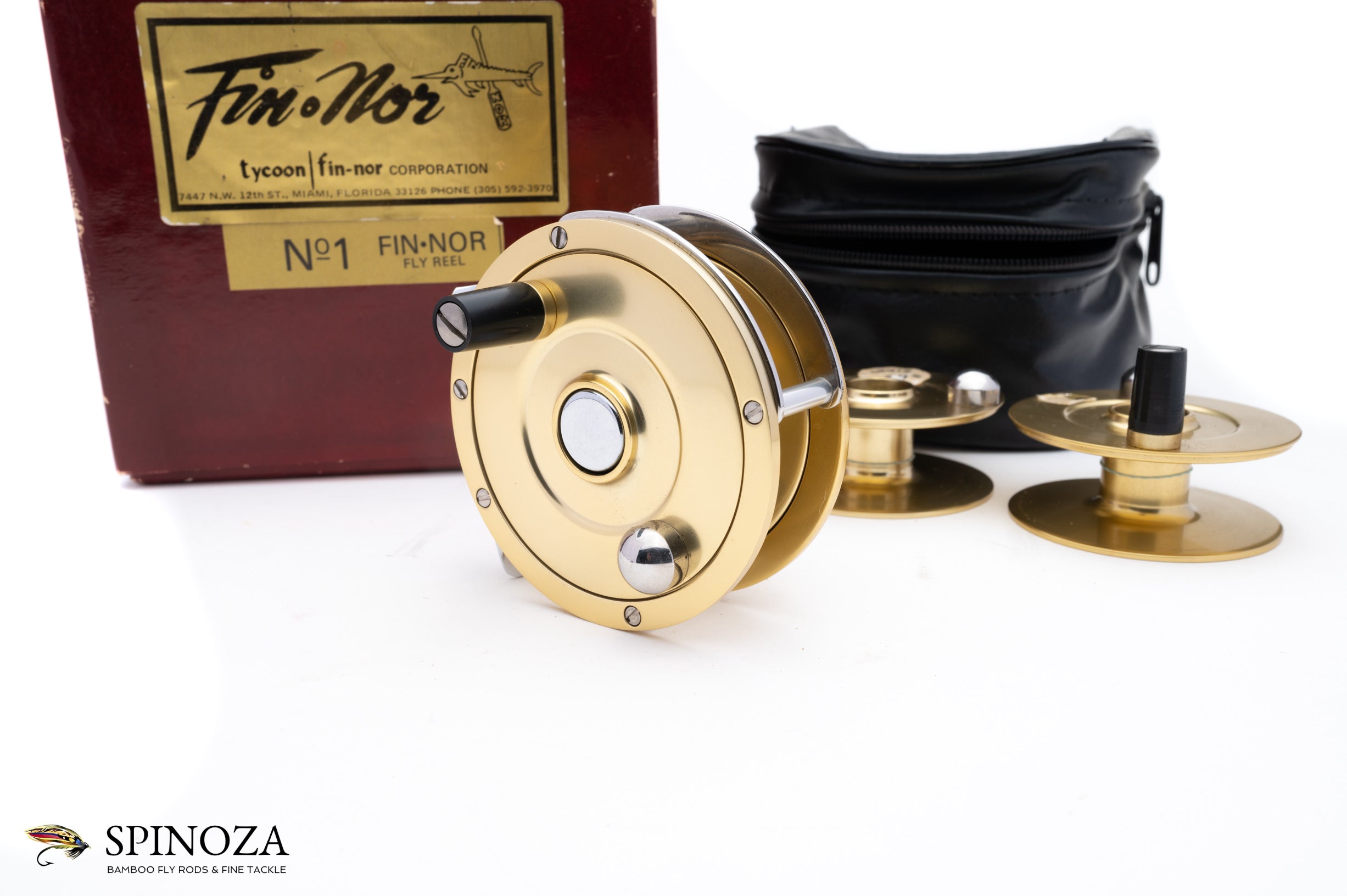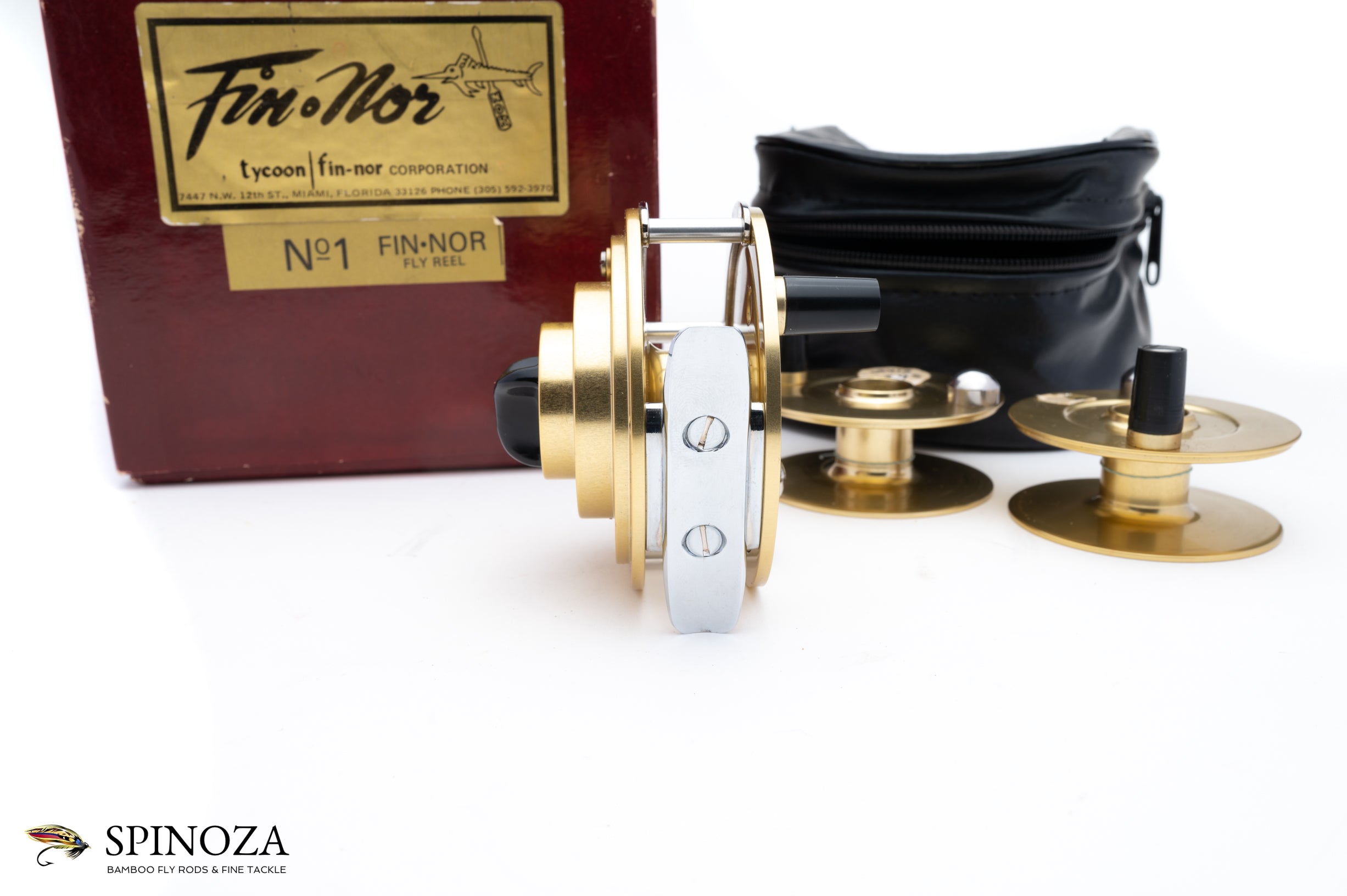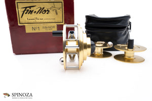 A very nice Fin-Nor Wedding Cake #1 fly reel with two spare spools, and set up for RHW. The reel appears to be in mint condition, I can find no sign that it has been used. The spare spools may have been lightly used but are in near mint condition themselves. Gold anodizing with the famous stacked wedding cake design. Serial #549. These #1 Wedding Cakes are very hard to find as I believe no more than 600 were ever made. Further, this reel comes in the original black Fin-Nor pouch and box with paperwork (the spare spools pack into non-original green neoprene pouches). A very nice package here for anyone who loves classic saltwater reels.