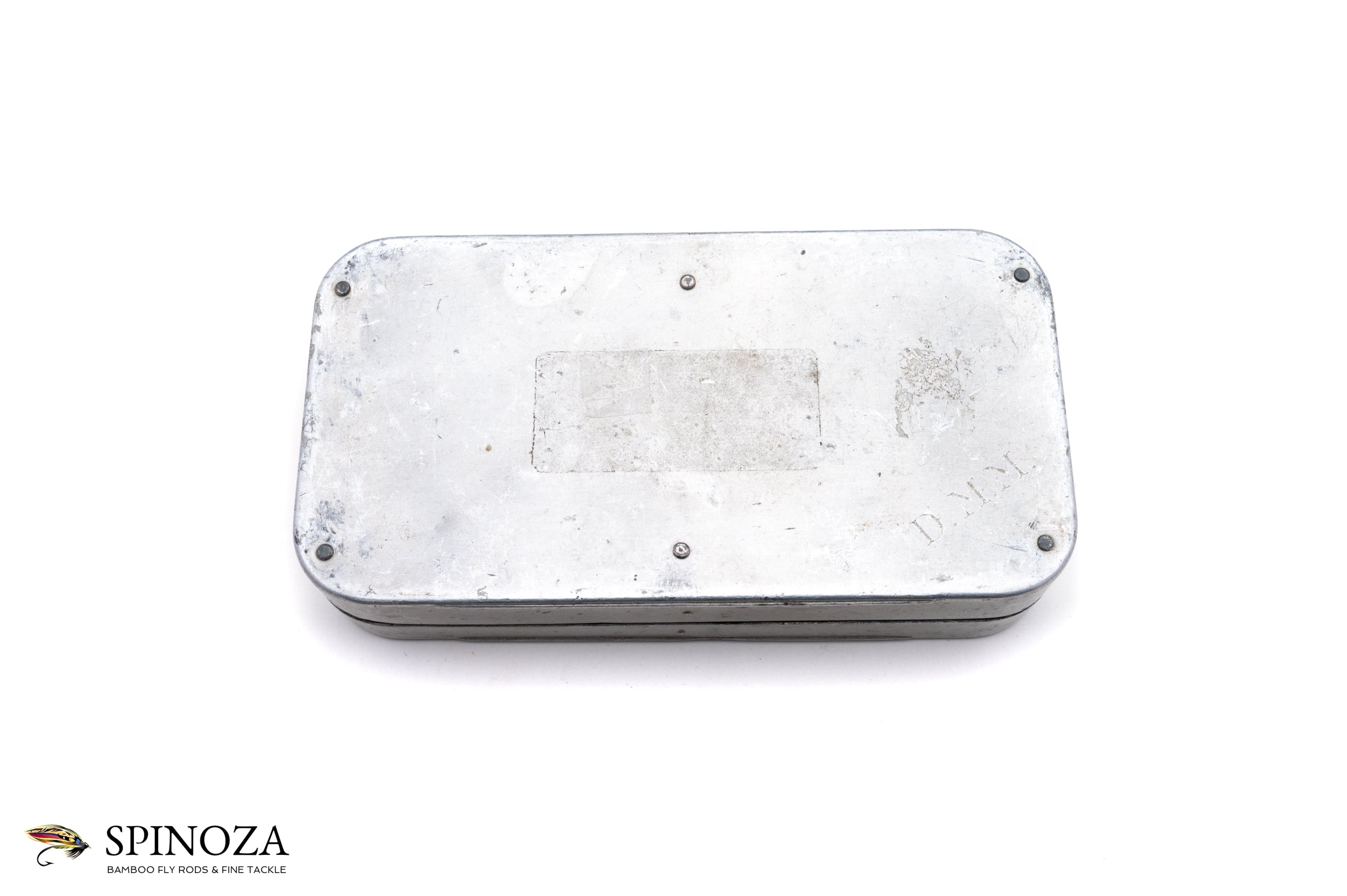 A large swing leaf aluminum salmon fly box loaded with approximately 28 early featherwing salmon flies. Good used condition with a little bit of oxidation/rust here and there but nothing particularly significant. The swing leaf works well. The box measures 8" x 1.5" x 4.25". A very small "Made in England" mark is stamped into one edge of the box and the initials "DMM" have been professionally engraved in one corner of the top.