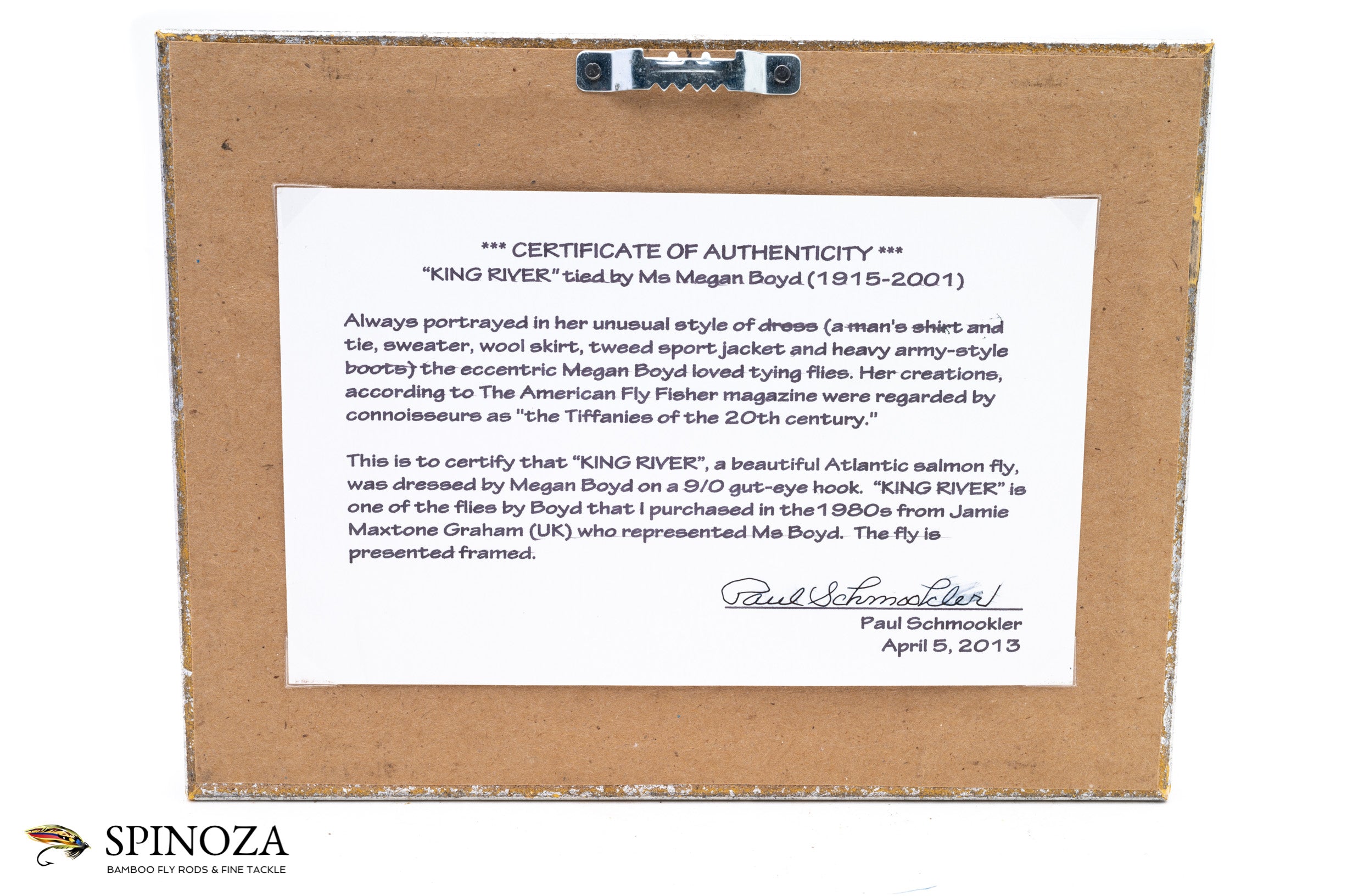An excellent framed salmon fly by the legendary Scottish tyer Megan Boyd, entitled "King River" and tied on a 9/0 gut-eye hook. Framed in a 8" x 6" shadowbox. There is a note of provenance on the back of the box from Paul Schmookler who purchased this fly in the 1980's from Jamie Maxtone Graham, one of Boyd's representatives in the United Kingdom.