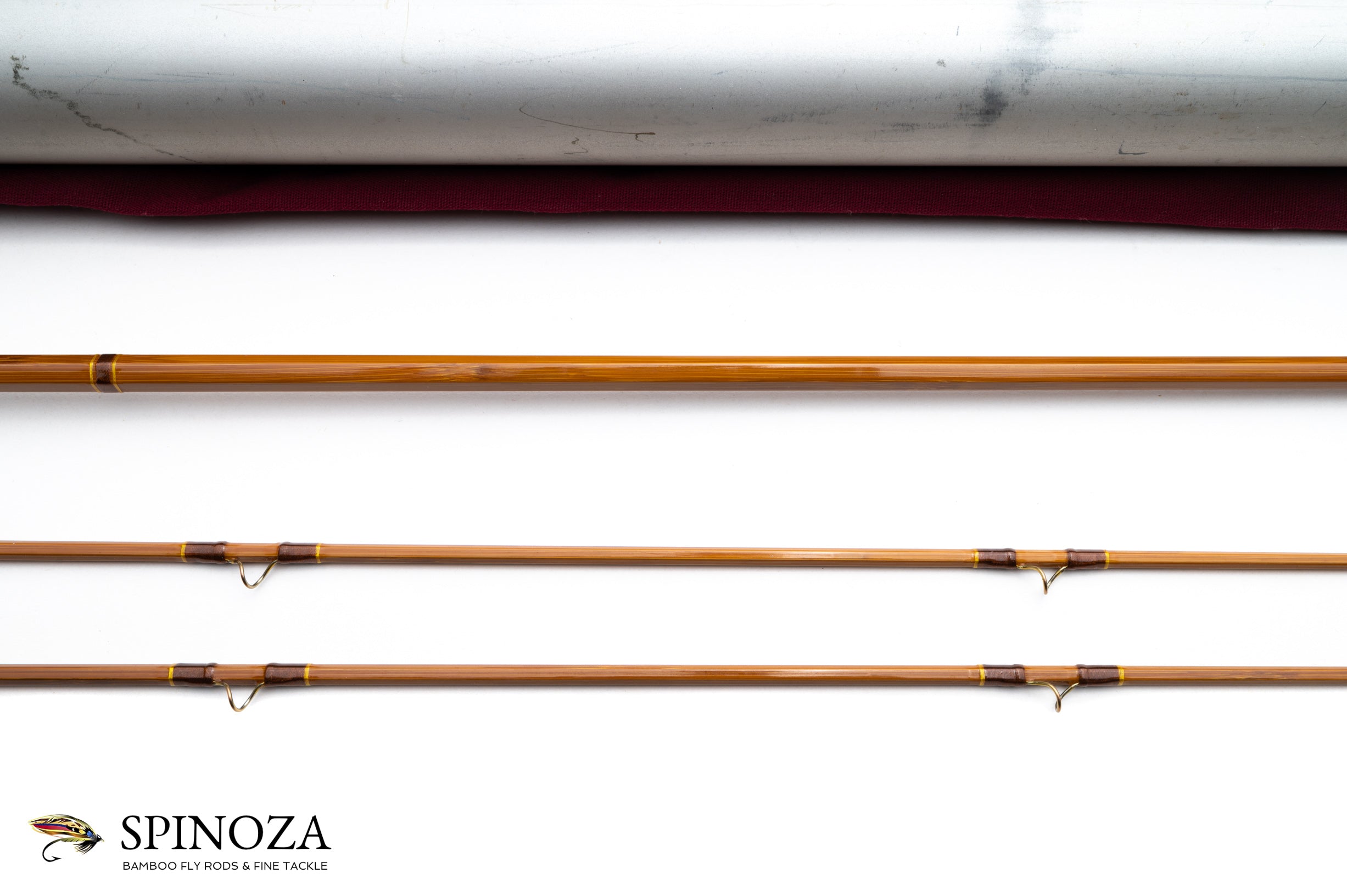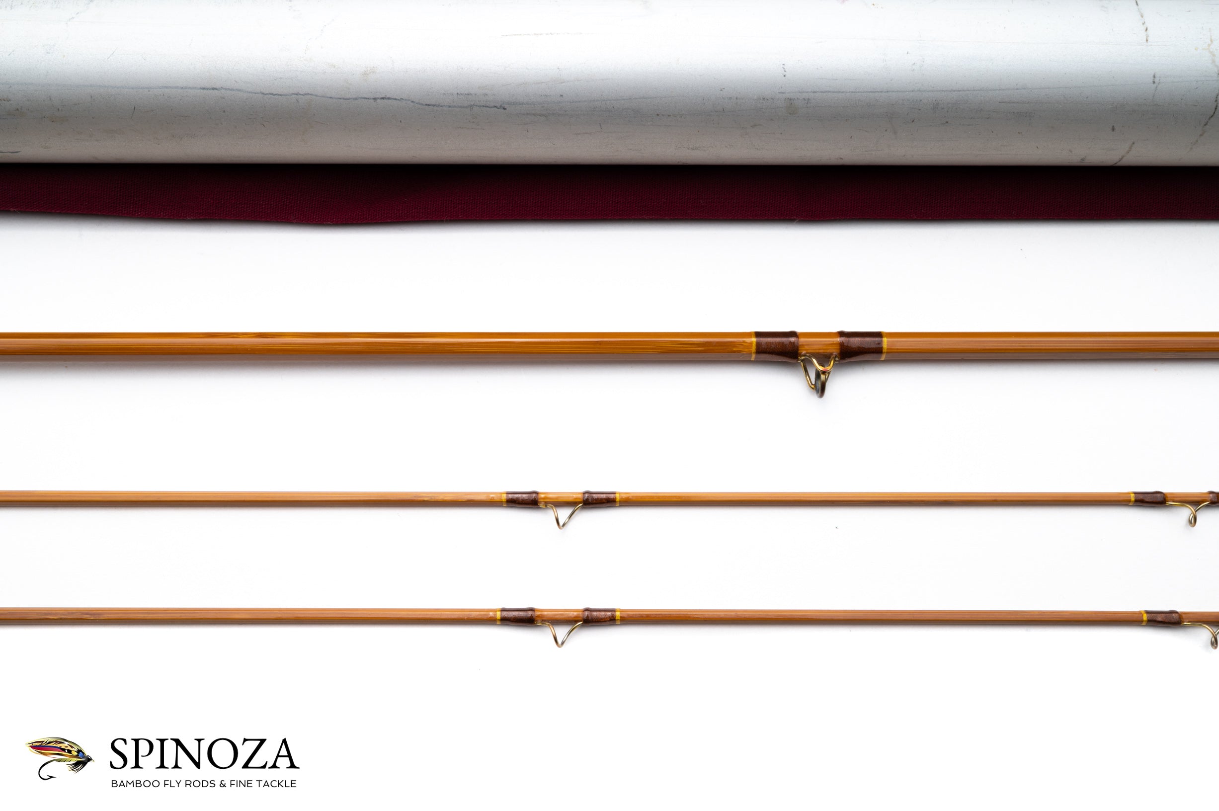 A nice Gary Howells bamboo fly rod, 7'6", 2-piece, 2-tip, and built for a #3 or #4 line. Serial #5321. The rod weighs 3.3 ounces on my scale. Lightly used condition with everything as it should be with one exception, which is that the top snake guide on one tip is slightly bent out of shape but seems well attached so I think the rod should perform just fine (I also spoke with Robert Bolt, and he is happy to repair this should the new owner wish). Medium to slow action. Oven tempered cane done in a two opposed pattern. Brown wraps with yellow edges at all guides and ferrules. #8 SRMC carbide stripper and chrome guides and tip tops. The ferrule fits are good and the rod is straight. Excellent varnish. The grip is 6" long and shaped to a western profile with a hidden pocket cap and the reel seat is an aluminum uplocking screwlock. The rod packs into a maroon bag and standard Howells tube with the data sticker affixed.