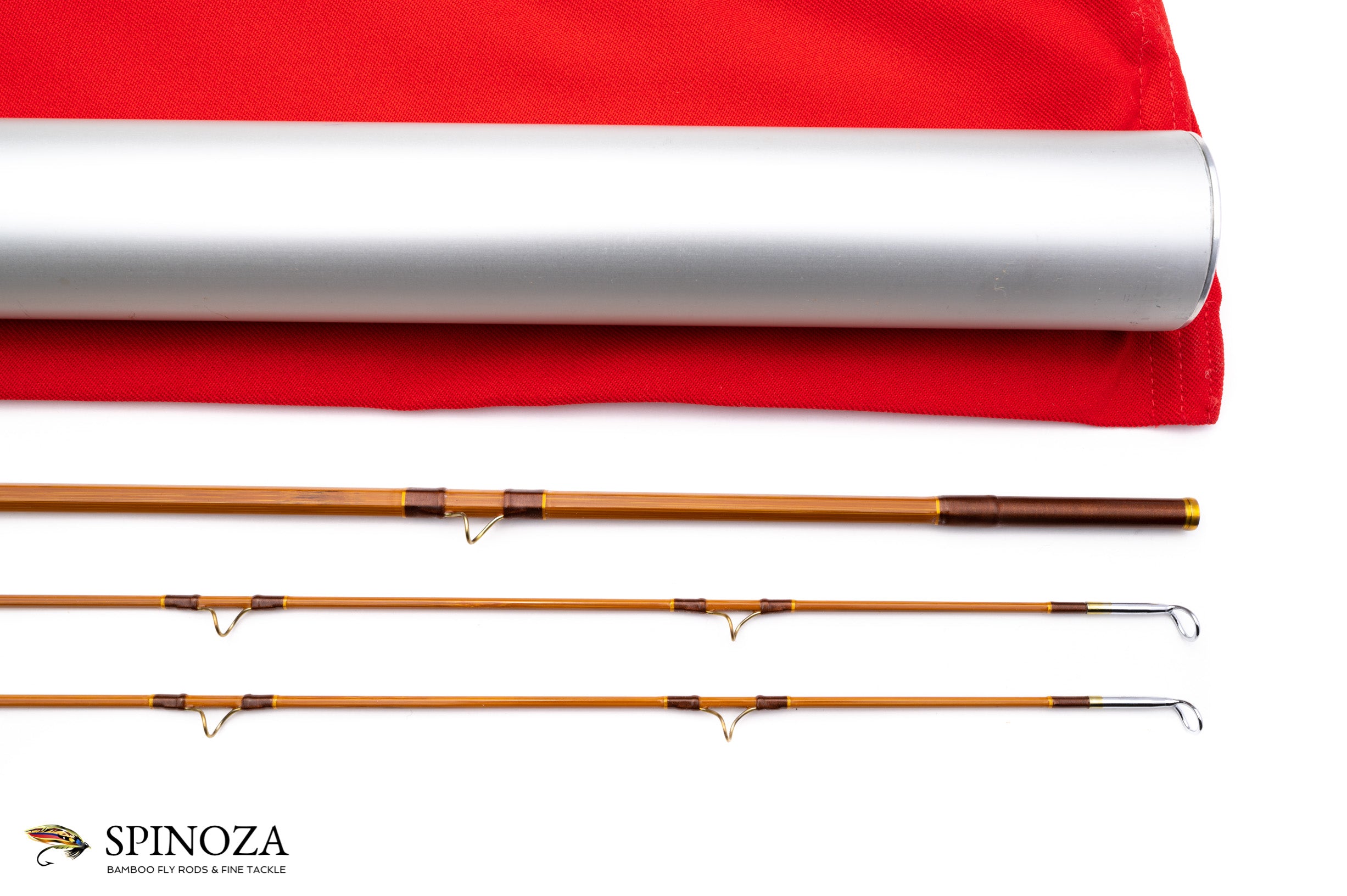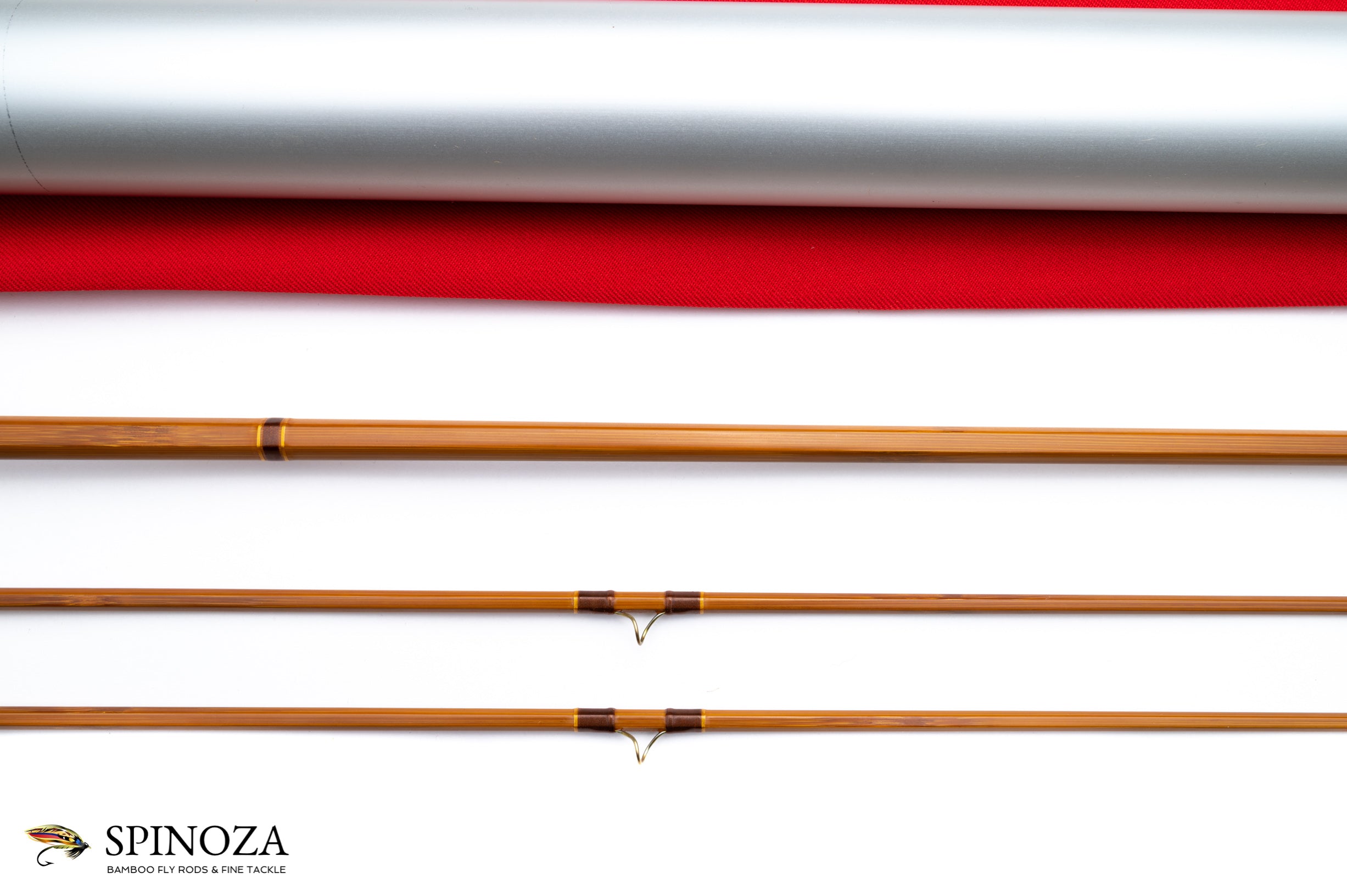 A very nice Gary Howells bamboo fly rod, 8', 2-pieces, 2-tips, built for a #6 line. Serial #4650 with a build date of December 1980. 4.4 ounces. Mint unused condition, with the plastic still on the grip. Medium fast action, and it has always felt to me like many of the Howells 6-weight rods are quicker than the #4's and #5's. Oven tempered cane that is dark wheat straw in color and done in a three up node pattern configuration. Carbide stripper and chrome snake guides. The main wraps are brown with gold-yellow edges and one purple-red band at the keeper. Superb varnish. The grip is 6" long and shaped to a western style grip. As mentioned, both paper and plastic are still on the grip. Nicely varnished Zebra wood spacer and an aluminum uplocking screwlock. Comes in the original red cloth bag and the aluminum tube, which are in perfect condition. The Howells data sticker is on the tube and intact. This rod is 41 years old but looks as though it was shipped from the shop yesterday!
