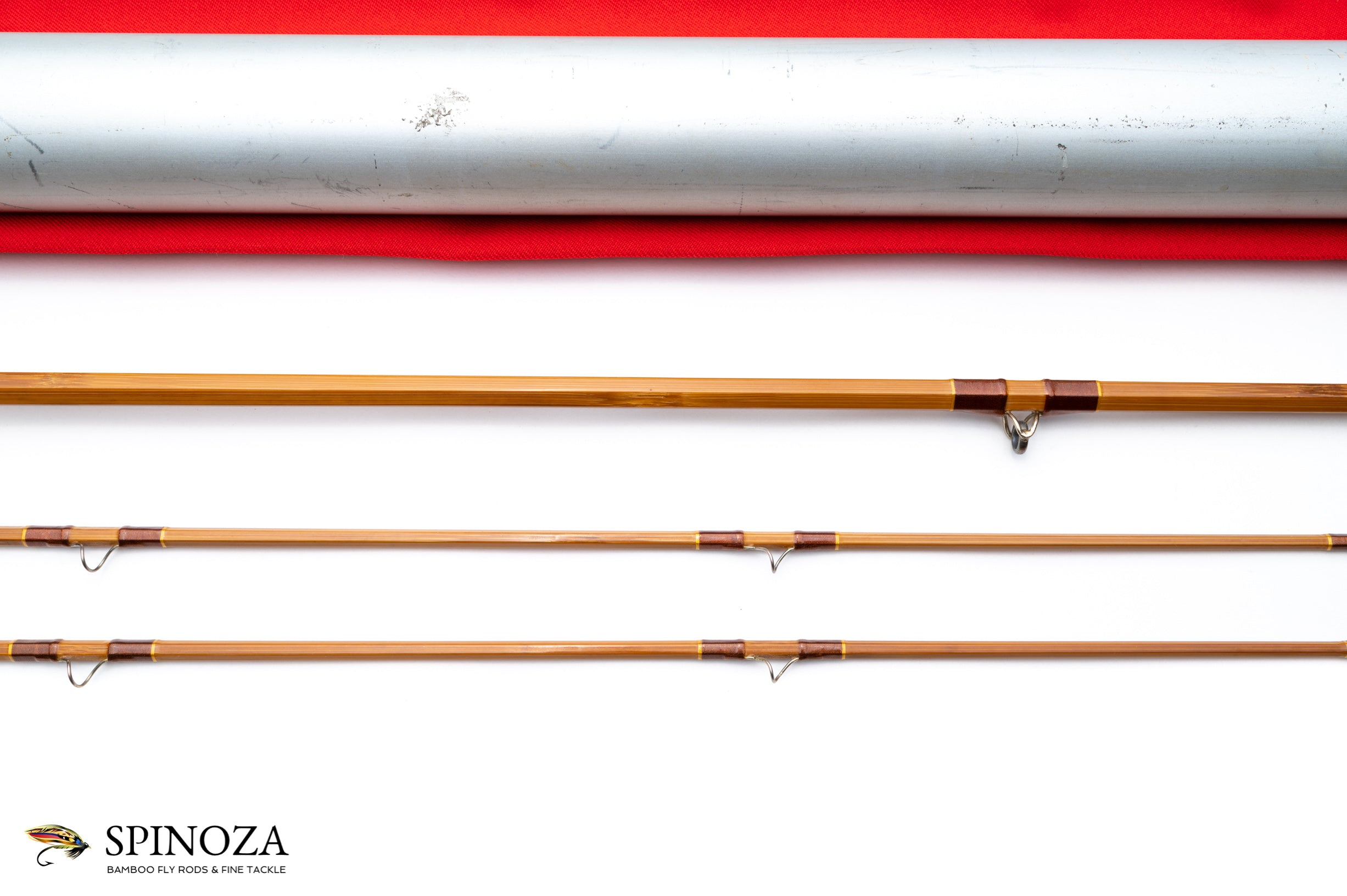 A very nice Gary Howells fly rod, 8'6", 2-piece, 2 tips, built for a #6 line. "G. H. Howells" and "8 1/2' 4 1/4 oz #4517" lettered on the shaft. The serial number denotes a 1979 manufacture date. Medium full flexing action. Near mint condition with some light soiling to the grip and a few faint marks on the reel seat. The ferrule fits are good and the tips have a very mild right handed set, easily corrected. Medium wheatstraw colored cane and the nodes are distributed in a three up node pattern. The varnish is excellent. The wraps are the usual Howells brown with yellow tipping and the ferrules have the Winston-inspired overwrap, also in brown. Chrome tip tops. The grip is 12 corks long and 6" in length, done in a half wells profile. The reel seat is an aluminum uplocking slide band with a pocket cap, done over Gary's trademark zebrawood spacer. The rod packs in a bright orange cloth bag and the original aluminum tube with brass hardware and the Howells data sticker intact.