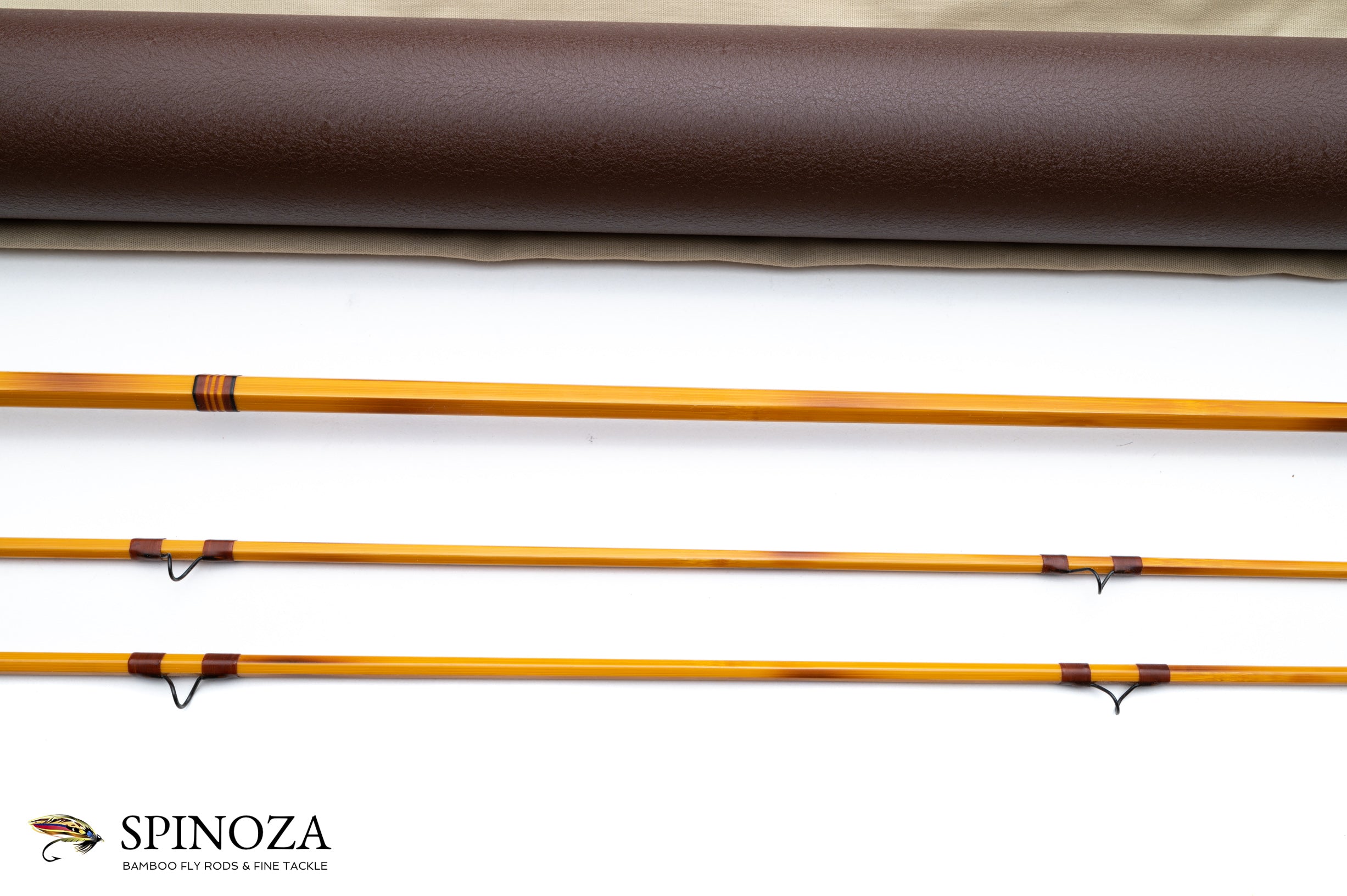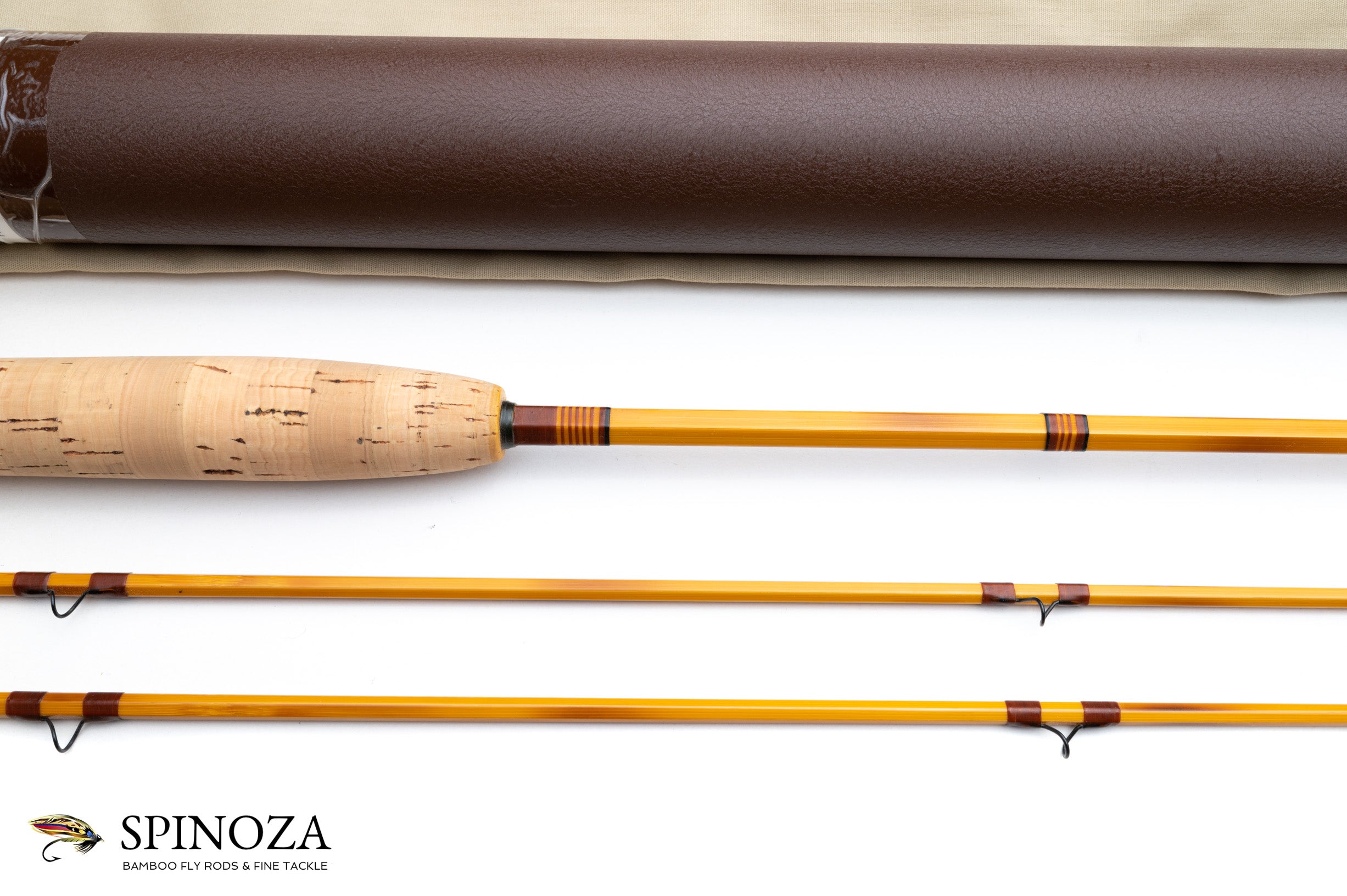 A nice George Maurer Sweetwater Starlight Special bamboo fly rod, 7'6", 2-piece, 2-tip, and built for a #4 or #5. Serial #003. Mint condition. Fast action. Very light flame blond color cane in a three up node pattern. The main wraps are brown with black edges at the keeper and ferrules. Oxidized swiss-style ferrules. Carbide stripper and black snake guides. The grip is 6" long and turned to a large western profile. The reel seat is a commercial cap and ring with a mortised, stabilized west coast maple burl. Oxidized hardware. The rod bag has a stiffener and a "Sweetwater Rods" label sewn on. The aluminum tube is brown crackle painted with a brass collar, top, and bottom.