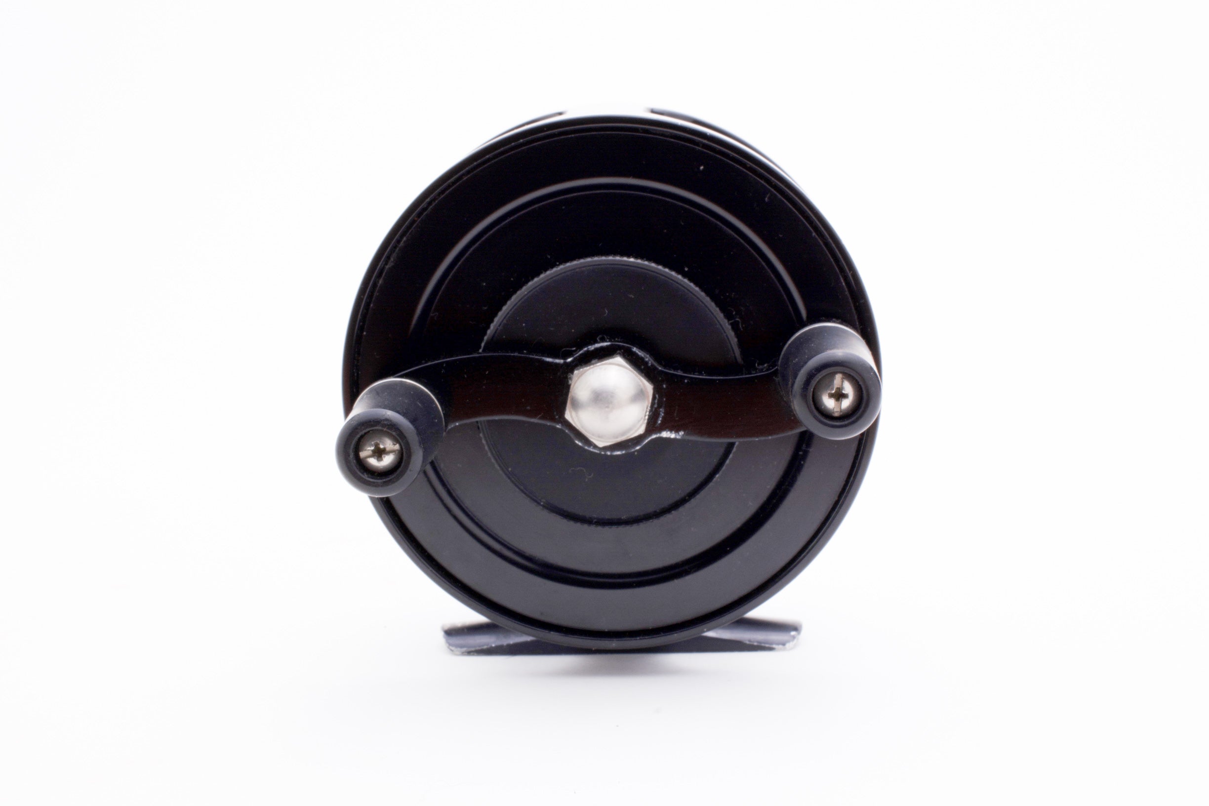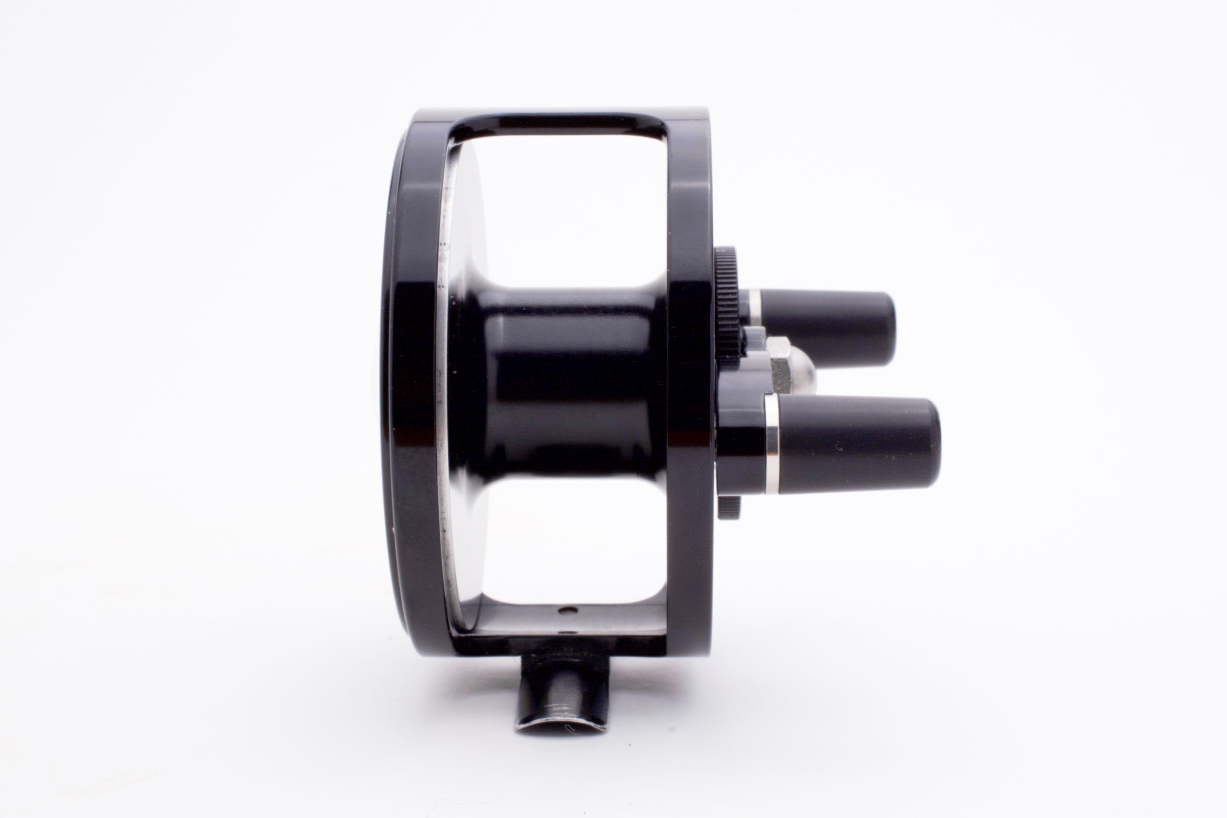A nice saltwater reel here that I have not seen before, a virtual copy of a Seamaster's anti-reverse reel built by Hans Wurm from whom the owner purchased this reel directly. 3 1/4" diameter. The reel is all black save for the nut on the crank and the center circle on the face plate. There are no other marks or signs on it of any sort. It is RHW with a satisfying click on the inbound crank. Decent overall condition with some normal wear on the frame and more moderate wear on the foot and around the nut that holds the crank handle on. No bag.