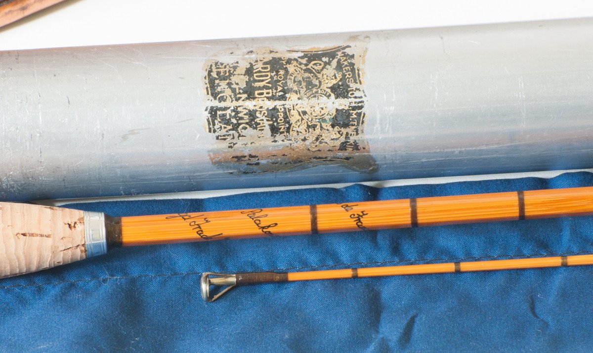For sale here is a Hardy CC DeFrance bamboo fly rod made in 1956. 6'6" two sections with one tip, as was typical with the CC DeFrance rods. Serial H9646. Blonde cane, reverse twist snake guides, agate stripper, oxidized brass ferrules, small cigar grip, bright aluminum cap and ring, dark brown silks with full intermediates. The rod is in excellent original condition. Fast action. All sections are full-length and straight. The tip is shorter than the butt (these rods were made that way). Comes with its original labeled tube and a replacement bag.
