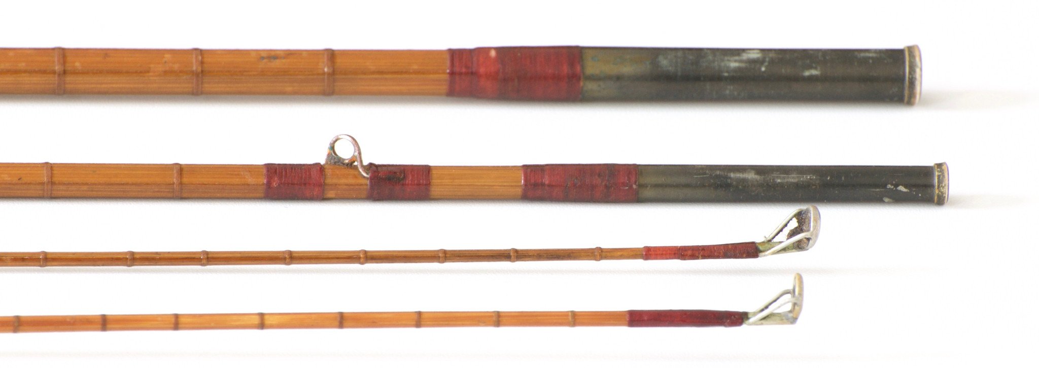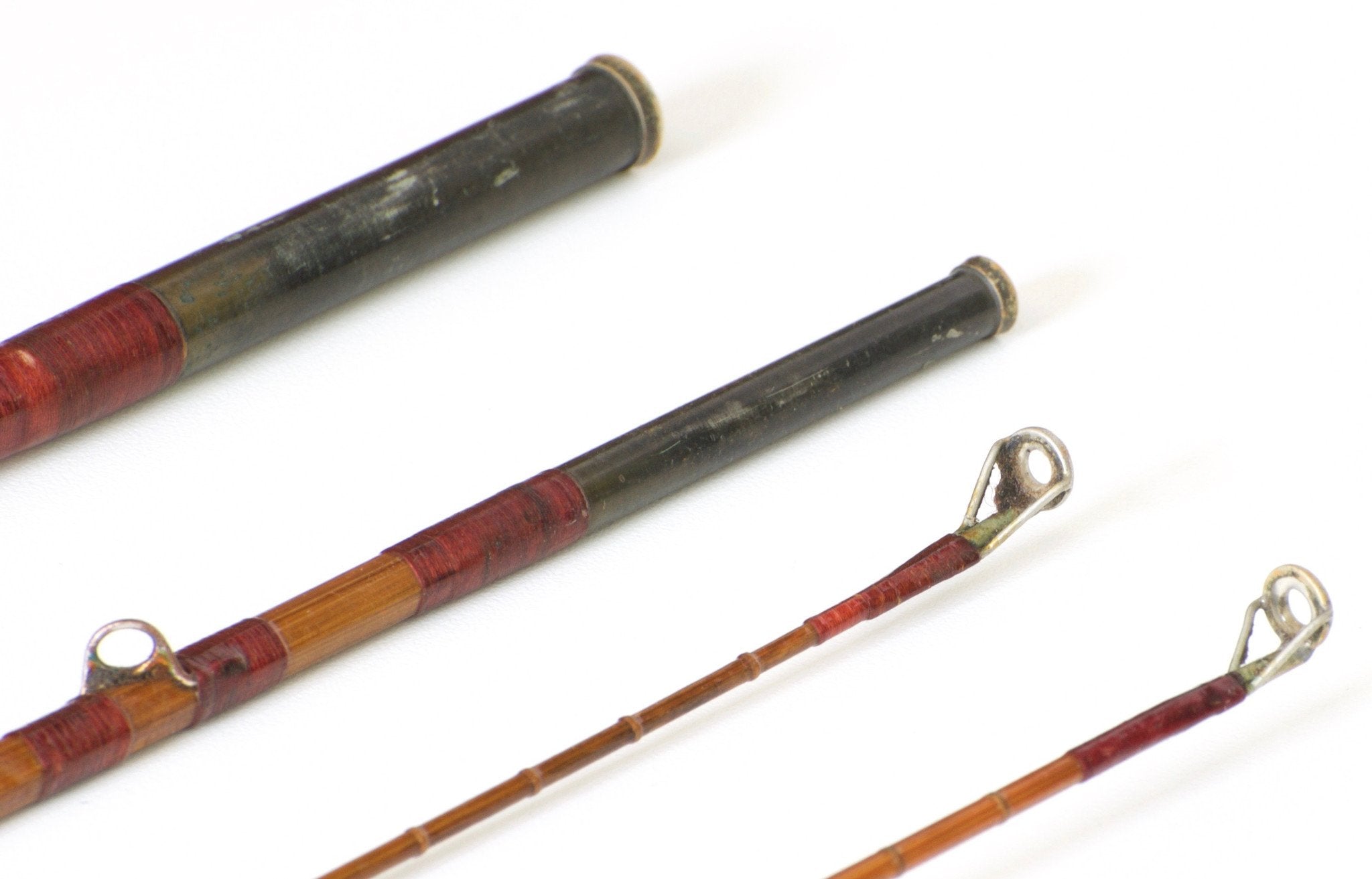 For sale here is a Hardy Bros. Palakona 9'6" 3/2 bamboo rod. The rod has seen better days and is an excellent candidate for a complete restoration. The serial number C11738 dates this rod to 1921. The cork and reel seat remain in very good condition and would not need to be replaced. There is some slight delamination on the butt section near the cork. There is a guide missing on the mid section. The two tips are both in need of repair. The first tip is 1 3/4" short and the second tip has been broken off at the ferrule, and at some point the ferrule portion was lost leaving the tip only. Both of the red agate tip-tops remain. Red agate stripping guide. Brass ferrules fit together nicely and pop when pulled apart. Reverse English guides. Sliding band reel seat over cork. A classic medium wet fly action for a 5 or 6wt line. Ferrule sizes 17/64 and 11/64. Rod weighs 4.85 oz. The rod comes with original rod bag, original rod tube made of a hollowed culm of bamboo as well as the Hardy cover with label.
