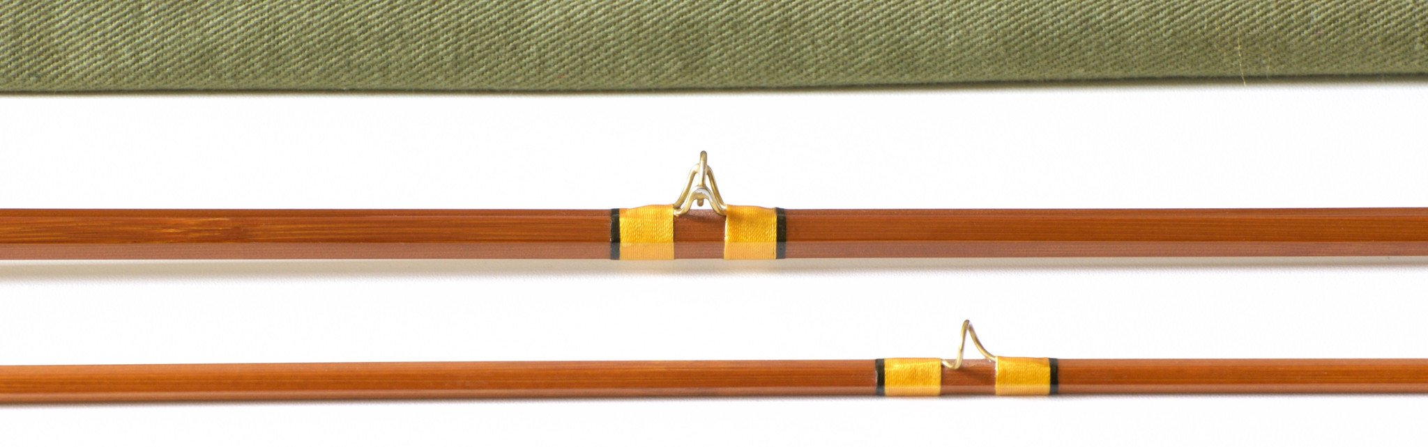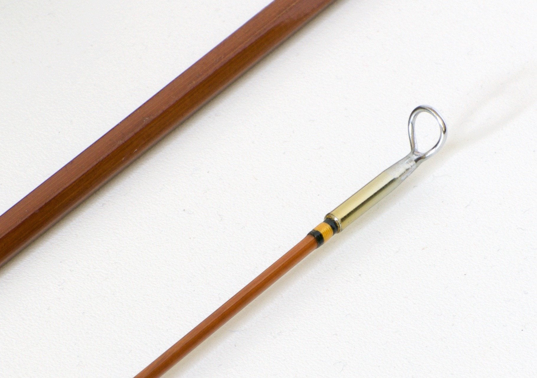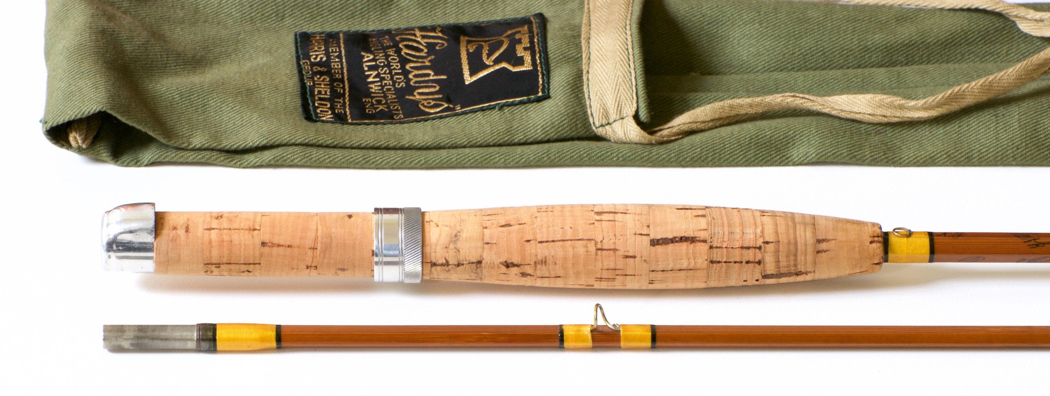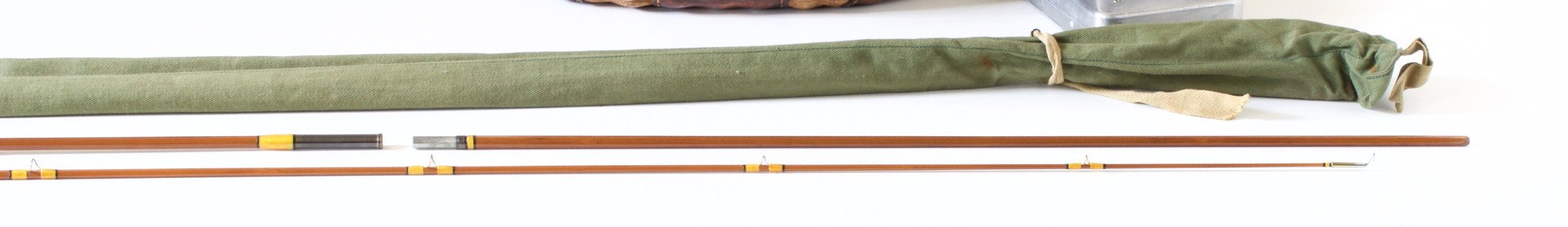 For sale here is a Hardy "Riccardi" Palakona bamboo rod - staggered ferrule construction. Seven feet, two sections with one tip. The rod is completely original and in excellent condition. Both sections are full-length and straight. Striking yellow silks with black tips. Aluminum cap and slide band over an all-cork reel seat. Serial number K/J which dates the rod to October 1968. The rod weighs 3 1/2 oz. Fast action rod made for casting in slightly tight quarters and fighting/landing big fish!