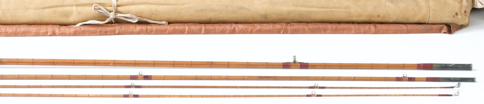 For sale here is a scarce Hardy Palakona "The Deluxe Rod". Serial number E19898 made in 1930. Nine feet six inches, three sections with two tips. The rod is completely original and in good condition with a few issues. The varnish is beginning to sag and crack in places, a good polishing could help with this. There is a fishing set in one of the tips. All wraps are secure. Burgundy silks with full brown intermediates. Agate stripper and tip-tops. Unique guides that look like a cross between snake guides and spinning guides. Uplocking aluminum reel seat over bakelite. The grip is soiled and a chip is missing over the reel seat hood. Medium action for a 6wt line. Ferrule sizes 18/64 and 12/64 and the fit is very nice. Rod weighs 6 1/8 oz. Comes with its original Hardy bag and tube with Hardy tube cover. The rod could use a bit of work but overall it is a great example of a Hardy rod from this period.